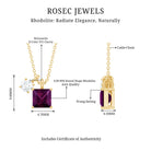A timeless piece that honors your birth month in the most beautiful way. Designed with a modern yet meaningful look, the Necklace with Charm features a beautiful 6 MM Princess Cut Rhodolite paired with a 4 MM Round Moissanite, both securely set in prong setting that lets the stones shine from every angle. It is like two different souls complementing each other perfectly. This makes the Rhodolite Garnet Necklace a thoughtful gift for someone special or a lovely treat for yourself. The June Birthstone Necklace gracefully dangles from a durable cable chain, finished with a lobster clasp that allows for easy length adjustment to suit your style. The entire piece is crafted from 14k yellow gold plated silver, giving it that rich golden glow while remaining lightweight and comfortable for everyday wear. With its charming two-stone design, this Princess Cut Necklace is perfect for birthdays, anniversaries, or simply marking a new chapter in life. The Rhodolite represents passion and strength, while Moissanite brings brilliance and clarity, a perfect pair to wear close to your heart. Packaged in a premium jewelry box and accompanied by a certificate of authenticity, this Two Stone Necklace is ready to gift or keep as a timeless addition to your jewelry collection.