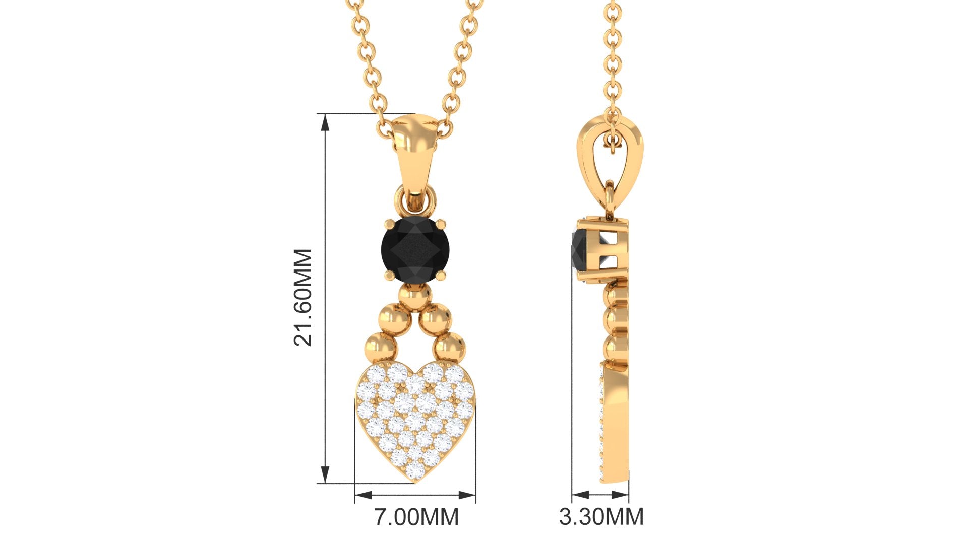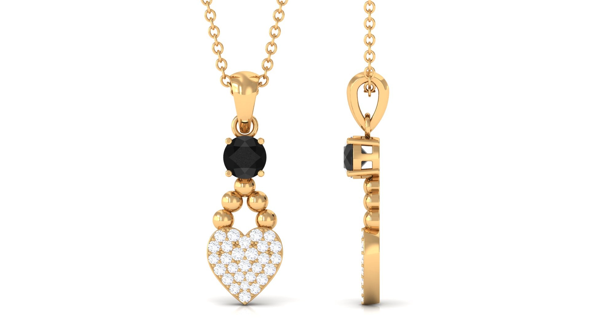 Prepare to be enchanted by the shimmering beauty of this heart-drop pendant. The glimmer metal heart frame is adorned with intricate beaded detailing, adding a touch of elegance and sophistication. A round black diamond gemstone is securely held at its center in a 4-prong setting, radiating its mesmerizing black hues. The heart frame is meticulously set with round diamonds, creating a stunning display of sparkle and brilliance. The drop pendant is elegantly secured with a shiny metal bale, completing the overall design with a seamless finish. Embrace this exquisite pendant aesthetic pleasure and allure, a true testament to timeless elegance and beauty.