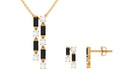 Make a statement with this beautiful Dangle Necklace and Earrings Set, featuring Baguette Cut Black Onyx in a bar setting and round Diamond stones. The intricate design and exquisite craftsmanship of this jewelry set create a stunning contrast, making it a standout piece of jewelry. This Black Onyx necklace set is perfect for adding a touch of luxury to any outfit or special occasion.