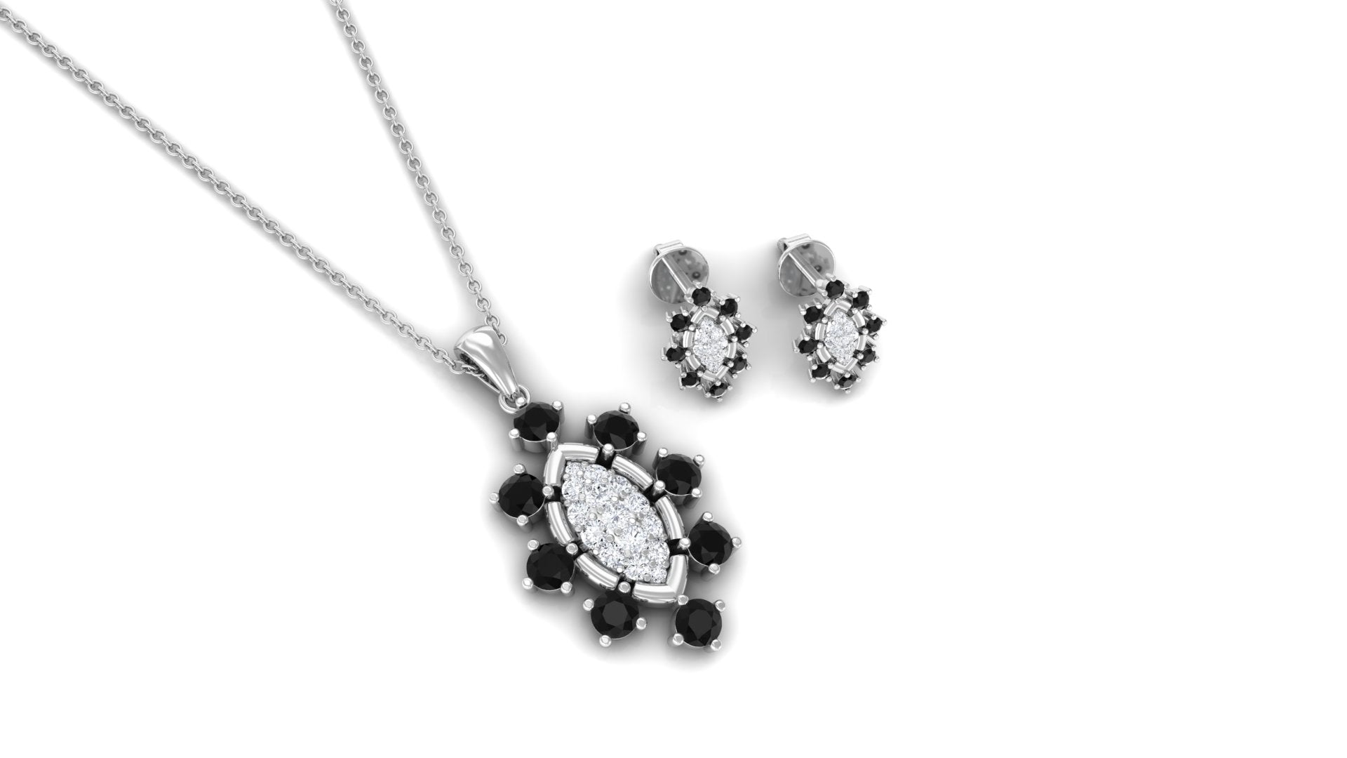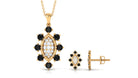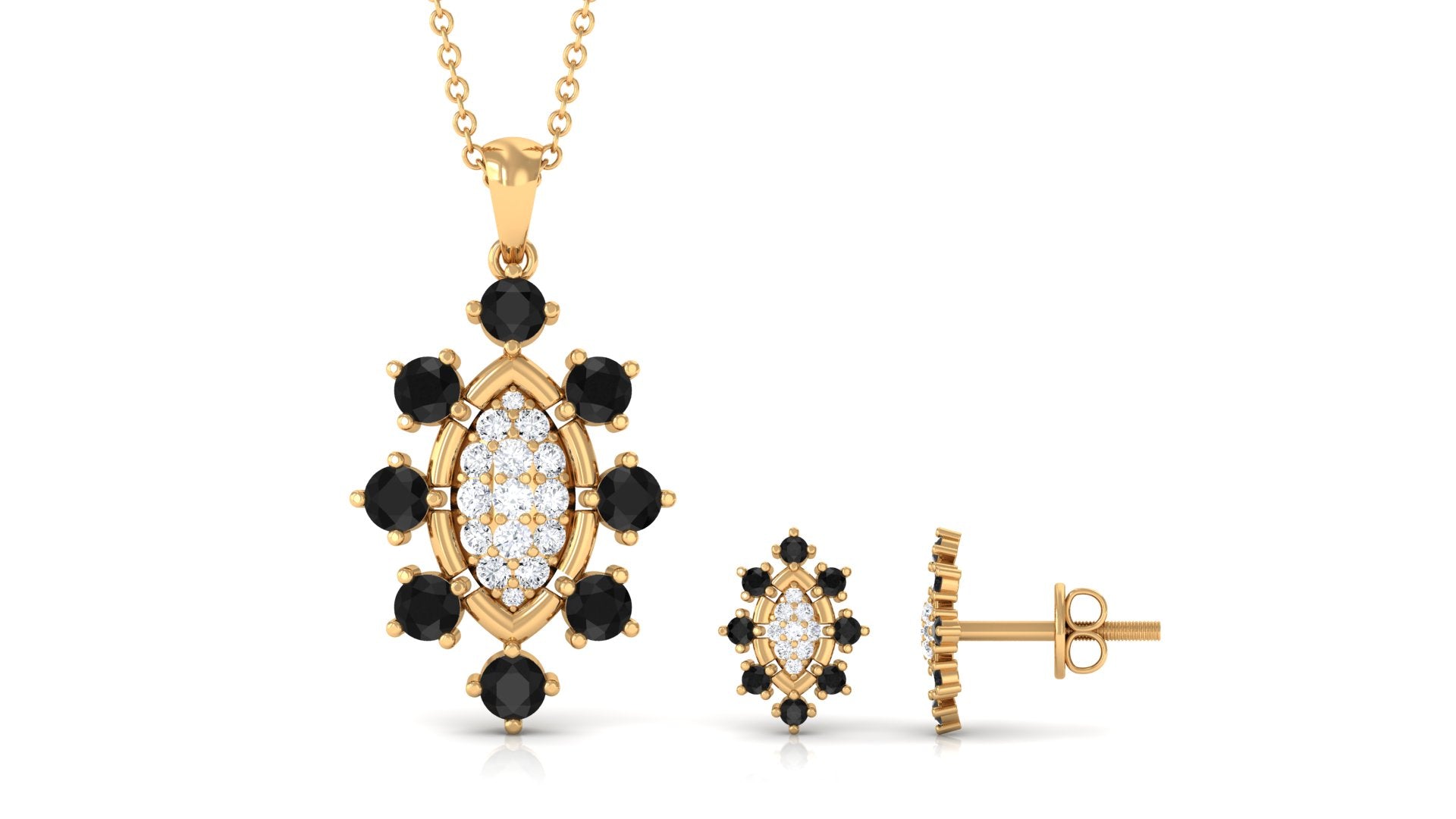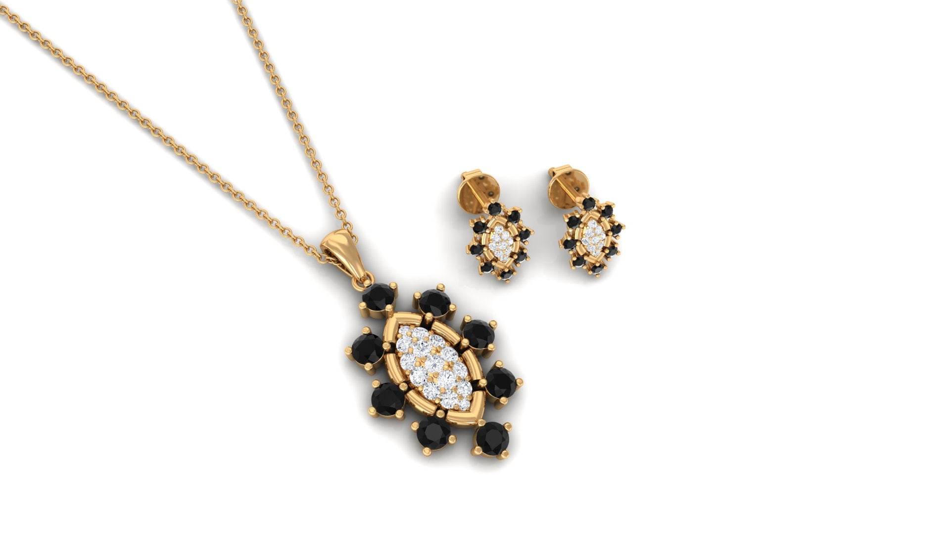 Crafted with elegance, this Statement Pendant and Earrings Set is bejeweled with Round Shape Black Onyx in Prong Setting and Round Shape Diamonds over a unique design. Get this Black Onyx Pendant and Earring Set for your special person as a Birthday Gift or an Anniversary Gift.