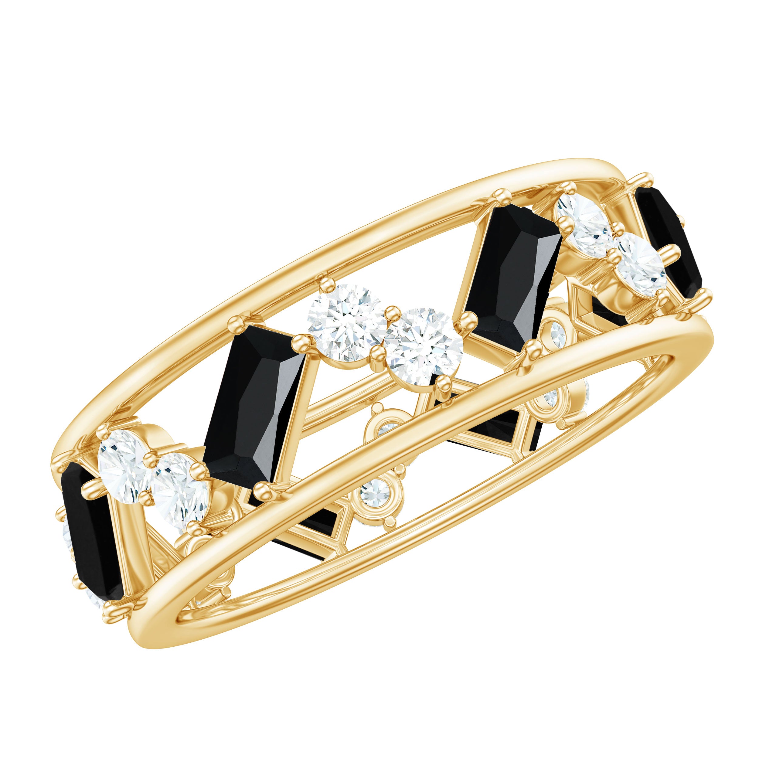 Meet your new favorite piece - a Black Onyx Eternity Band that is all about bold vibes with a romantic twist. Designed with a wide band and a bold zig-zag layout, this Onyx and Diamond Ring is made for those who love jewelry with personality. Whether you are celebrating an anniversary, saying your big YES, or just want something seriously stunning, this Black and White Wedding Band brings all the needed sparkle. It features baguette cut black onyx stones and round cut diamonds, set alternatively in a zig-zag pattern that wraps all the way around your finger. Each stone is held securely in prong setting, so you get the perfect mix of style and stability. The contrast between the deep black onyx and the bright white diamonds gives the ring a designer look, without trying too hard. It is modern, it is artistic, and honestly, it looks amazing from every angle. Perfect as a wedding band, anniversary gift, or a bold statement piece to wear on its own, this eternity ring is built to be admired. You can stack it, flaunt it solo, or pair it with your favorite outfit, it will do the work every time. For the ones who do not follow the crowd, this Wide Wedding Band is for you.