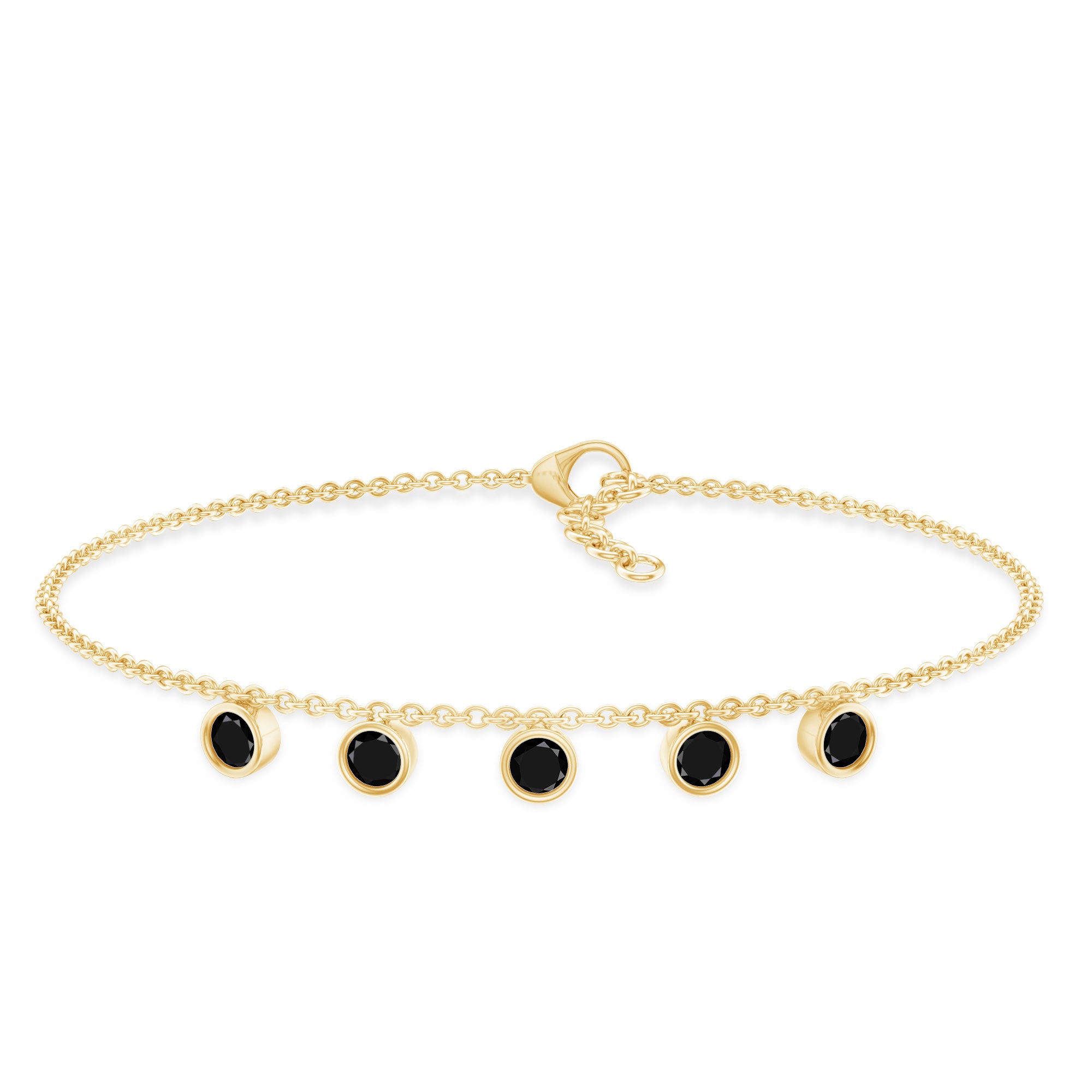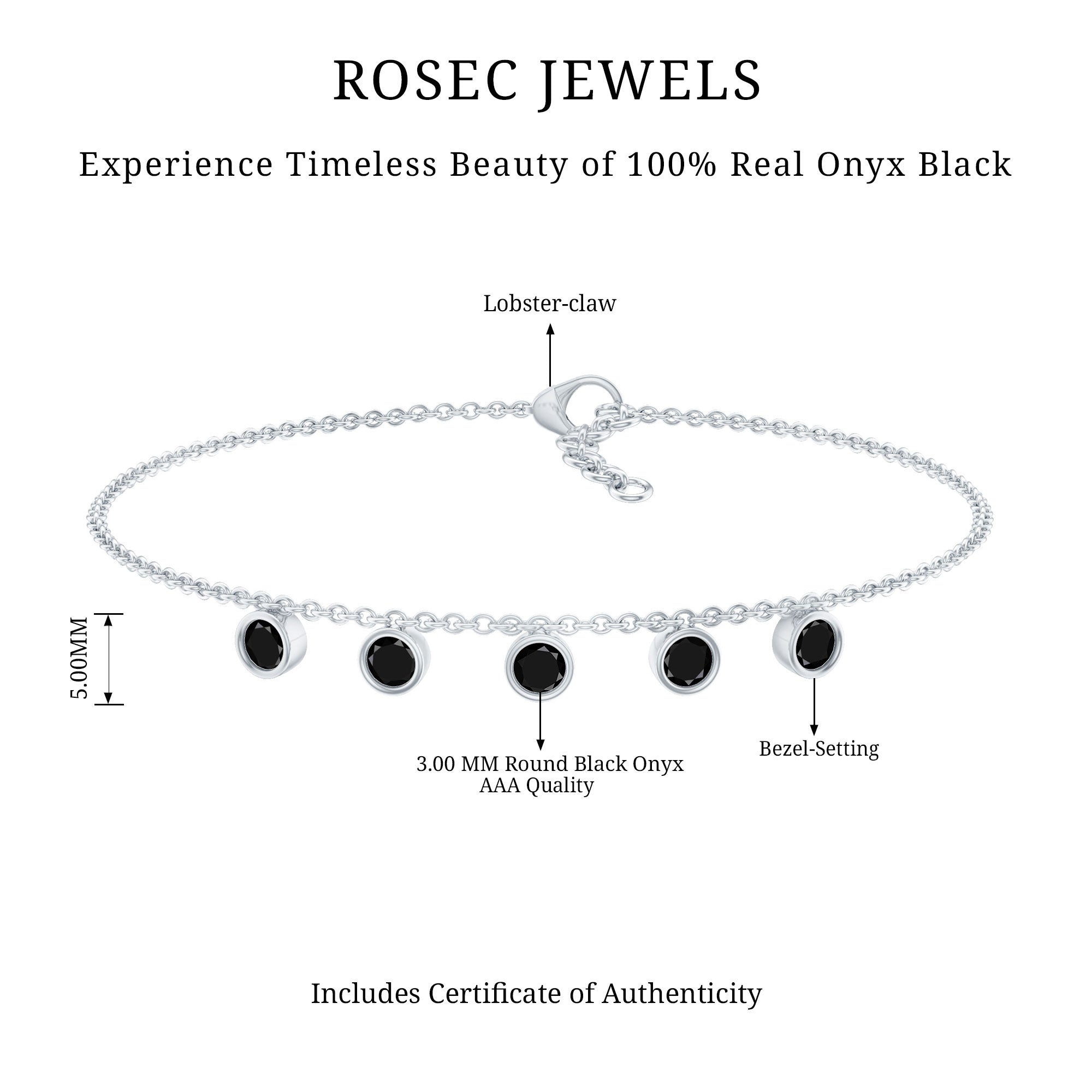 Elevate the elegance of your wrist with this minimalist Black Onyx Bracelet. This exquisite accessory features 3 mm round Black Onyx gemstones meticulously arranged along a delicate chain in a bezel setting, creating a subtle yet captivating sparkle. The Lobster Claw Closure ensures a secure fit, making this Chain Bracelet an ideal for everyday wear or special occasions. Rosec Jewels is dedicated to timeless beauty and ethical sourcing, making this Stackable Bracelet a perfect blend of luxury and responsibility. Designed with versatility in mind, this Minimal Chain Bracelet can be worn alone or layered with other pieces for a trendy, stacked look. Its classic design makes it a wonderful gift for her on any occasion—whether it be a birthday, anniversary, or simply a sincere gesture to convey your affection. Its brilliant sparkle is an attractive option for those seeking a refined enhancement that adds a touch of luxury without overpowering your appearance.