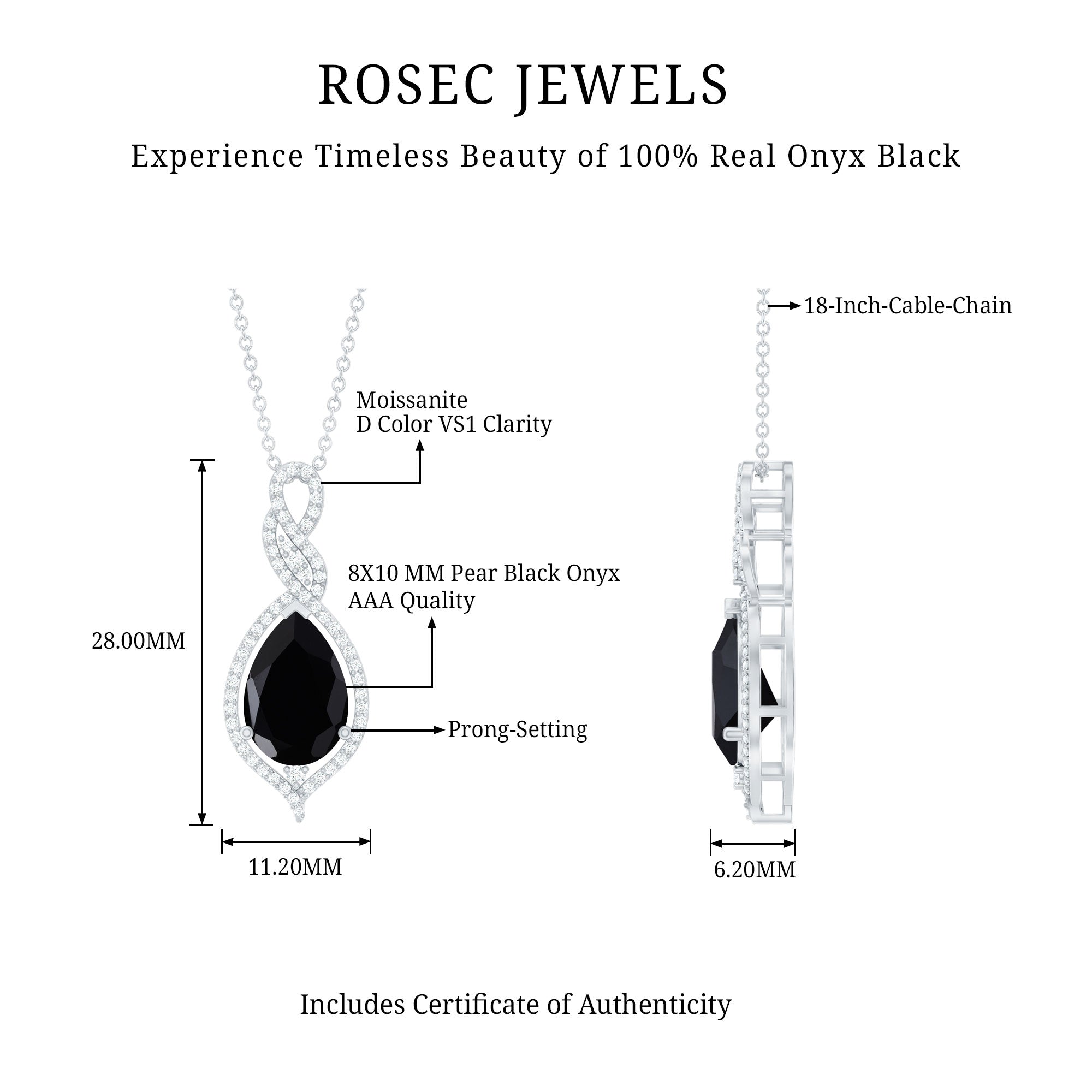 Indulge in the allure of the Teardrop Dangle Pendant, adorned with a captivating pear cut black onyx gemstone. Accentuated with exquisite moissanite stones, this pendant exudes a mesmerizing elegance. Suspended delicately, it becomes a stunning accessory, effortlessly adding a touch of sophistication and glamour to any ensemble.