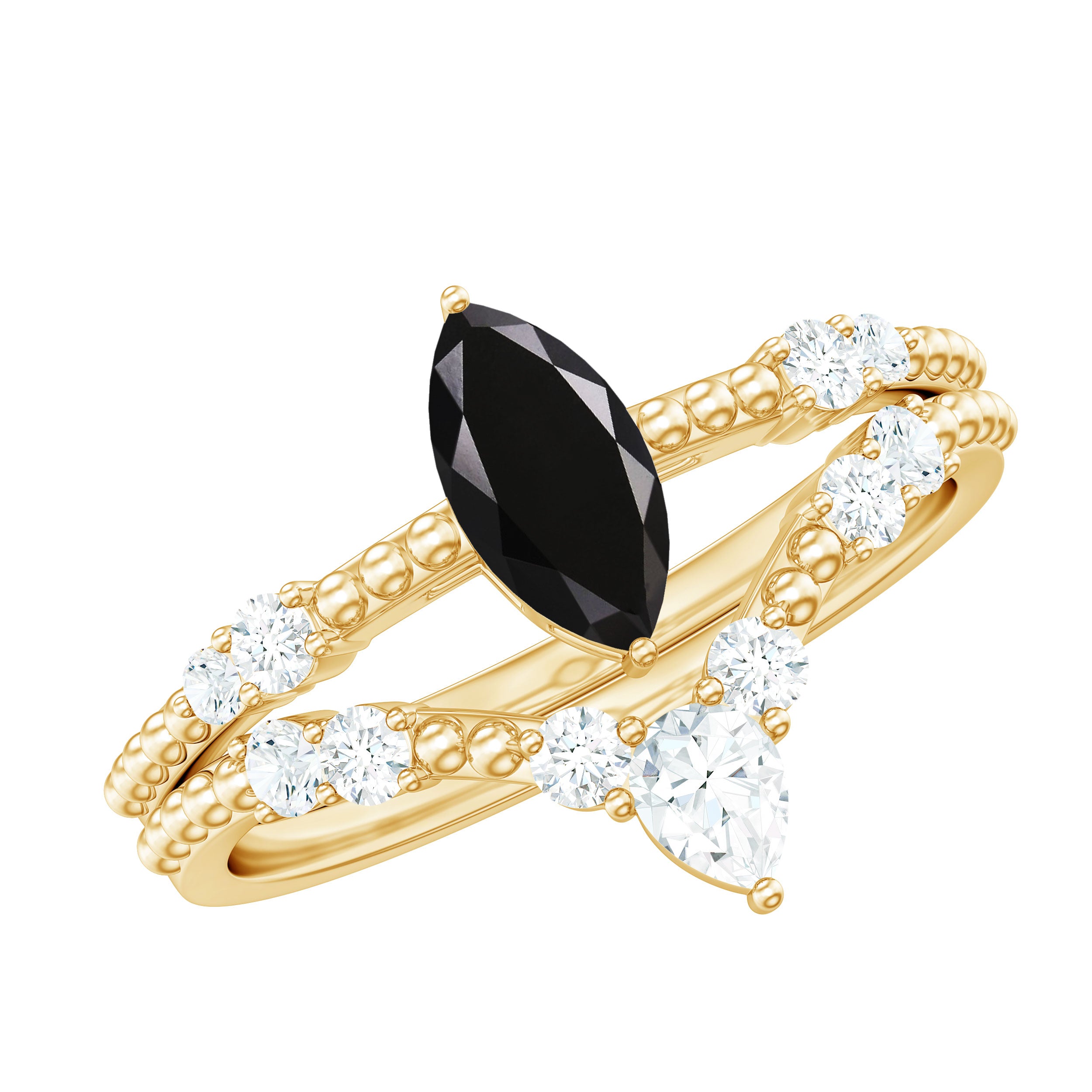 This exquisite Solitaire Ring Set has Marquise Shape Black Spinel in Prong Setting and Moissanite on the V Shape Band is an elegant piece for your D-day.