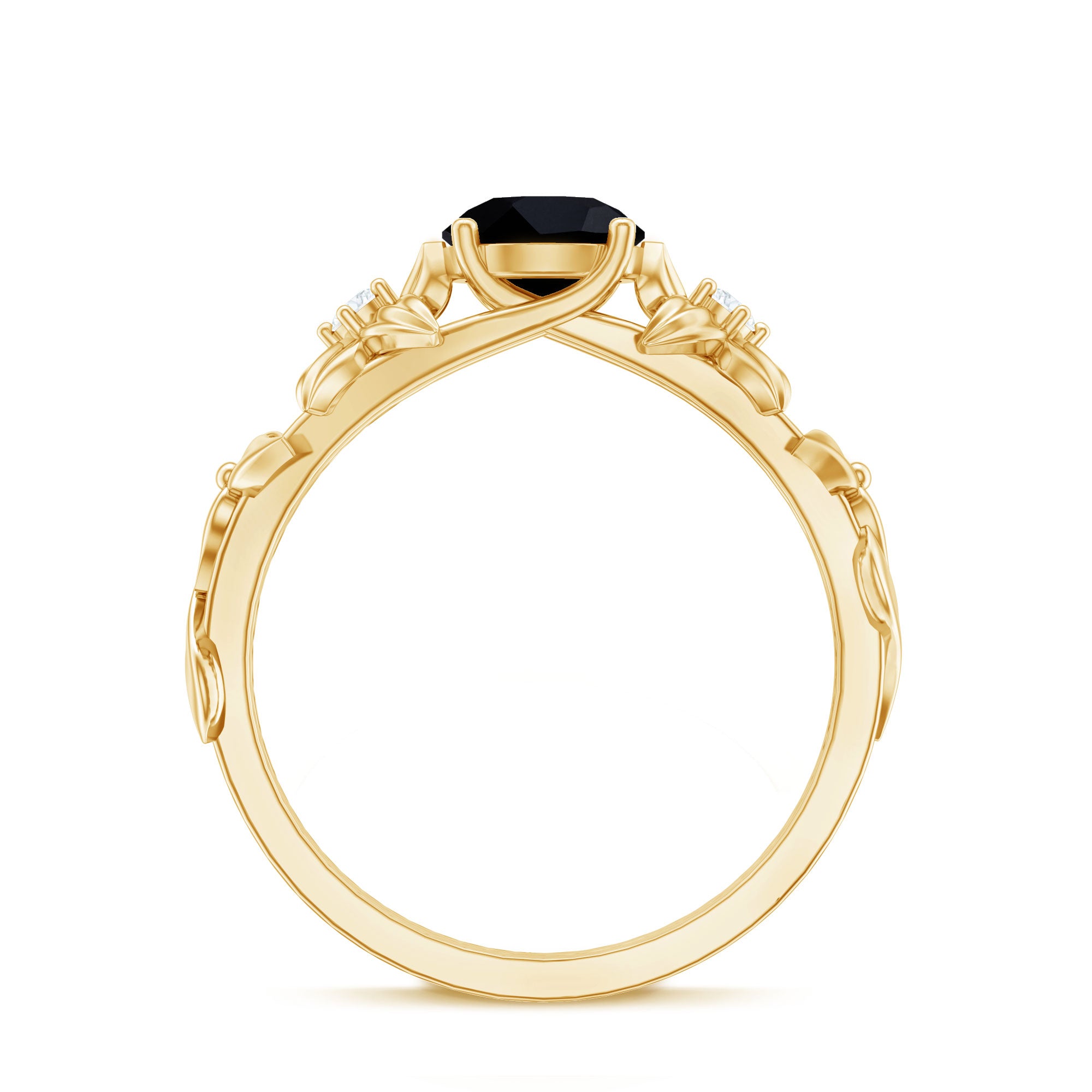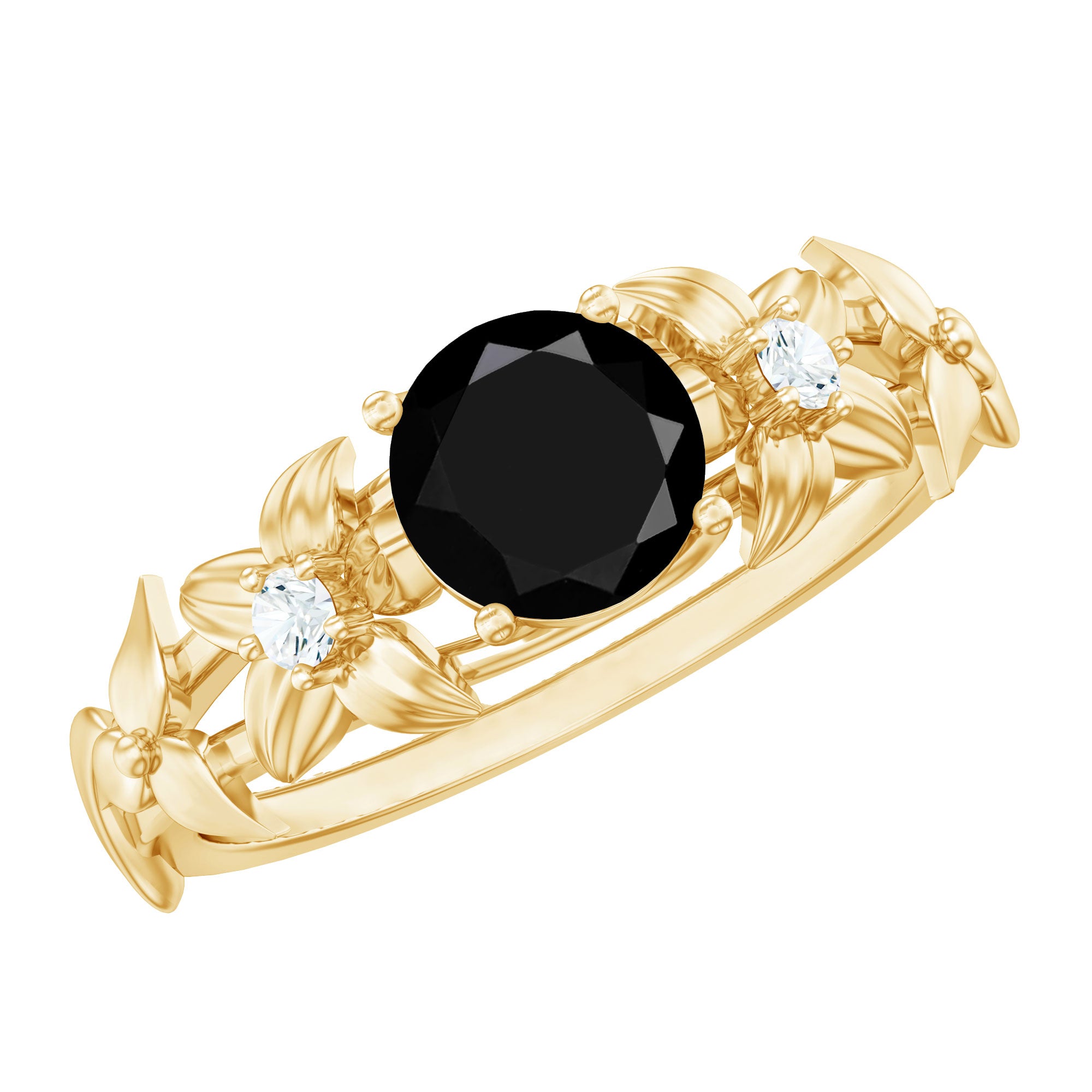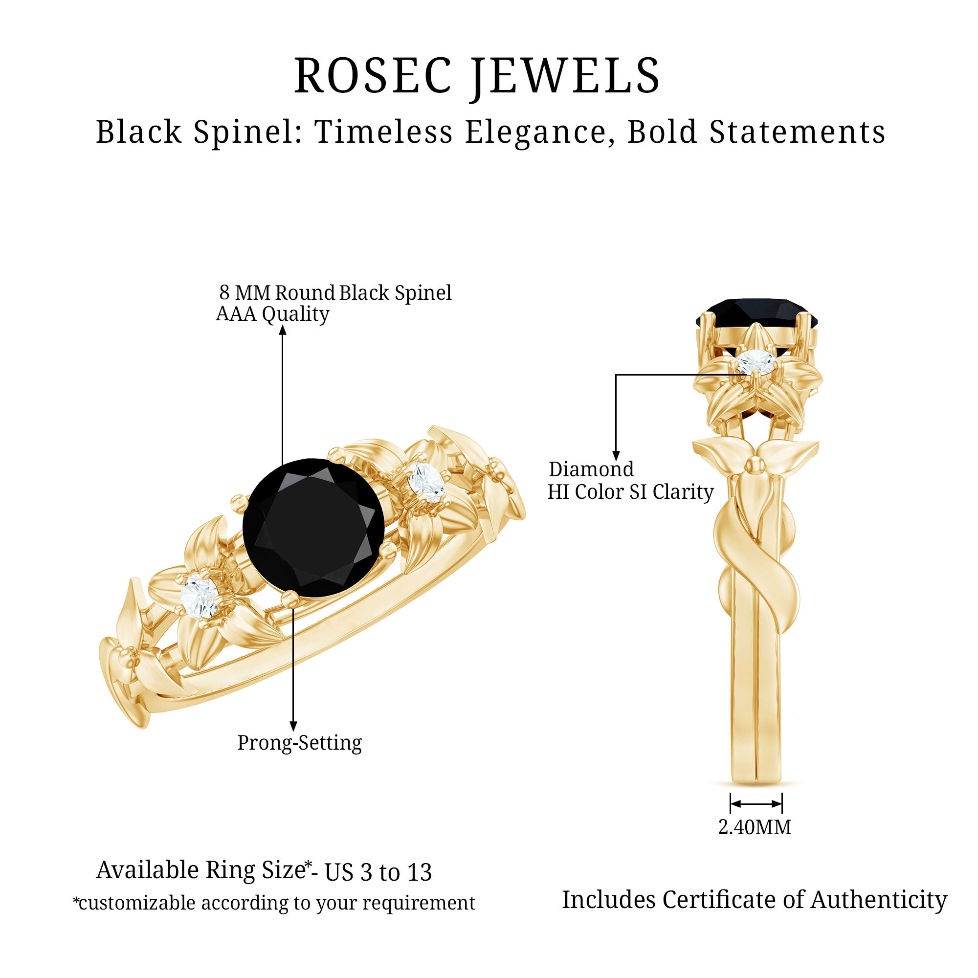 Create a moment shell cherish forever by gifting her this exquisite Flower Engagement Ring on her special day. It features a stunning Round Shape Black Spinel Solitaire at the center, surrounded by the brilliance of Round Shape Diamond stones adorning the floral-inspired shank in a prong setting.