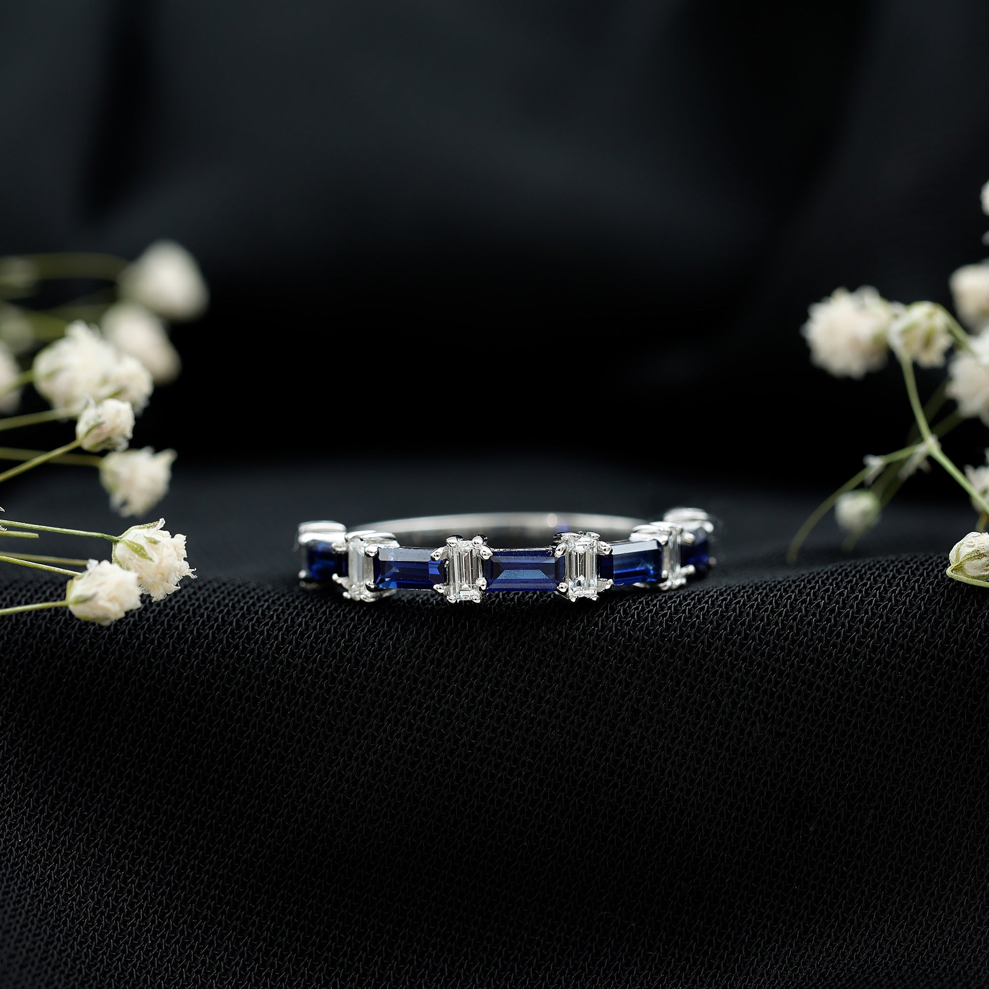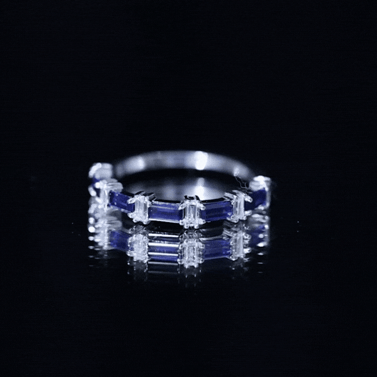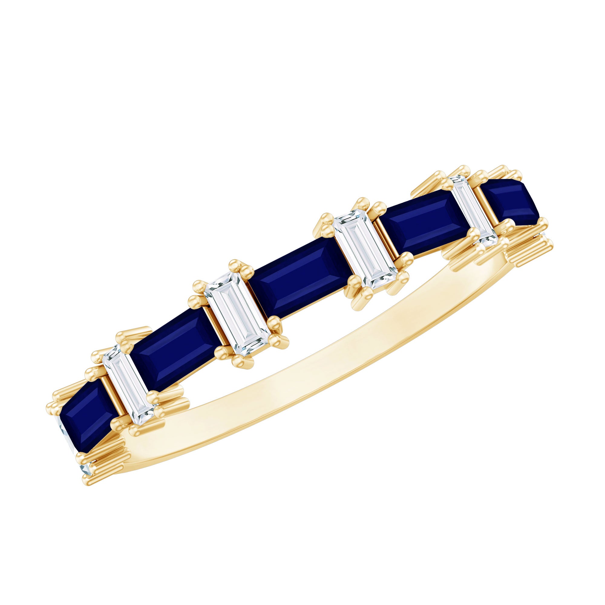 Indulge in the charm and allure of our East West Baguette Half Eternity Band, designed to captivate your ladys heart. Adorned with the timeless beauty of Baguette Cut Blue Sapphires, each securely held in a Prong Setting, and accentuated by Diamonds, this Half Eternity Band Ring is as captivating as it is elegant. A perfect choice for celebrating her special day, its a symbol of your enduring love and the promise of a beautiful future together. Let this Semi Eternity Band be the exquisite token that expresses your affection and devotion.