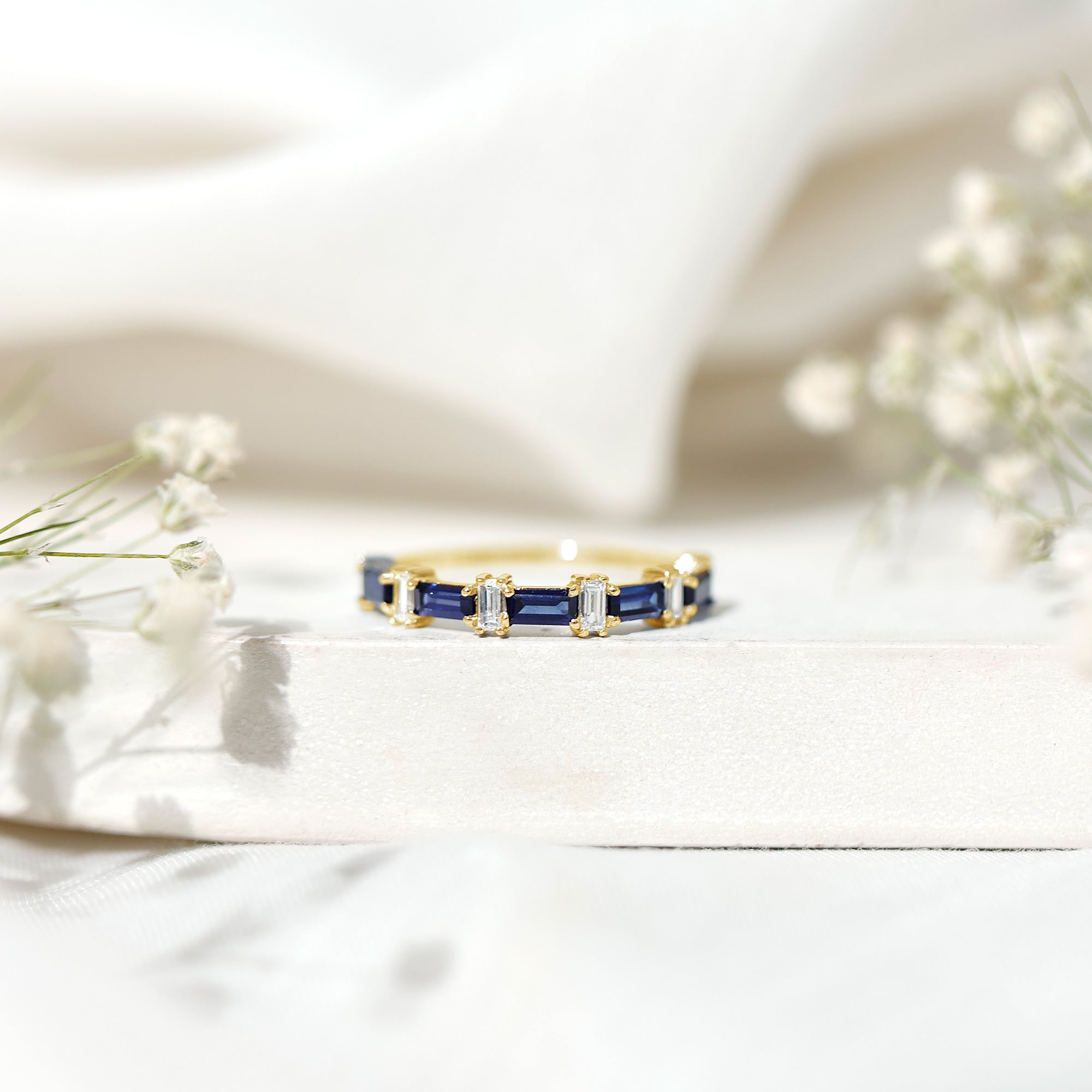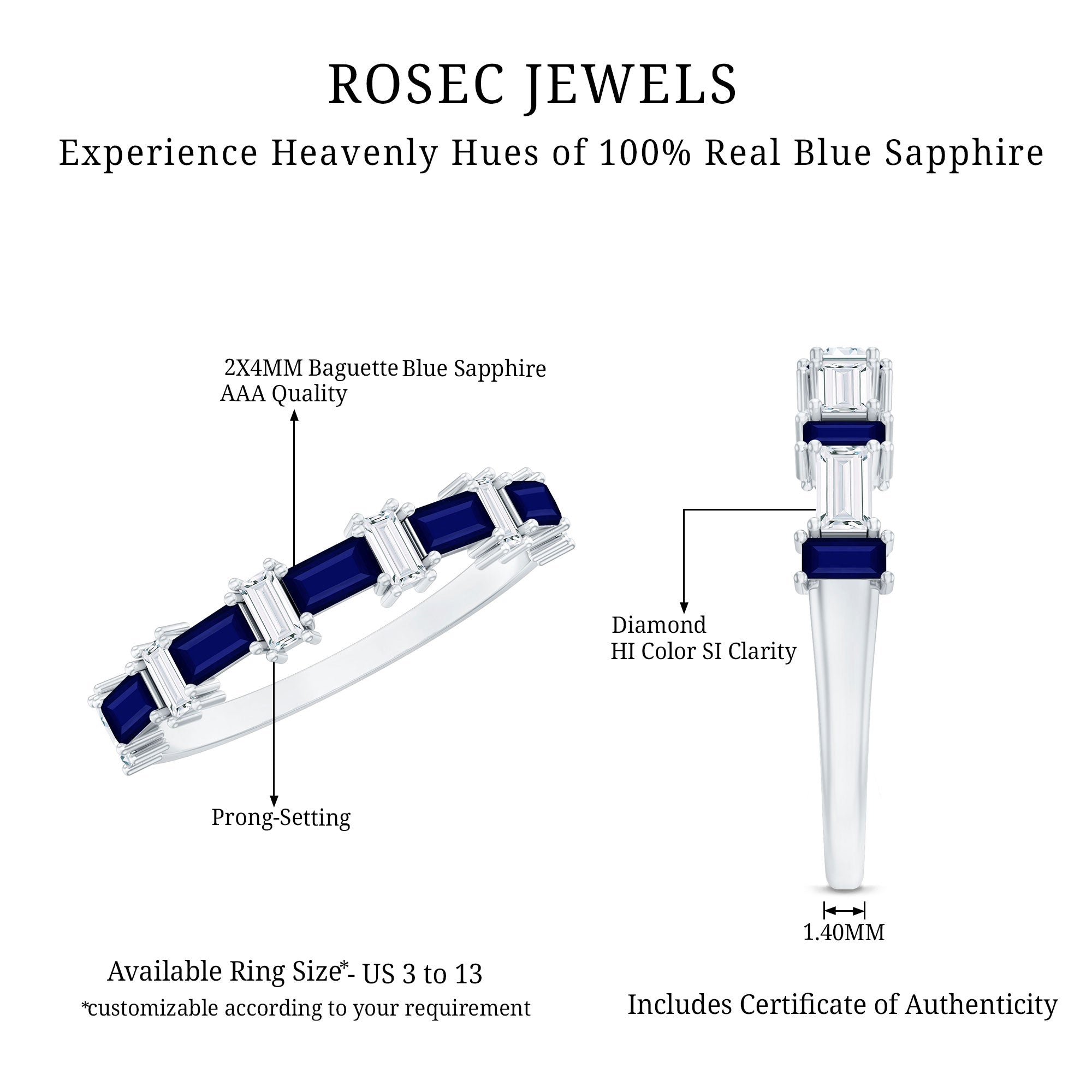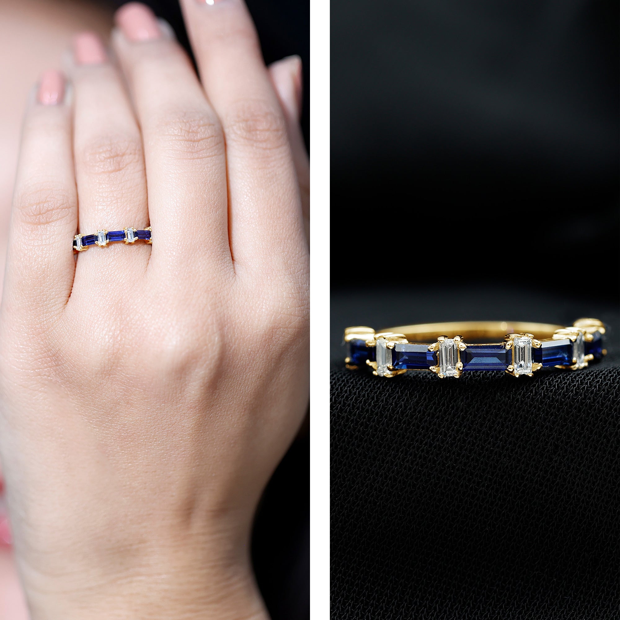 Indulge in the charm and allure of our East West Baguette Half Eternity Band, designed to captivate your ladys heart. Adorned with the timeless beauty of Baguette Cut Blue Sapphires, each securely held in a Prong Setting, and accentuated by Diamonds, this Half Eternity Band Ring is as captivating as it is elegant. A perfect choice for celebrating her special day, its a symbol of your enduring love and the promise of a beautiful future together. Let this Semi Eternity Band be the exquisite token that expresses your affection and devotion.