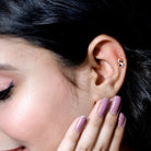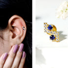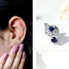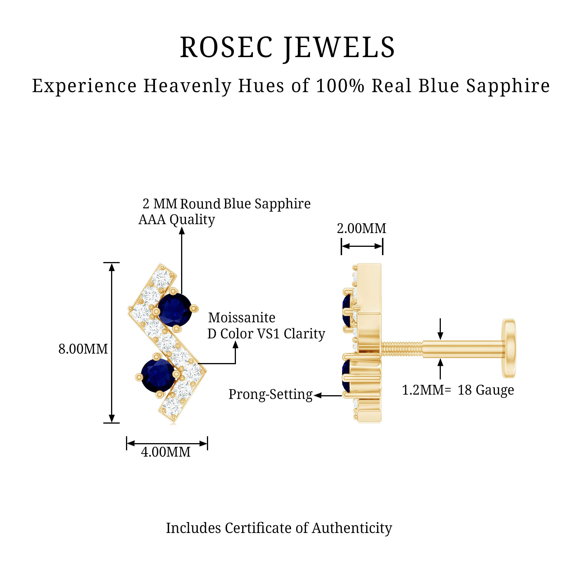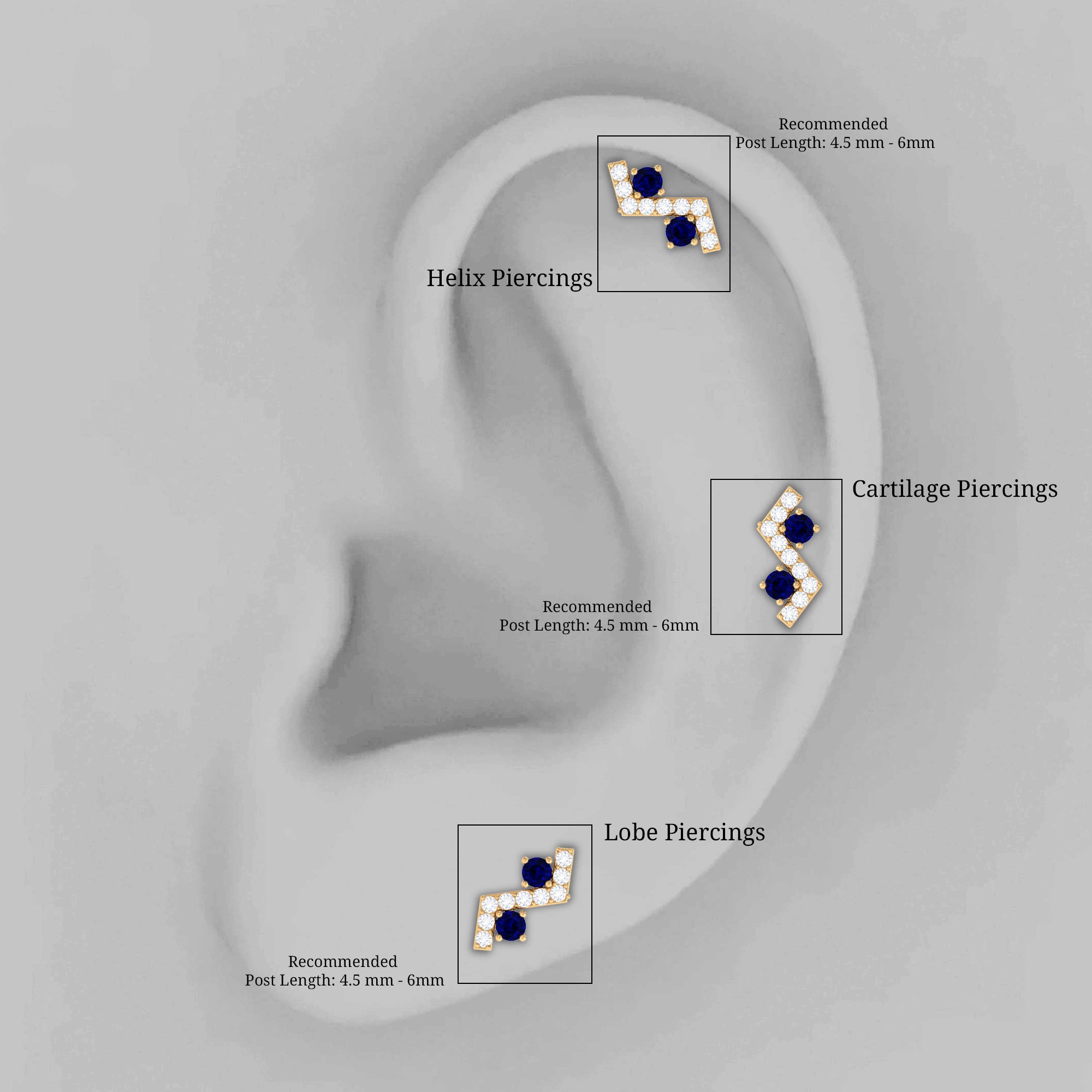 Add a touch of elegance to your look with this exquisite Blue Sapphire and Moissanite Zig Zag Earring, which showcases two Round Cut Blue Sapphires in Prong Setting along with small Round Cut moissanite studded on a unique zigzag design. This dainty earring is perfect for Helix, Tragus, Cartilage, or Upper Lobe Piercing, and comes with a flat back closure for a comfortable and secure fit. Plus, it comes ready to gift in our signature jewelry box.