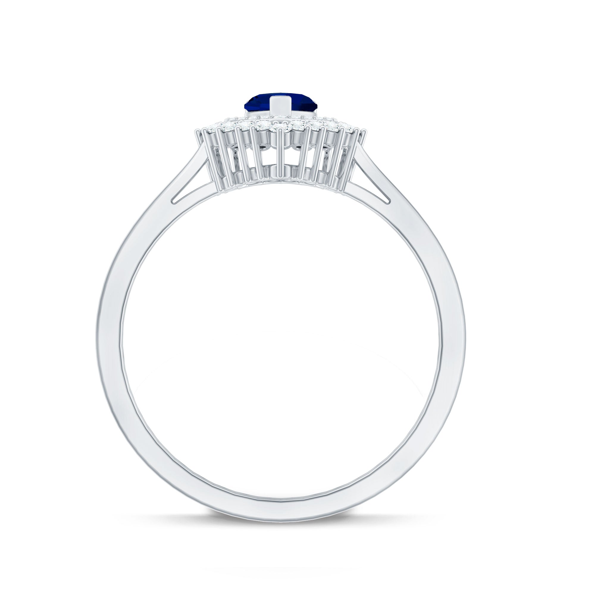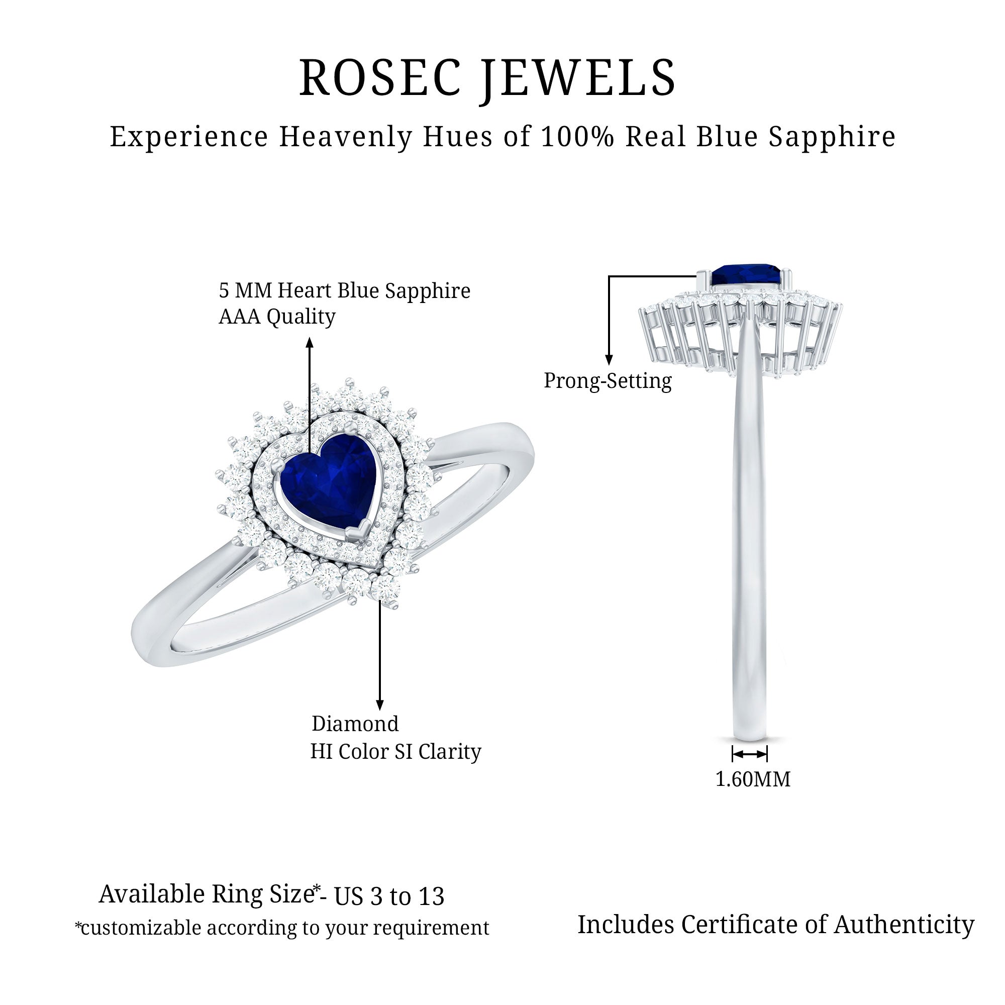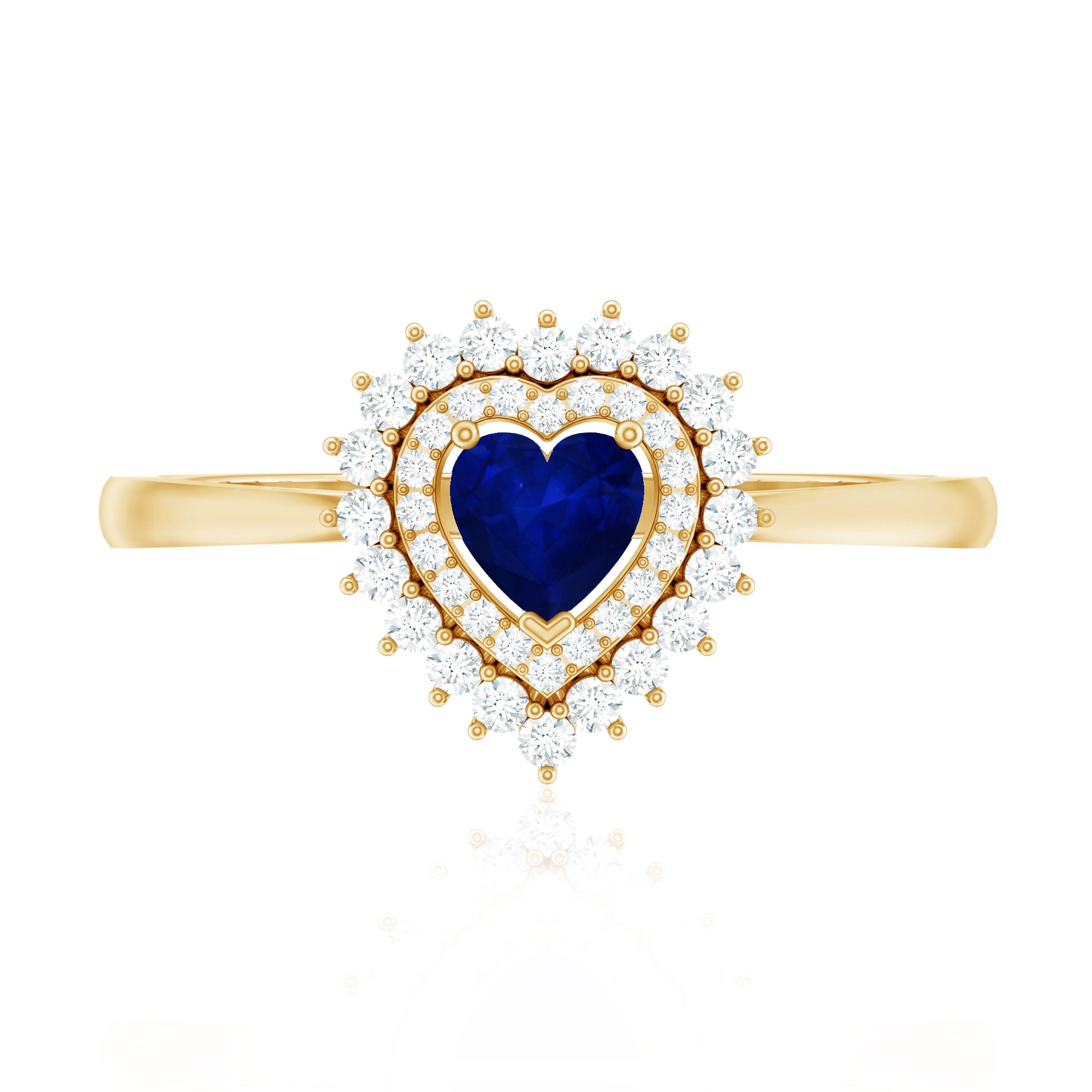 Heart Shape Blue Sapphire is accentuated by Diamond Double Halo which makes this Statement Ring more beautiful. This Blue Sapphire Engagement Ring is crafted for sumptuous charm. Lift up your look with this Heart Engagement Ring and captivates people around you. This Blue Sapphire and Diamond Engagement Ring exhibit high brilliance.