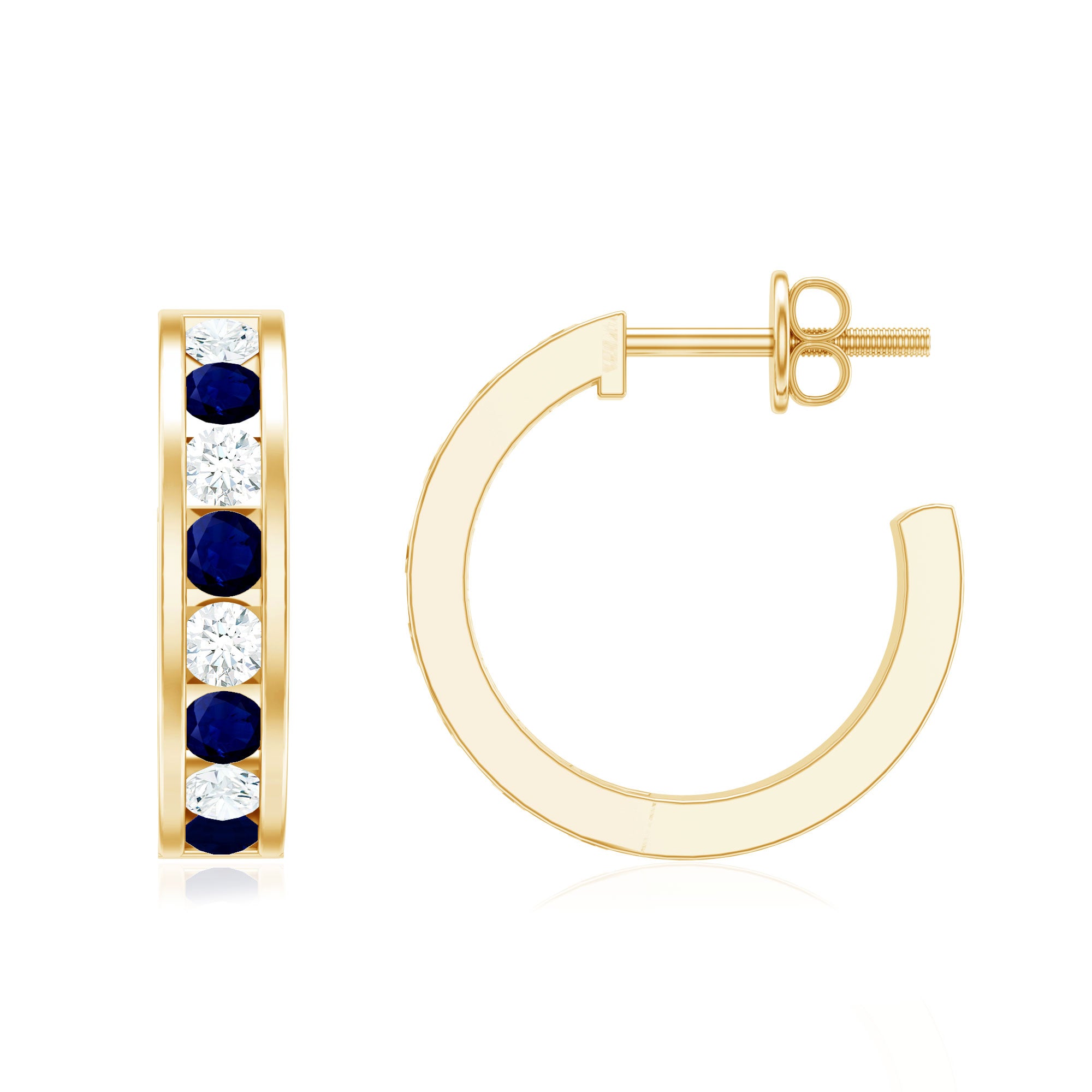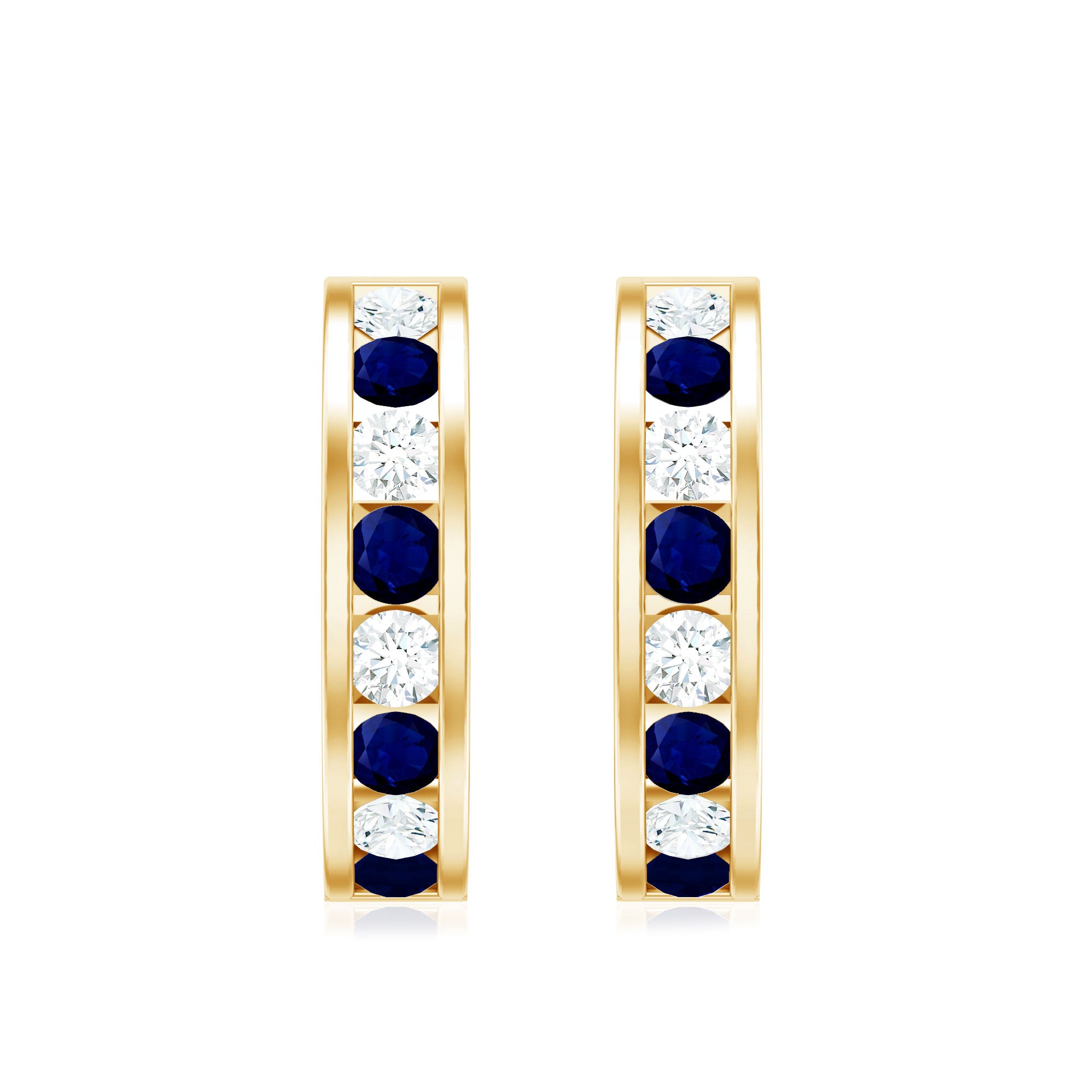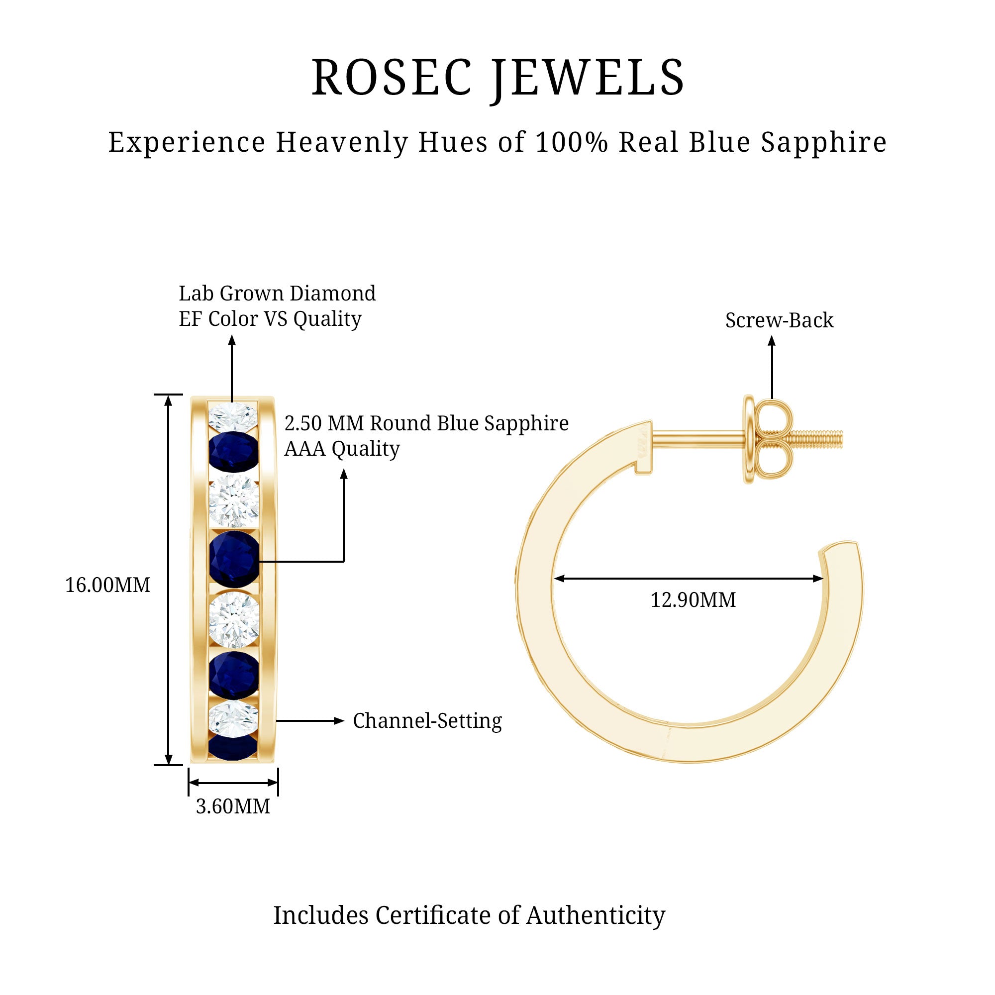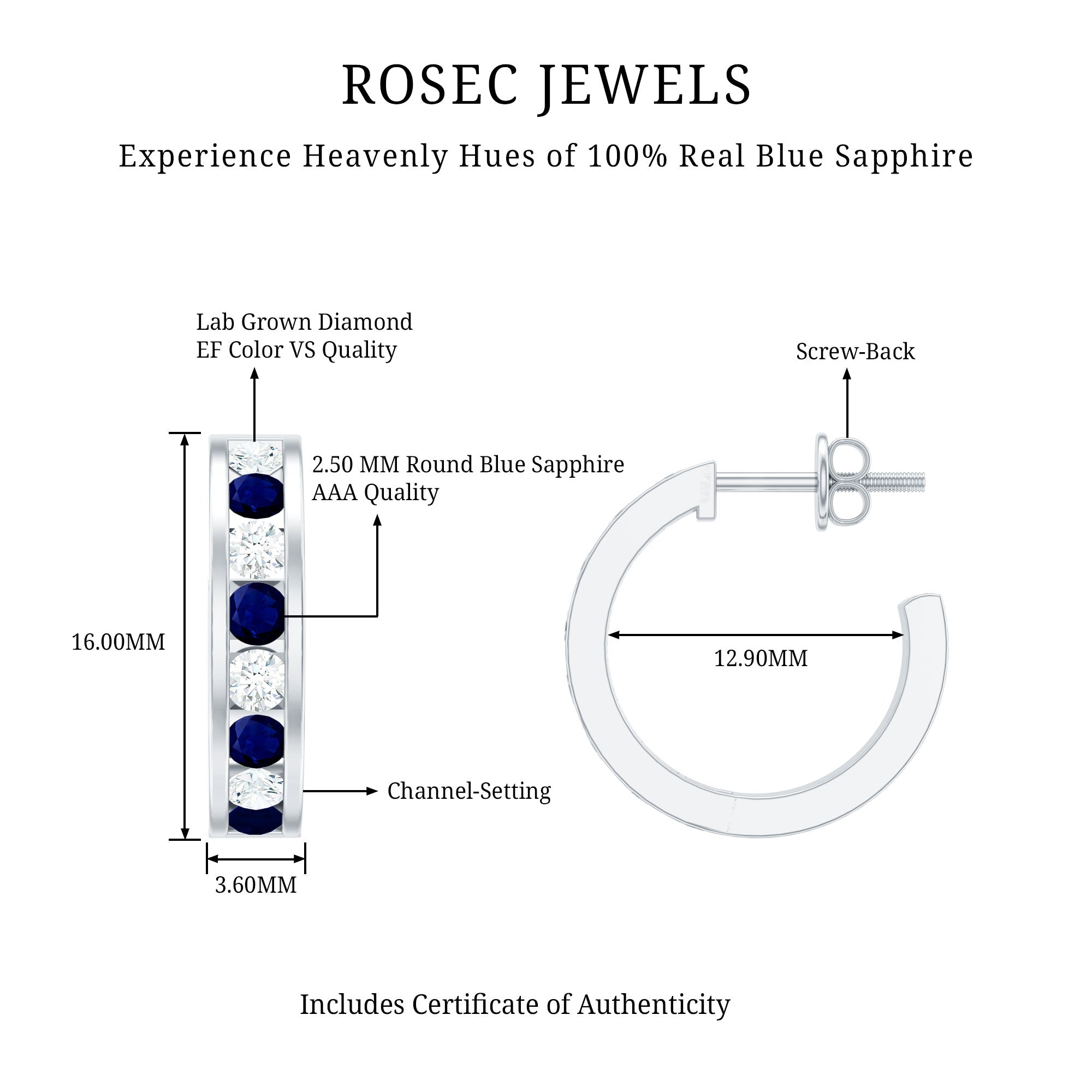 These Real Blue Sapphire Earrings boast a timeless bespoke design that gives them a classic vibe, making them suitable for any event. They feature Round Shape Blue Sapphires set in Channel Setting, alternating with Lab Grown Diamonds, resulting in a truly unique piece. These Sapphire and Diamond Earrings are remarkable and built to last. They are designed with a secure screw back closure, so you wont have to worry about them falling off. The striking contrast between AAA Quality Natural Blue Sapphire and EF-VS Quality Man Made Diamonds exudes elegance with a daring twist that catches the eye. The bold Half Hoop Design adds a sculptural element, making them feel both modern and timeless, like a treasure from a queens collection. These Channel Set Earrings are ideal for transforming a basic outfit into a statement piece, while also radiating confidence, mystery, and a touch of mischief.