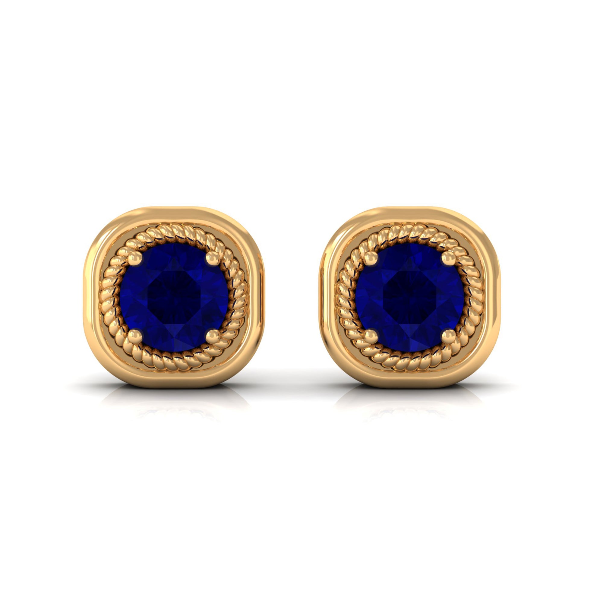 Flaunt these beautiful Solitaire Stud Earrings embellished with Round Cut Blue Sapphire set as Solitaire in 4 Prong Setting. The Blue Sapphire Stud Earrings are composed in Solid Gold and has a Twisted Rope Frame guarding the solitaire.