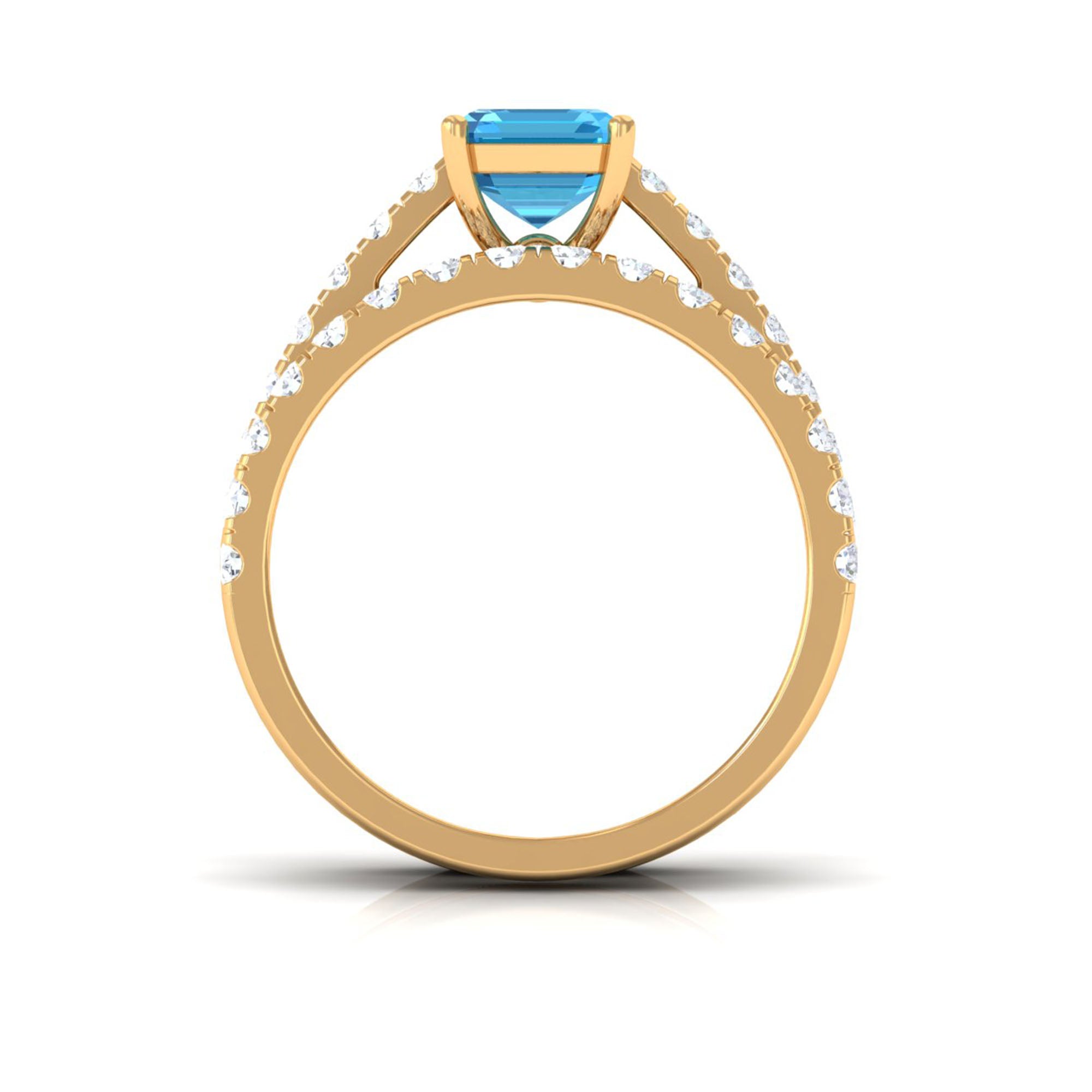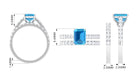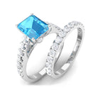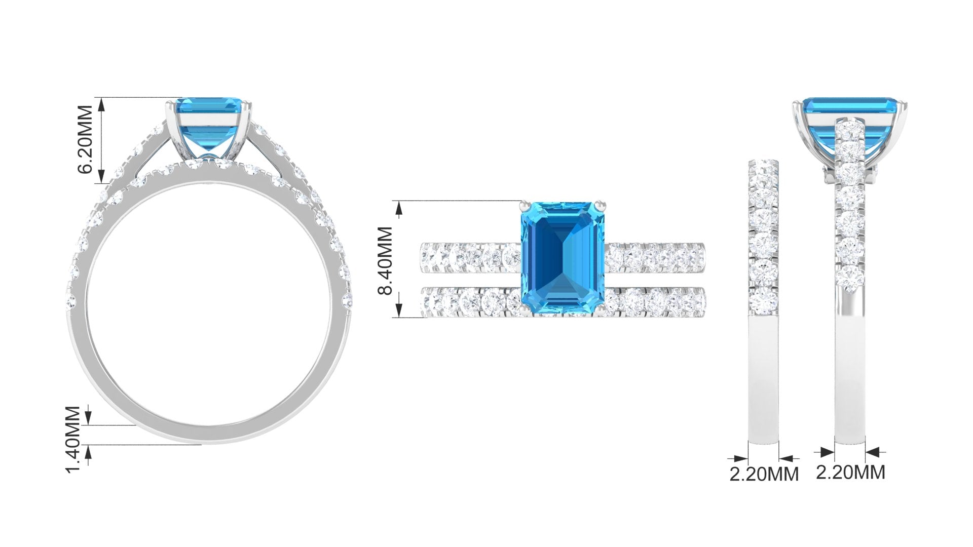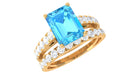 This Bridal Ring Set is embellished with Octagon Cut Swiss Blue Topaz is set as Solitaire with Round Shape Moissanite are set as Side Stones and Wedding Band is encased with Round Moissanite.