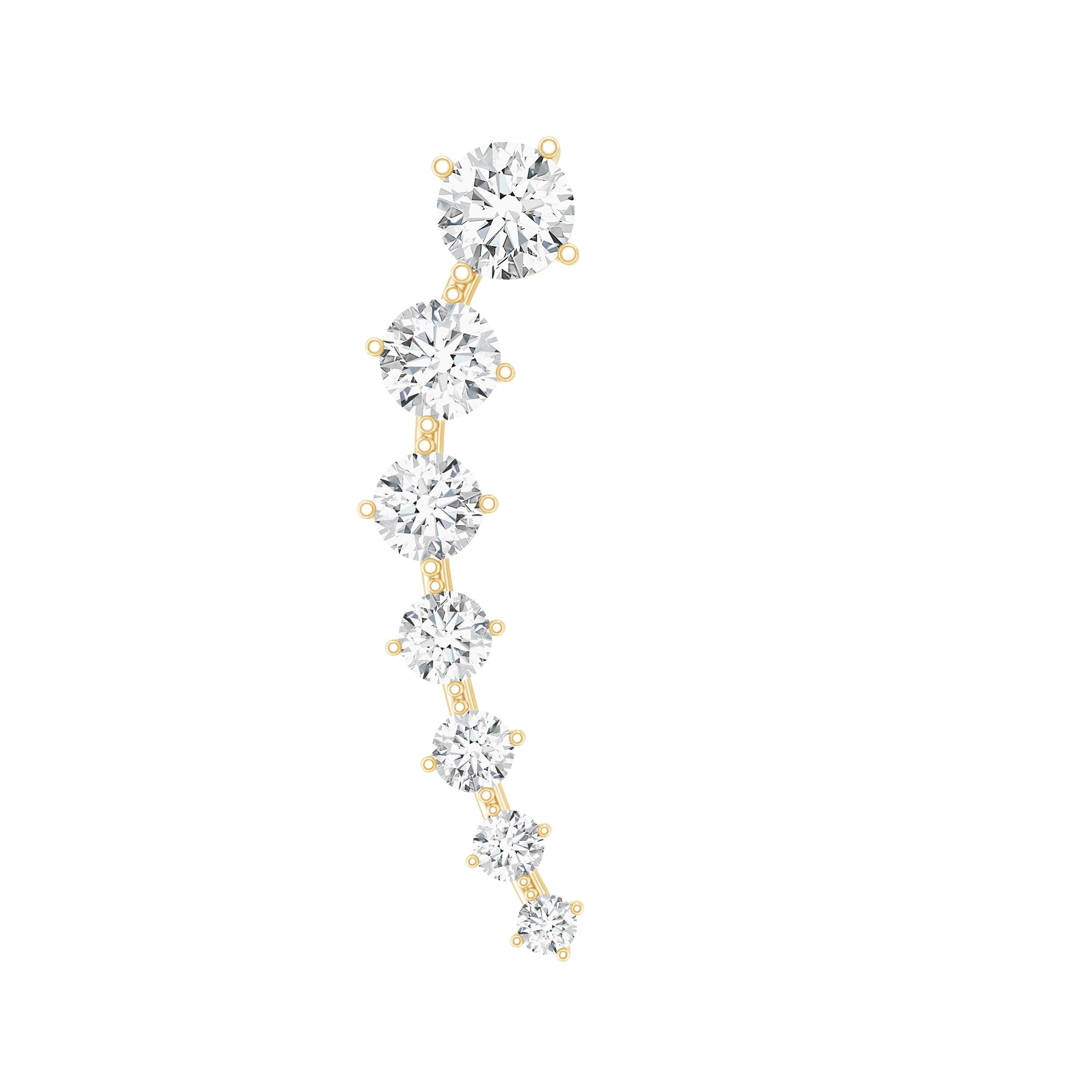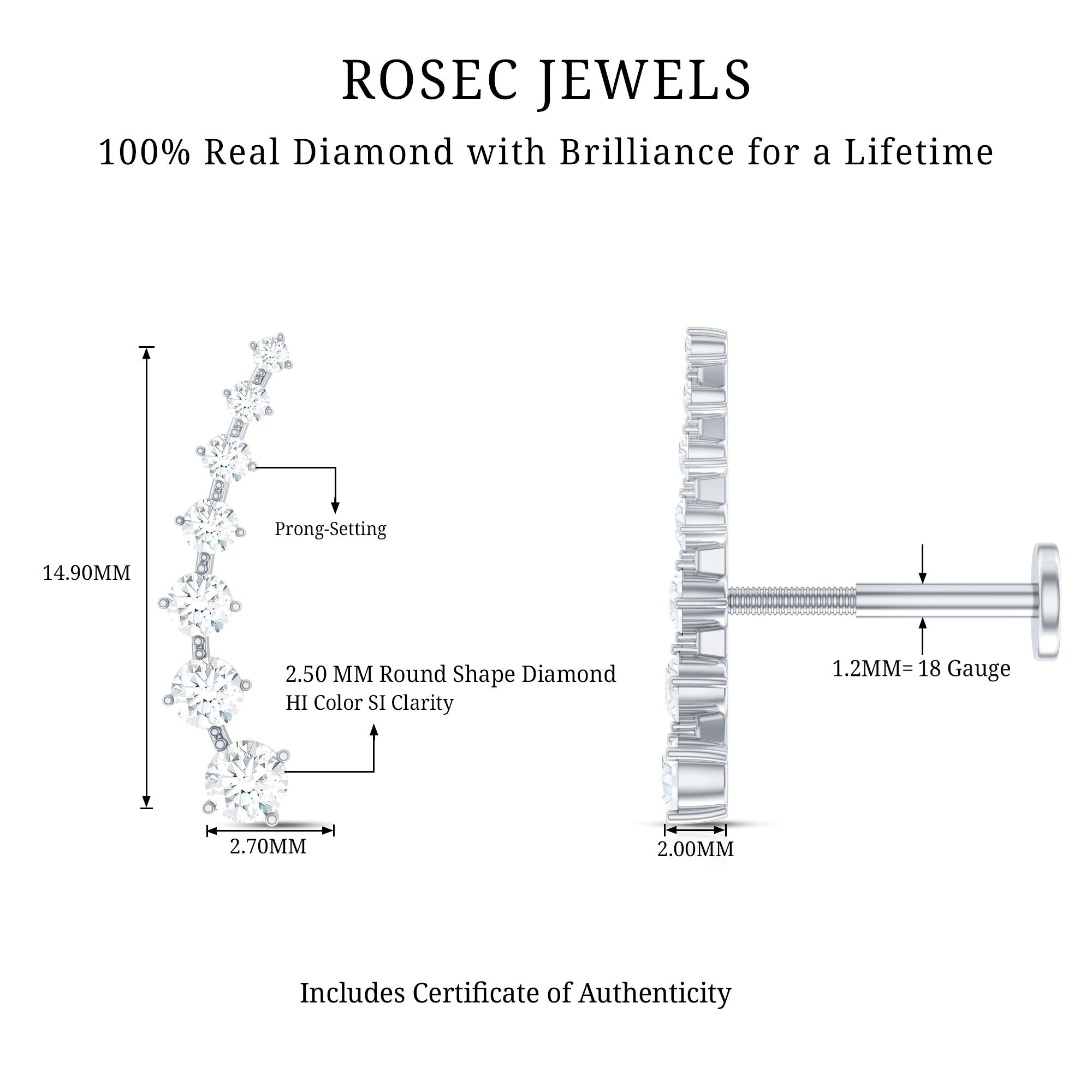 The Diamond Ear Crawler is the simplest way to elevate your style! This earring showcases descending round diamonds set in prongs. Crafted from responsibly sourced metal by our skilled artisans, its perfect for everyday wear. You can rock this ear crawler on your helix, hidden helix, upper lobe, or cartilage piercing, thanks to the flat back closure that keeps it securely in place. Its designed to be worn up and around the ear, making it super easy to wear and ideal for transitioning from day to night. For a chic look, pair this Diamond Ear Climber with gemstone studs or drops for a more personalized and bold statement. Whether youre treating yourself or gifting someone special, this long Earring is a fantastic addition to any jewelry collection. It’s a step up from standard ear piercing jewelry, timeless and versatile for any occasion. Transform your ears appearance with our Diamond Climber Earring and catch everyones eye while receiving compliments wherever you go. The Minimalist Earring will come in premium packaging along with a certificate of authenticity.