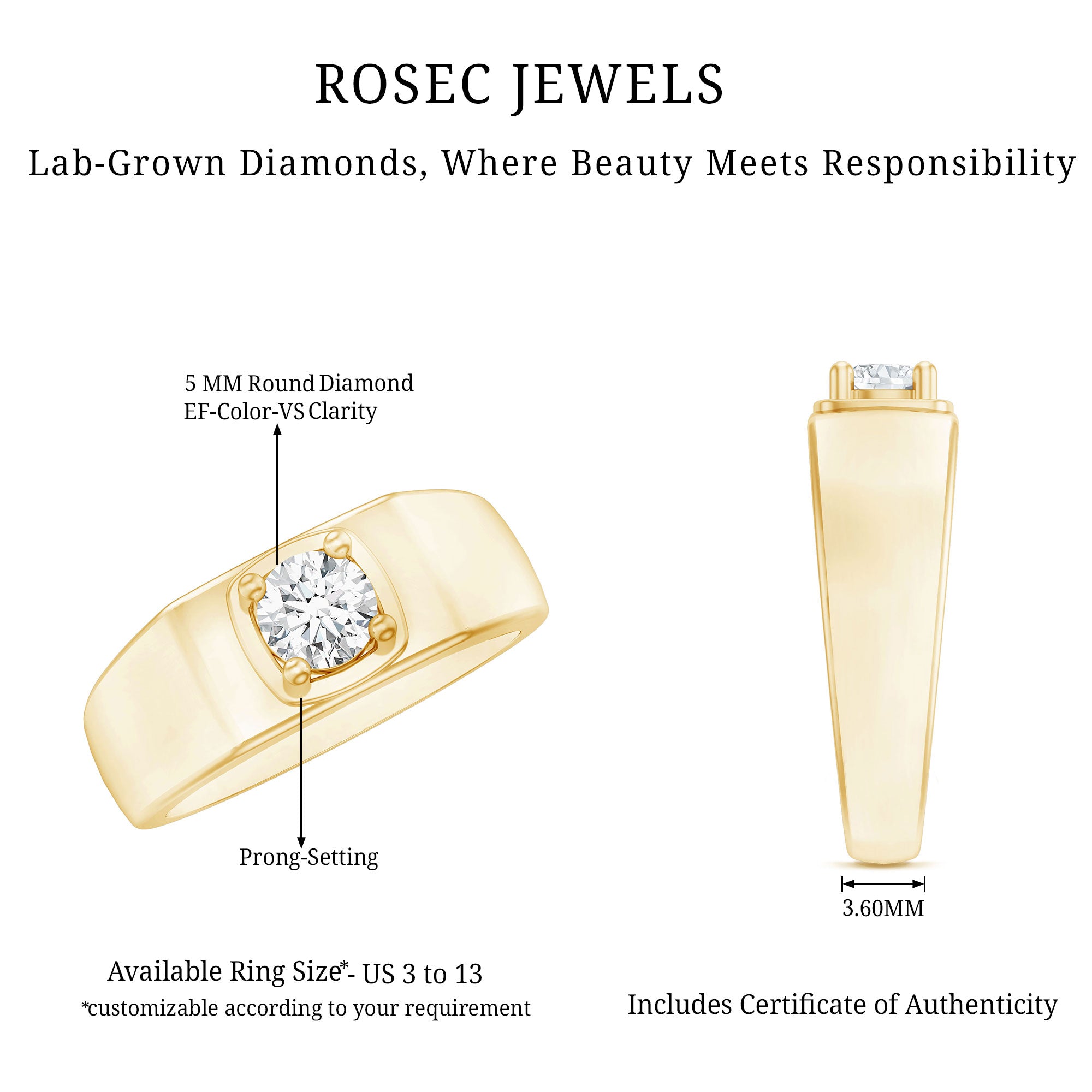 Bold and refined, this Round Solitaire Engagement Ring is designed for those who appreciate timeless style with a modern edge. At the heart of the design is a brilliant 5 MM round cut lab grown diamond, securely set in prong setting. The wide band gives the Mens Engagement Ring a strong look, offering both comfort and durability for everyday wear. Its smooth surface and clean lines highlight the center stone, keeping the design simple yet impactful. Whether worn as a symbol of commitment or as a fashion forward statement piece, this Lab Grown Diamond Ring for Men delivers elegance. This Manly Ring is ideal for someone who values subtle luxury, long-lasting quality, and modern design. A contemporary take on a classic symbol, this ring is a meaningful way to mark a new beginning with style and confidence. Thoughtfully presented in a high-quality jewelry box, this Diamond Mens Ring is ready to be gifted and even more ready to be worn. It is crafted to fit your narrative perfectly. For those who value craftsmanship, this is more than just an engagement ring, it serves as a sophisticated reminder that love and fashion are best when they are bold, significant, and built to endure.