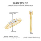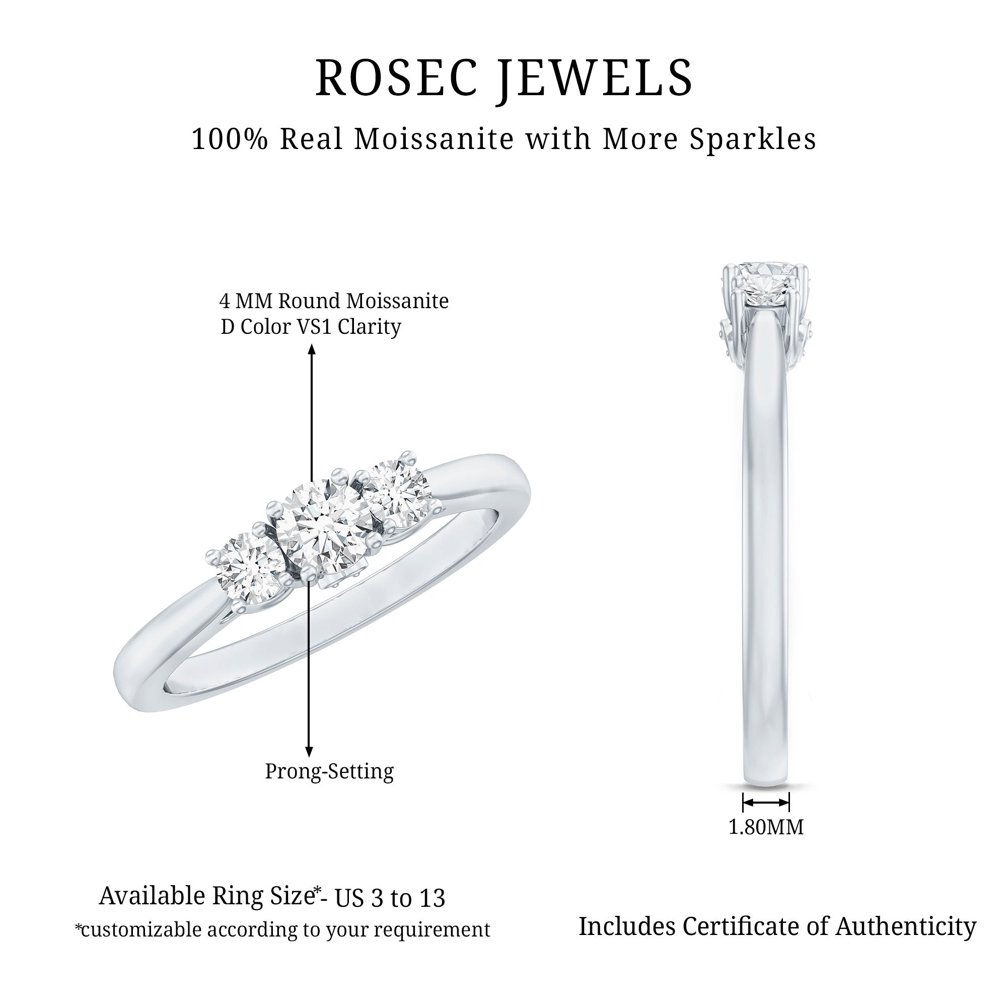 Seal your commitment with a one-of-a-kind Three Stone Ring that represents your past, present, and future. Rosec Jewels presents a stunning Moissanite Promise Ring, carefully handcrafted. It features three round Moissanites set in prongs for a refined look, enhanced by two peek-a-boo moissanites hidden beneath the main stone for an added surprise. This thoughtful touch elevates this Simple Moissanite Ring beyond mere jewelry, it becomes a treasured keepsake. With its elegant shape and comfortable wear, this 3 Stone Promise Ring is perfect for the modern bride who appreciates timeless beauty infused with significance. Whether youre marking a major milestone or looking for a way to express your devotion, this Past Present and Future Ring will be an ideal keepsake for her, one she will cherish forever. It beautifully captures the essence of your relationship in a single design. By blending contemporary style with classic elegance, this Minimalist Ring for Women showcases D color VS1 clarity stones that sparkle with fire and brilliance.