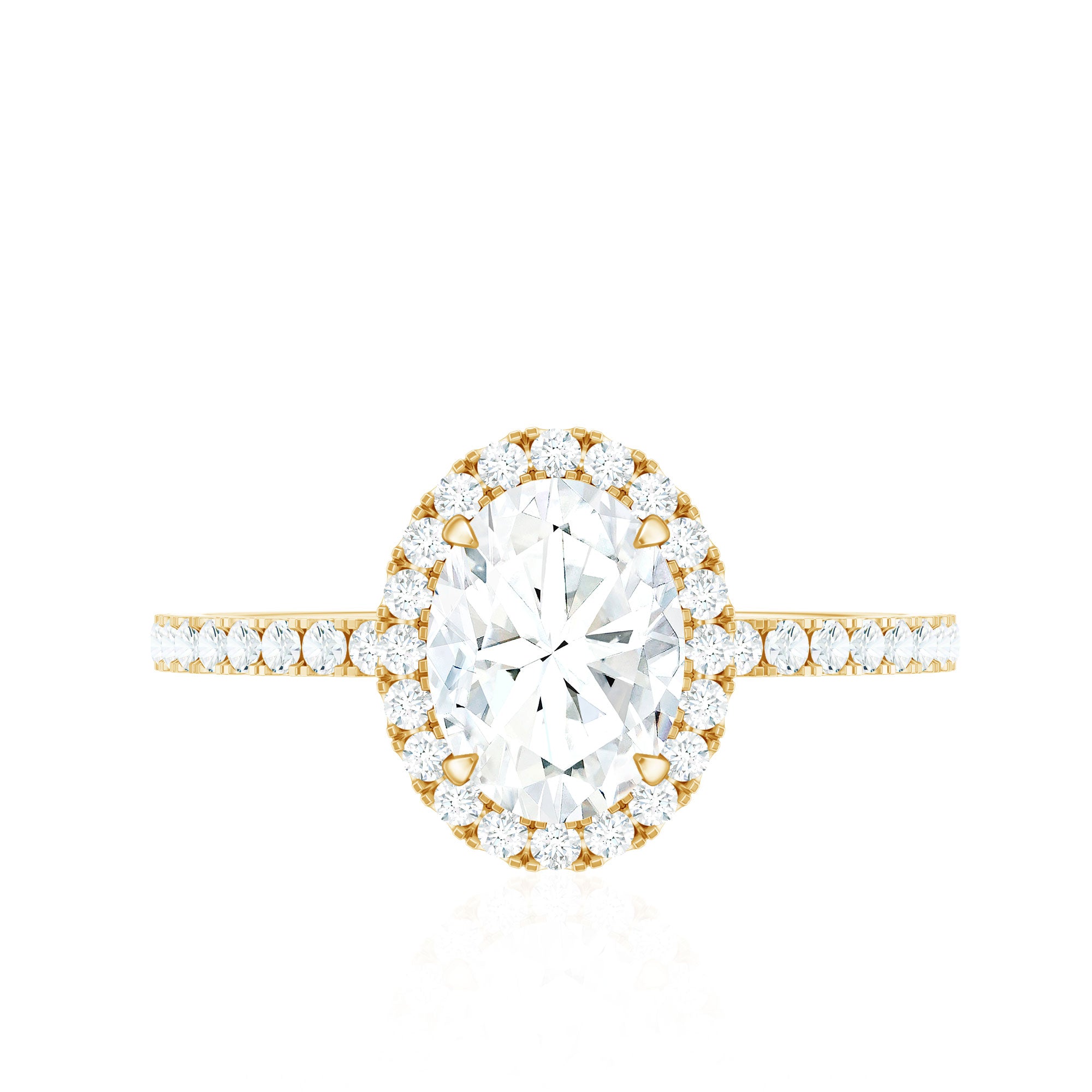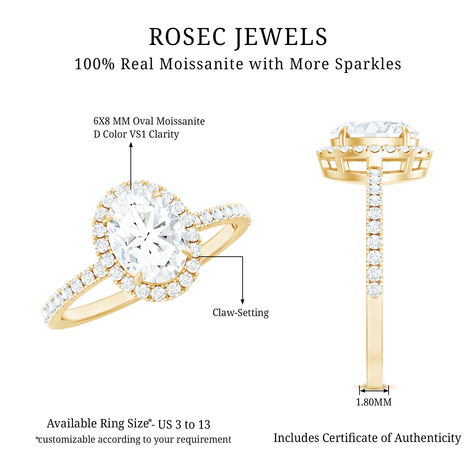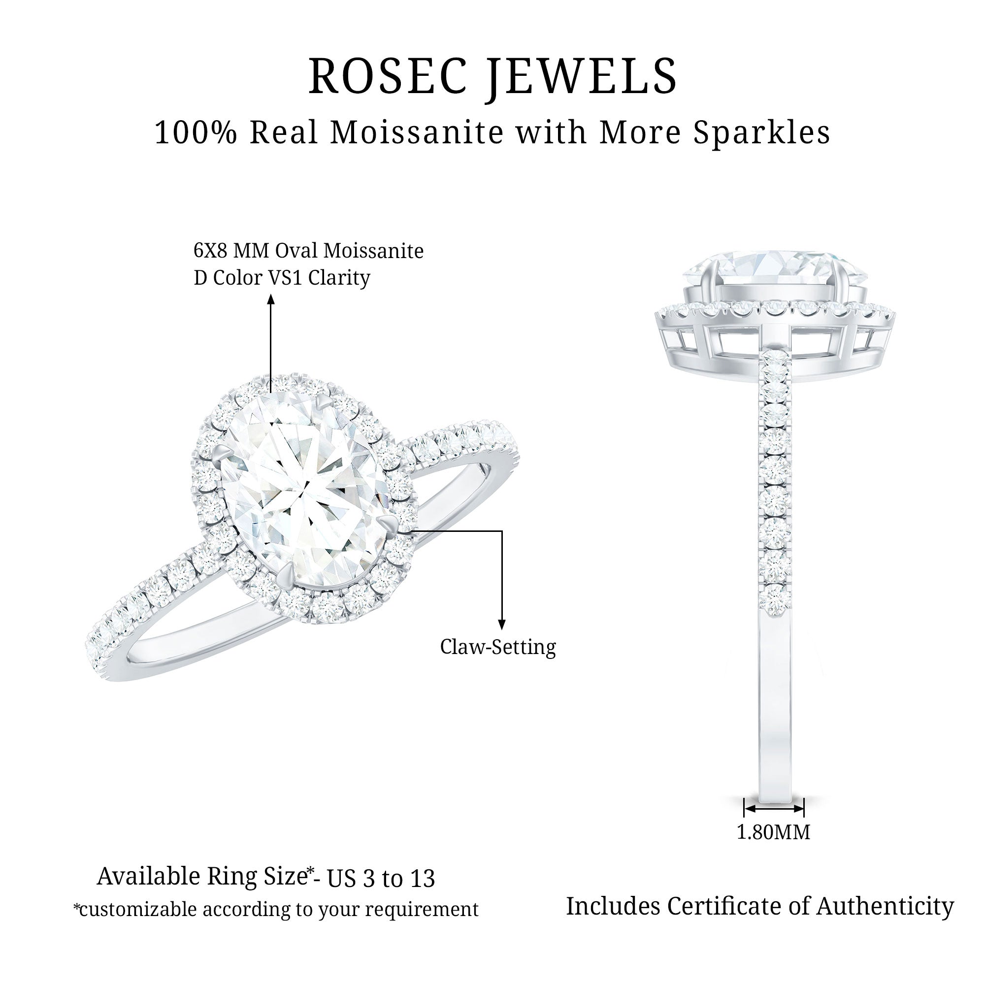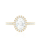 Surprise your beloved with the breathtaking charm of our Moissanite Engagement Ring on her special day, which captivates with its elegance and beautifully highlights the center stone. This timeless Oval Shape Engagement Ring features a D-VS1 quality Moissanite, ensuring the fire and brilliance that represent love and commitment. It showcases a 6X8 MM oval Moissanite at its center set in claw setting and surrounded by a halo. The dazzling side stones on the Halo Engagement Ring create a striking and magical look, reflecting your individual style and character. This Oblong Engagement Ring features a classic brilliant shape that captures everyones attention. It merges traditional beauty with contemporary elegance, providing a polished appearance that radiates with exceptional brilliance. We have designed this Moissanite Halo Ring in a variety of precious metals, along with options for color and purity. This 1 Carat Moissanite Ring will be delivered in an elegant jewelry box, ensuring safe and secure transport during shipping and for future storage. This timeless piece is destined to become a cherished addition to her jewelry collection that she will hold forever.