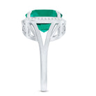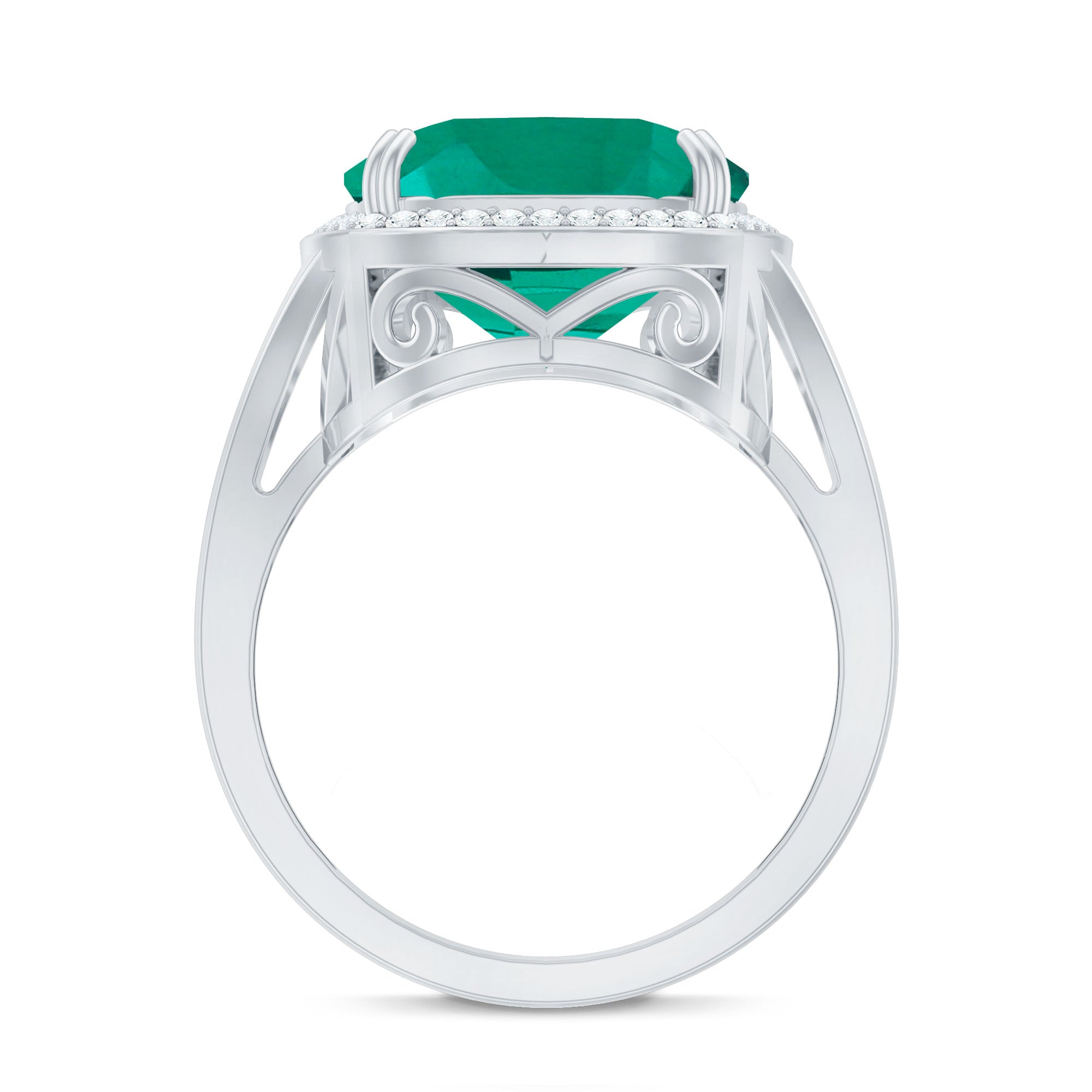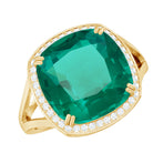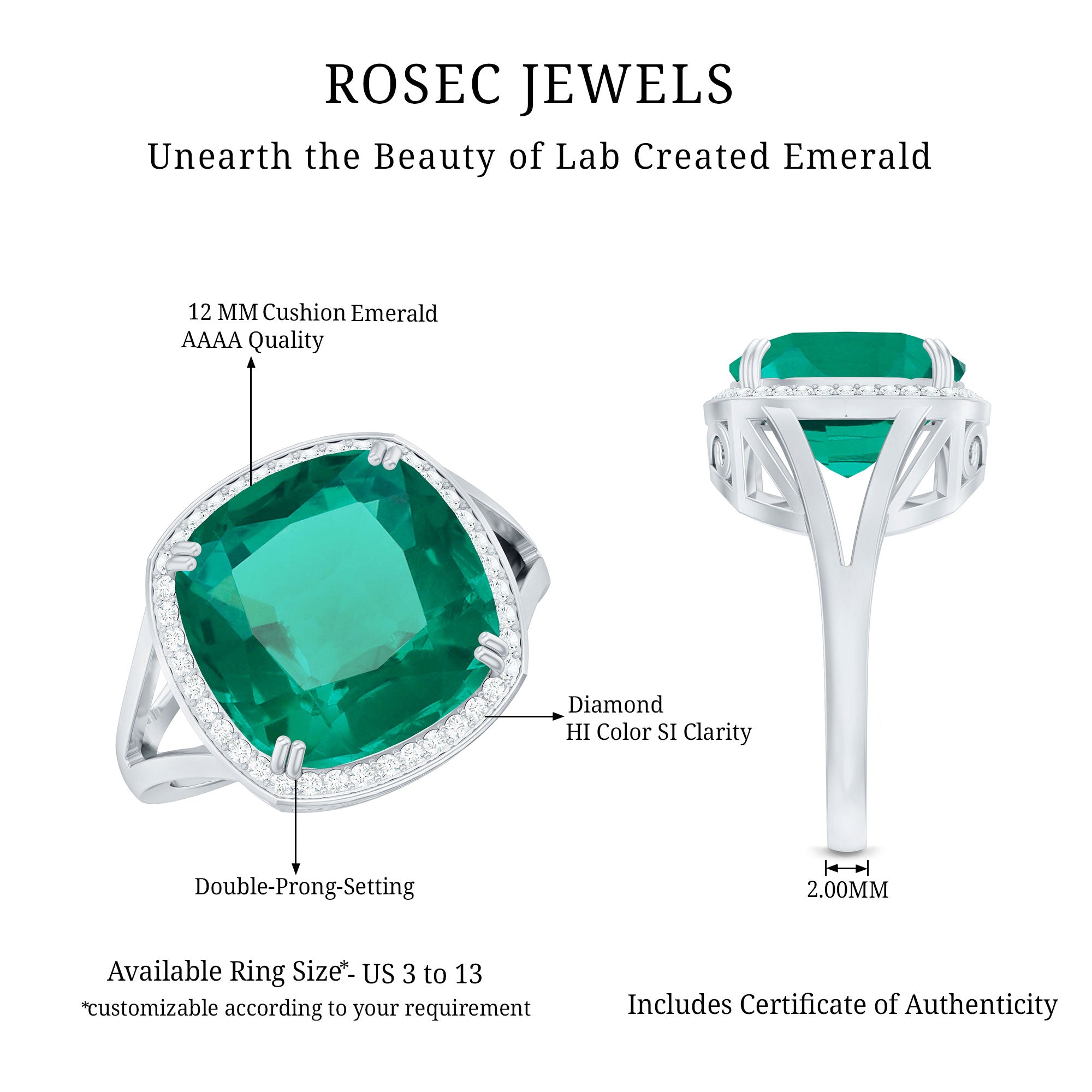 Designed to make a lasting impression, this Cushion Cut Engagement Ring is all about elegance with meaning. The centerpiece is a bold, 12 mm Cushion Cut Lab Created Emerald of AAAA Quality set in Double Prong Setting, glowing with deep green brilliance. Its size and color speak of confidence, passion and a love that stands strong. Framing the Lab Emerald is a Halo of sparkling HI-SI Diamond stones, adding light, contrast and timeless beauty to the rich green stone. The Split Shank band symbolizes two lives coming together as one. It is a reminder that while your paths may have been different, they now lead to the same place. This Halo Engagement Ring with Emerald is perfect for someone who wants something striking, meaningful and full of emotion. This Statement Ring blends bold design with romantic symbolism. Available in various ring sizes and beautifully presented in a signature jewelry box, this Lab Emerald Cocktail Ring is ready for that unforgettable yes moment.