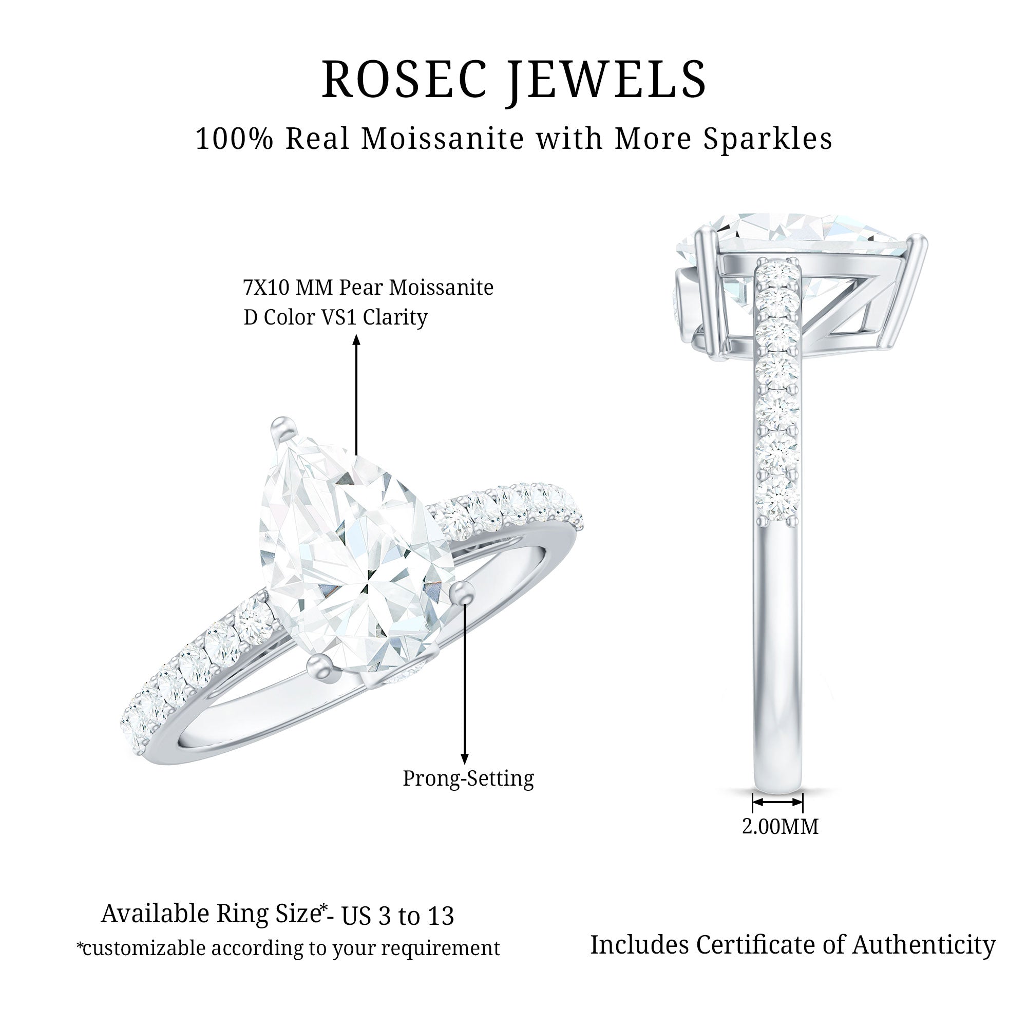 This Pear Moissanite Engagement Ring perfectly combines classic charm with modern sophistication. At its heart lies a breathtaking 7X10 MM pear shaped moissanite, securely held in a prong setting. The D-VS1 quality center stone shines brilliantly with every movement, making it the highlight of the Solitaire Engagement Ring. The band is adorned with a row of moissanite stones, providing a subtle sparkle that complements the center gem without overshadowing it. A thoughtful detail is the peek-a-boo moissanite tucked beneath the center stone, adding a delicate surprise. The pear-shaped center, along with the side stones, creates an elegant flow in the Teardrop Engagement Ring that flatters the finger from all angles. This Pear Shaped Engagement Ring comes beautifully packaged, ready to celebrate one of life’s most unforgettable moments. With various ring sizes, metal choices, and finishes available, it can be tailored to showcase your unique style.