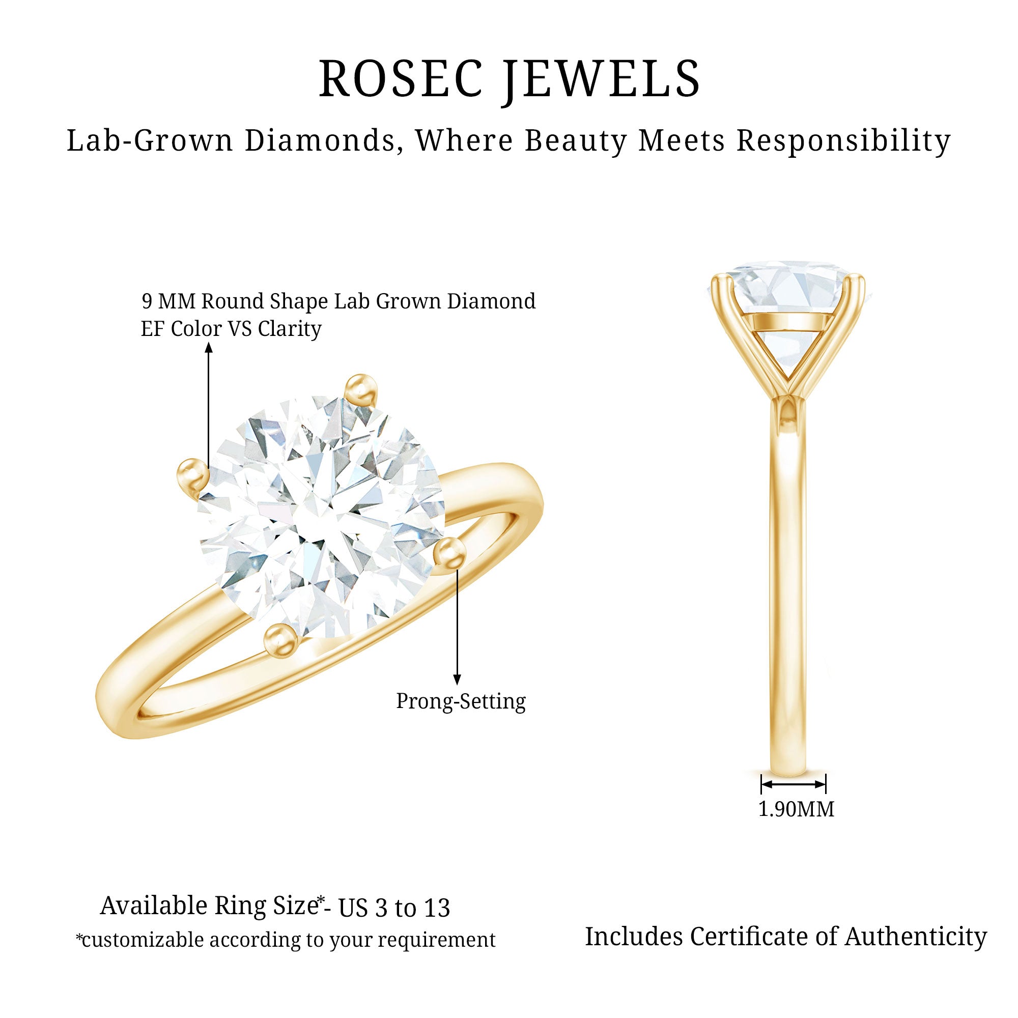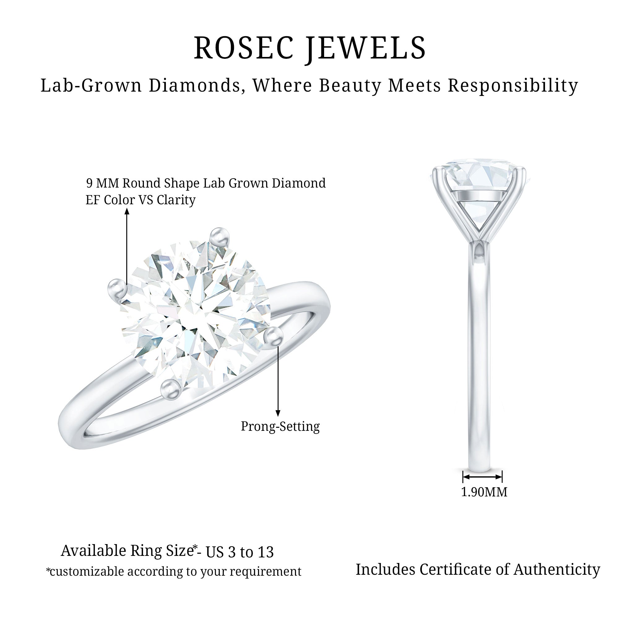 We handcrafted this 2.5 Carat Diamond Ring for the one who makes your world sparkle. At the heart of the design sits a stunning 9 MM round cut diamond, held securely in prong setting that lifts the stone high, allowing light to pass through every angle. You can present this as a Promise Ring, an anniversary gift, or a romantic surprise, this Diamond Solitaire Ring beautifully marks lifes most cherished moments. The lab made diamond ensures affordability while being eco-friendly, offering the same brilliance and durability as natural stones. It offers a wide range of metal color options and is also available in various ring sizes. This High Profile Engagement Ring comes with a certificate of authenticity for gemstones and is packaged in a premium storage box.