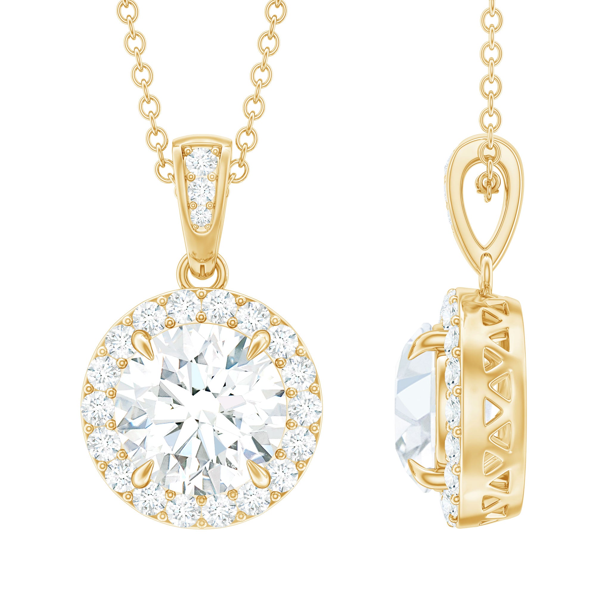The halo arrangement frames the center diamond with smaller accent stones, increasing light reflection and overall brilliance. This design choice enhances the perceived size and symmetry of the centerpiece without overwhelming the silhouette. The structure maintains a composed profile that rests neatly along the chain.
