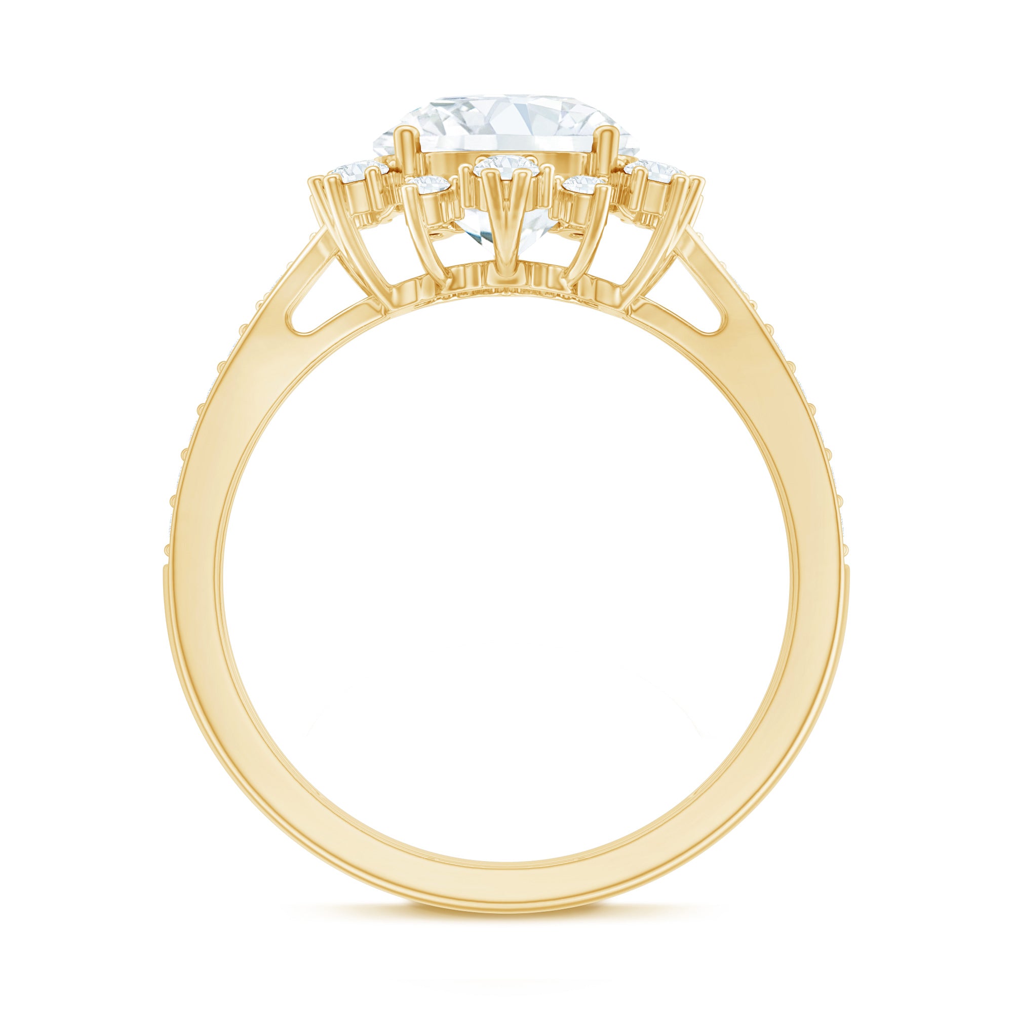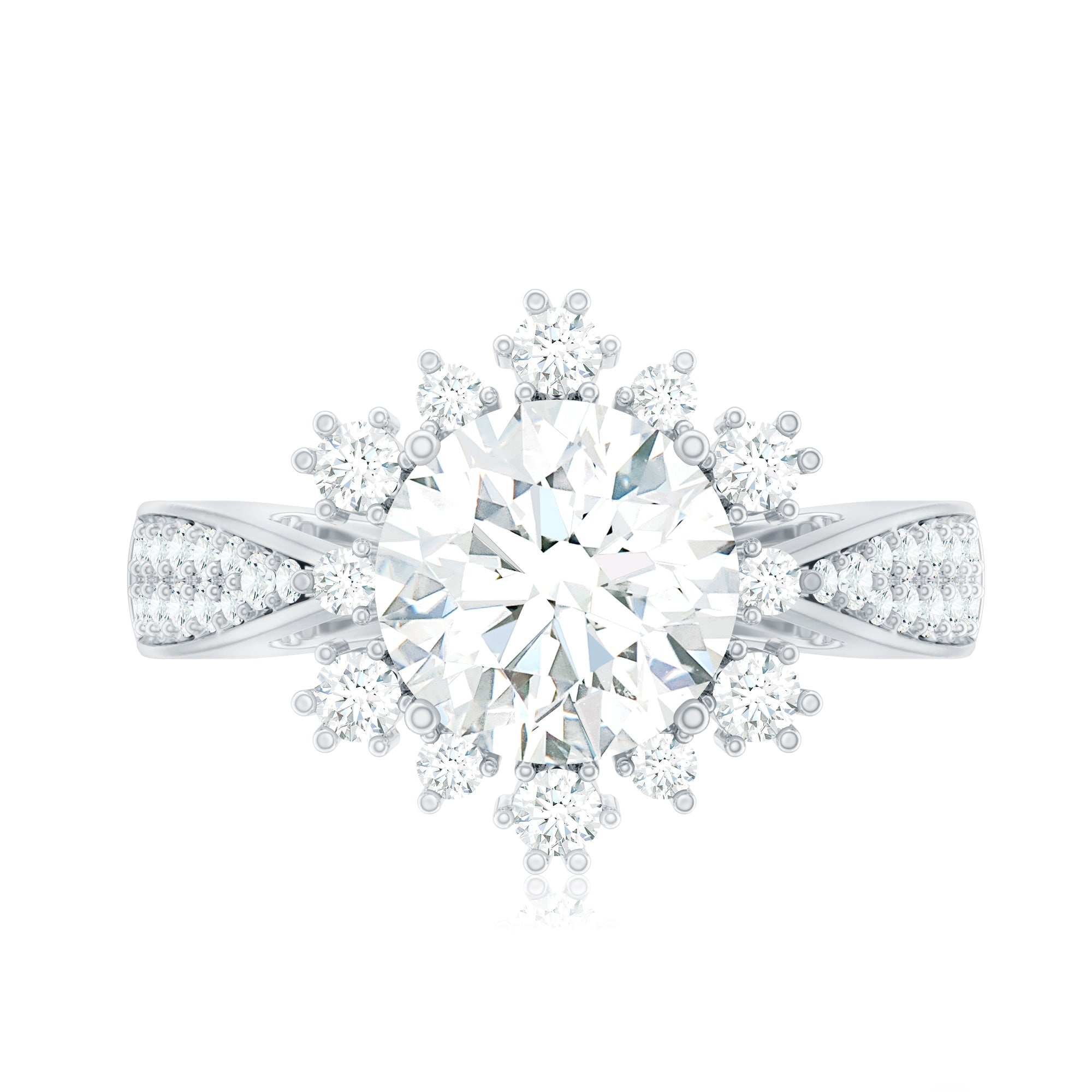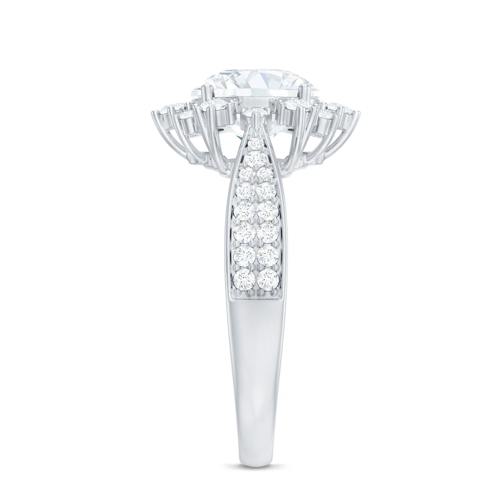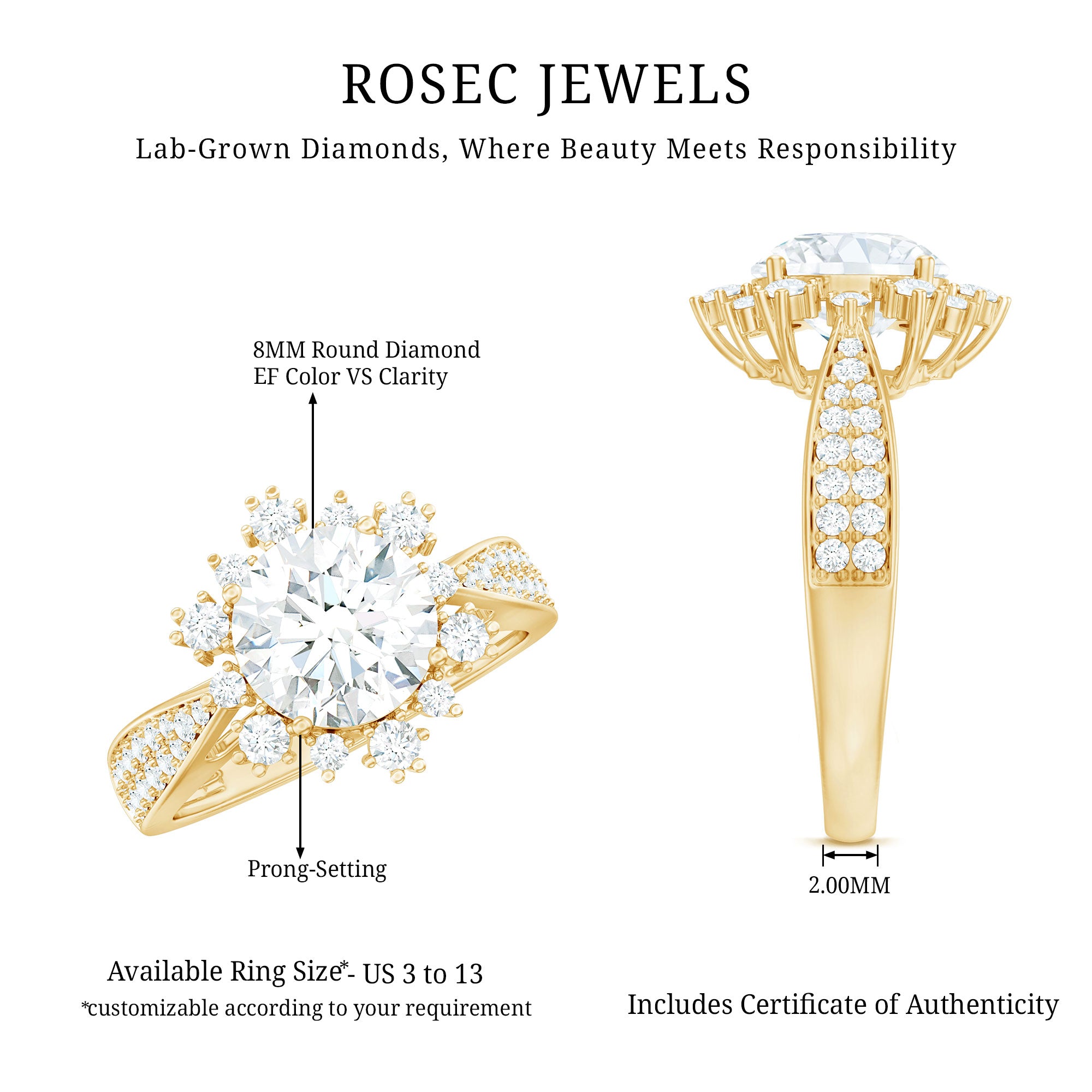 Treat the one you love with this captivating 2 carat Diamond Engagement Ring that is sure to make her heart skip a beat. This Halo Engagement Ring is curated with an 8 MM round shaped diamond (lab grown) set in prong setting, commanding attention with its brilliance. Surrounding the centerpiece is a halo of smaller diamonds, set in a celestial sunburst pattern that amplifies its radiance. The secure prongs holding each gem add a regal touch, ensuring safety while maintaining a modern look. The pinched shank of this Statement Ring is also adorned with diamonds providing more sparkle to the design and making it a perfect choice for your big day. With its timeless design, captivating shimmer, and meaningful craftsmanship, this is the Best Engagement Ring for Her, embodying the promise of forever in the most dazzling way possible.