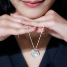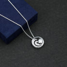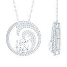 Inspired by the Tranquil waves this Moissanite Designer Pendant is precisely crafted with 14K White Gold Plated Silver. It features an 8 MM Round Shape Moissanite securely placed in Prong Setting and adorned with the stone studded wave metallic motif. This Circle Pendant bears a classic shine of D-VS1 quality Moissanite which makes it the perfect option to complete your look. This pendant will dangle with a sturdy cable chain which makes it perfectly sit on the neckline making you look dazzling. This pendant can be presented as a gift for your special one and make the moment memorable forever.