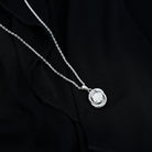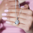 Swirl with confidence by wearing this Moissanite Pendant Necklace, which is handcrafted with white gold plated silver. This classic pendant features an 8 MM Round Shape Moissanite of D-VS1 Quality placed at the center of a metallic swirl pattern, partially embedded Smaller Moissanite. This Swirl Necklace adorns the neckline beautifully and completes the look for the day. This Round Pendant Necklace can be layered with other necklaces to achieve a signature look or can worn solely to achieve a minimal yet statement look. This classic pendant can be the perfect option for a gift for your beloved while celebrating a relationship milestone.