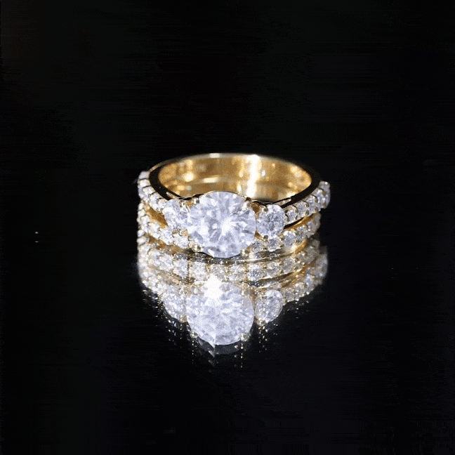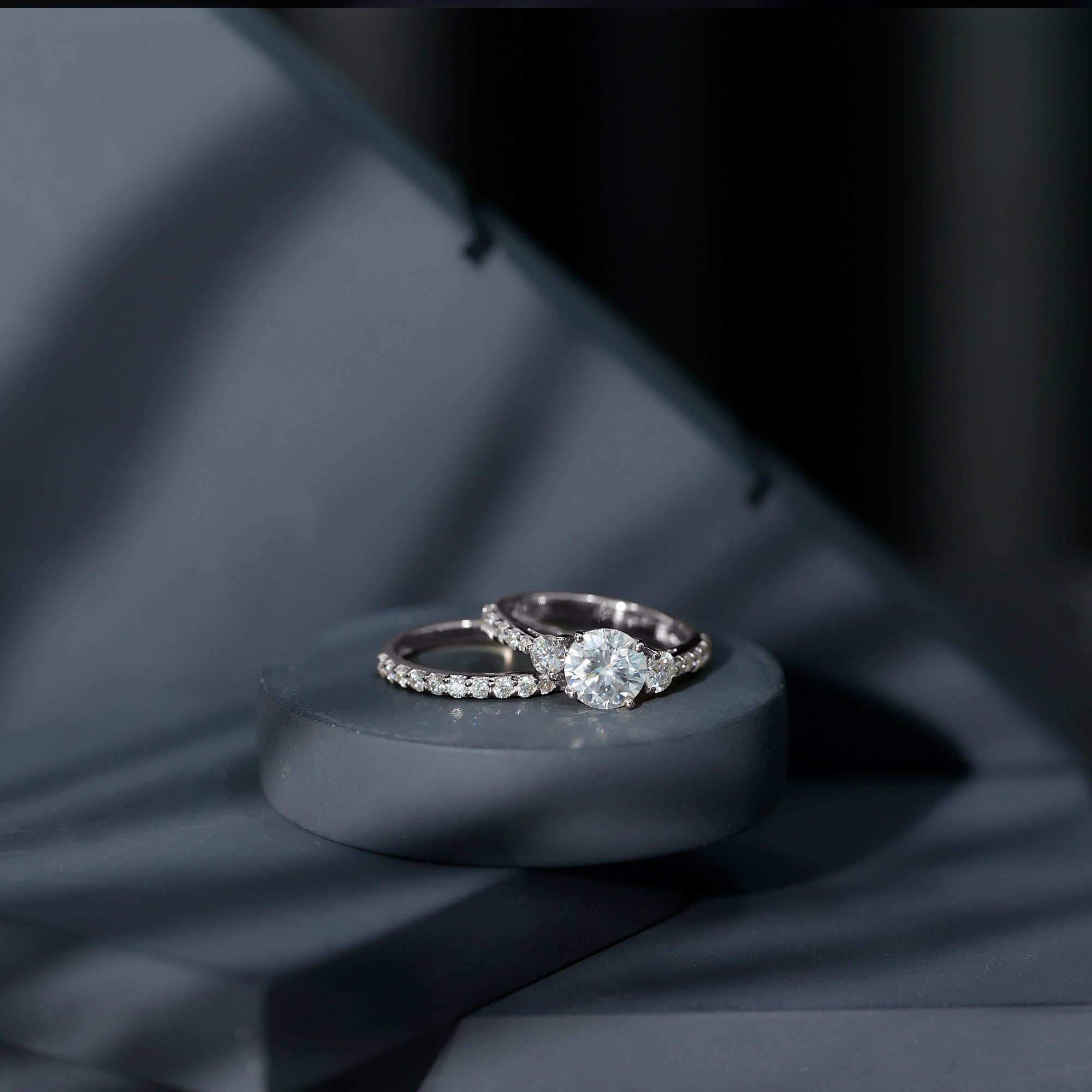 This Moissanite Wedding Ring Set is made for couples who want their love to shine in a meaningful way. This Moissanite Engagement Ring Set tells its story through its design. The engagement ring has three bright stones, each one showing an important part of your journey together - where you started, where you are now, and where you hope to go in the future. The center stone is an 8 MM Moissanite, and it is supported by two 4 MM round Moissanite stones that add balance and harmony. The band of the engagement ring includes small side stones arranged in a gentle pattern. Besides, the matching wedding band offers a simple and graceful look. It is a half eternity band lined with small Moissanite stones that sparkle in a steady row. These stones symbolize the little moments that build a strong and lasting bond. Made with D-VS1 quality Moissanite, every stone in this Wedding Bridal Ring Set is clear, bright, and full of life. This Engagement Ring and Wedding Band Set can be exchanged during a wedding, given on an anniversary, or gifted as a promise of what is to come. No matter the moment, it serves as a gentle reminder of the love, trust, and hope shared between two people.