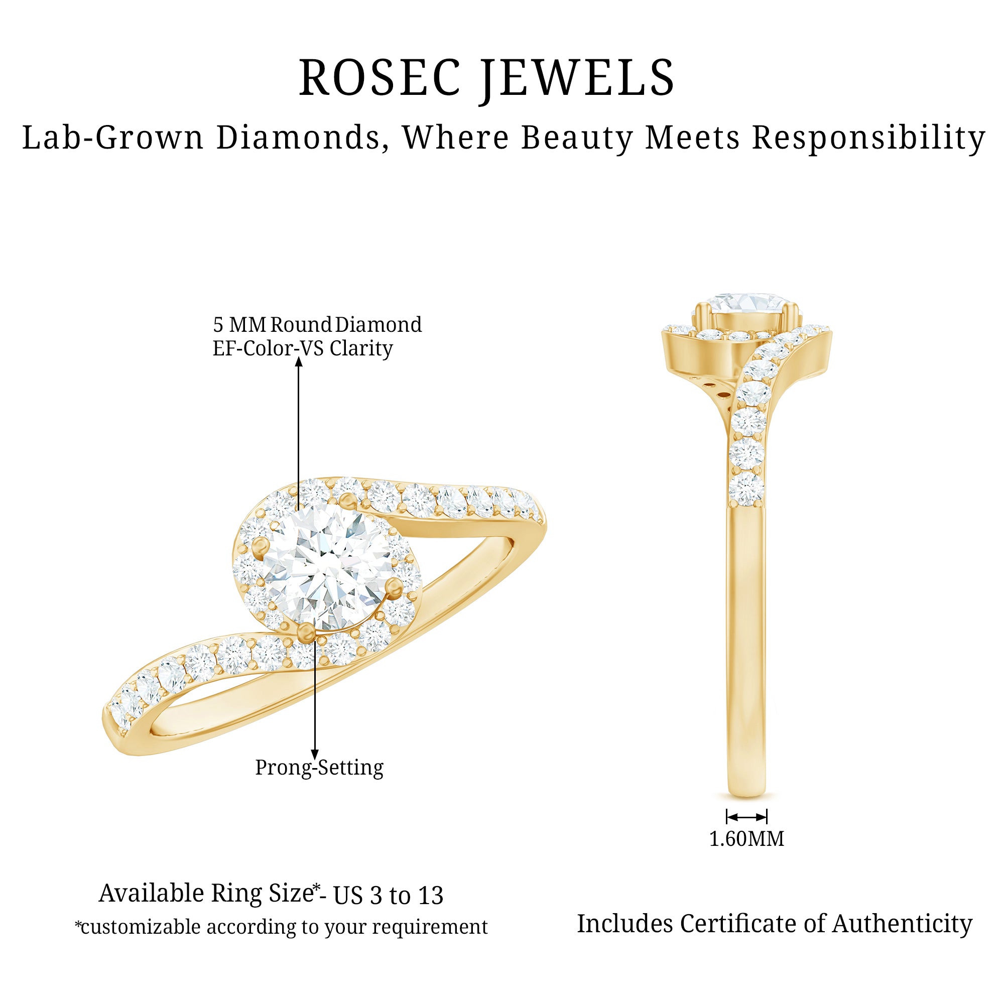 When it comes to an Engagement Ring for Women, everyone wants something timeless, elegant and full of brilliance. This Round Diamond Ring checks all the boxes. It is not just a Bypass Ring it is a symbol of forever, a promise wrapped in diamonds, and a daily reminder of the love you share. Embellished with 5 MM round cut lab grown diamond of EF-VS quality in the center in a safe prong setting. Encircling the main stone is a delicate halo of round cut diamonds that seamlessly connects with modern bypass shank. Every gemstone in this Diamond Engagement Ring is lab grown and certified because Rosec Jewels believes in creating jewelry that is as sustainable and ethical, as it is breathtaking.