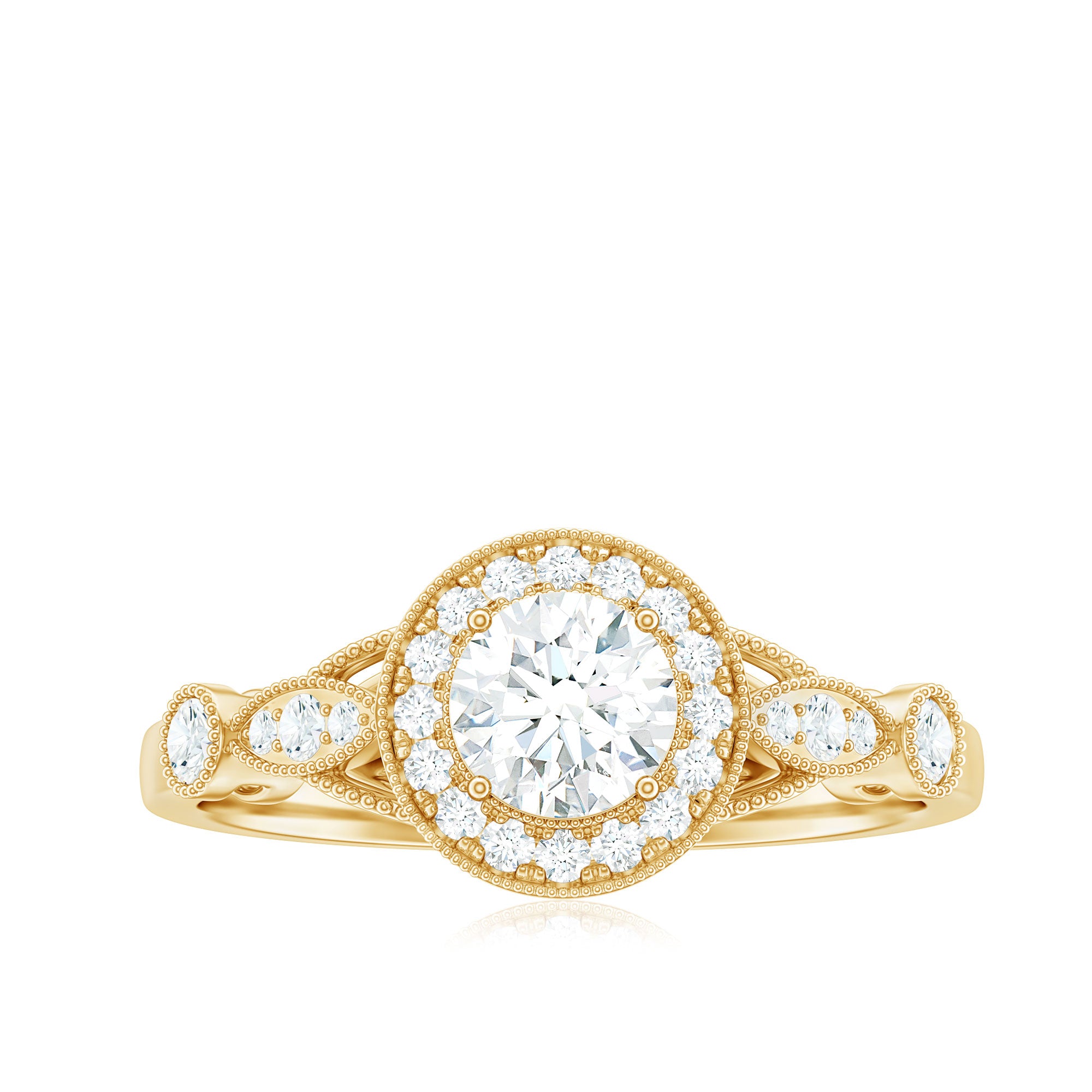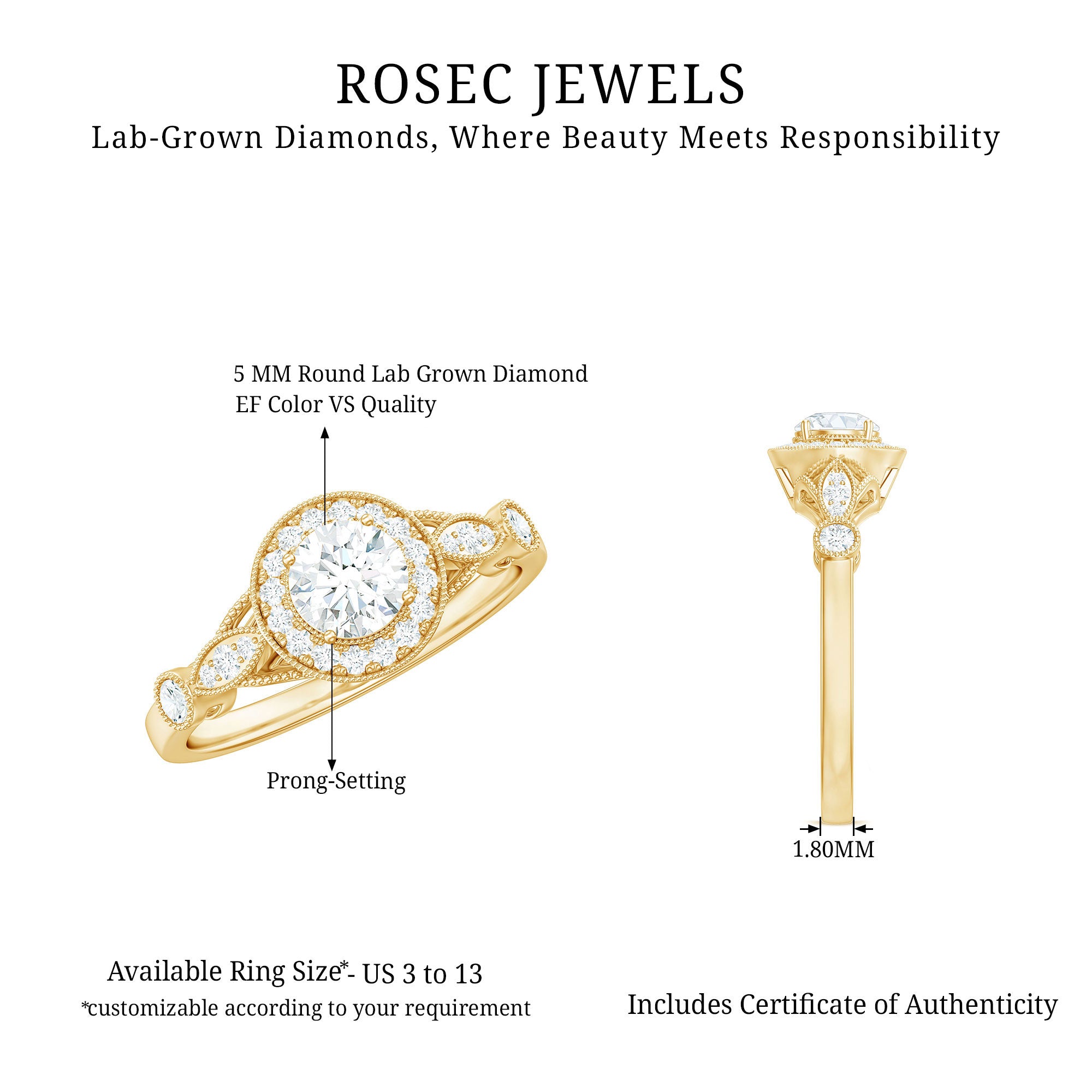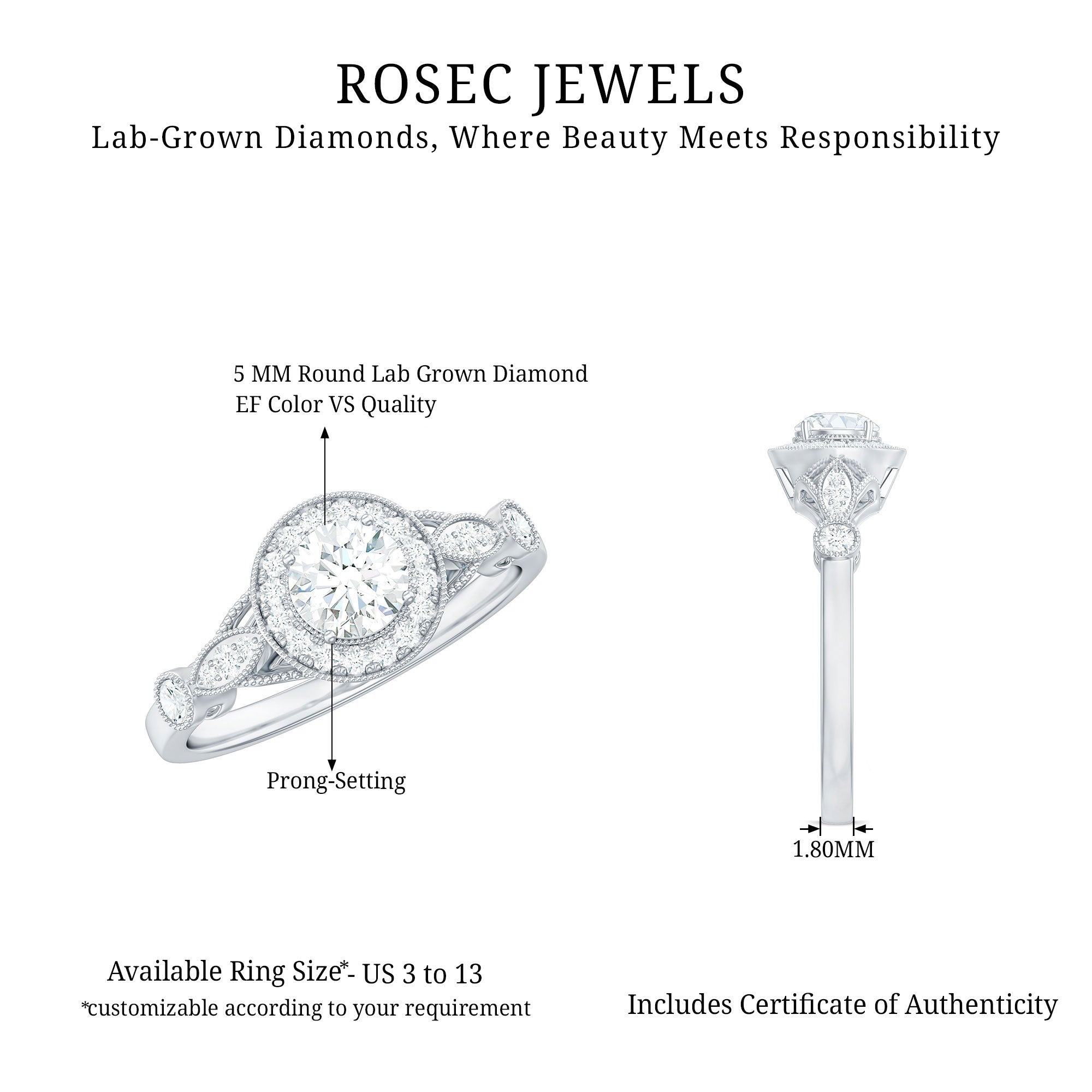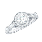 Capture the romance and elegance of bygone eras with this Vintage Style Engagement Ring. At its center is a 5 MM round-cut diamond, surrounded by a halo of smaller stones and intricate beaded detailing. Additional diamonds are set within marquise-shaped frames on either side of the center stone, adding depth and sophistication. This Round Diamond Ring is a true masterpiece, featuring vintage-inspired elements that are perfect for the bride seeking a unique piece with old-world craftsmanship. Every gemstone in this Antique Engagement Ring is lab-grown and comes with a certificate of authenticity, providing you with complete peace of mind about your purchase.