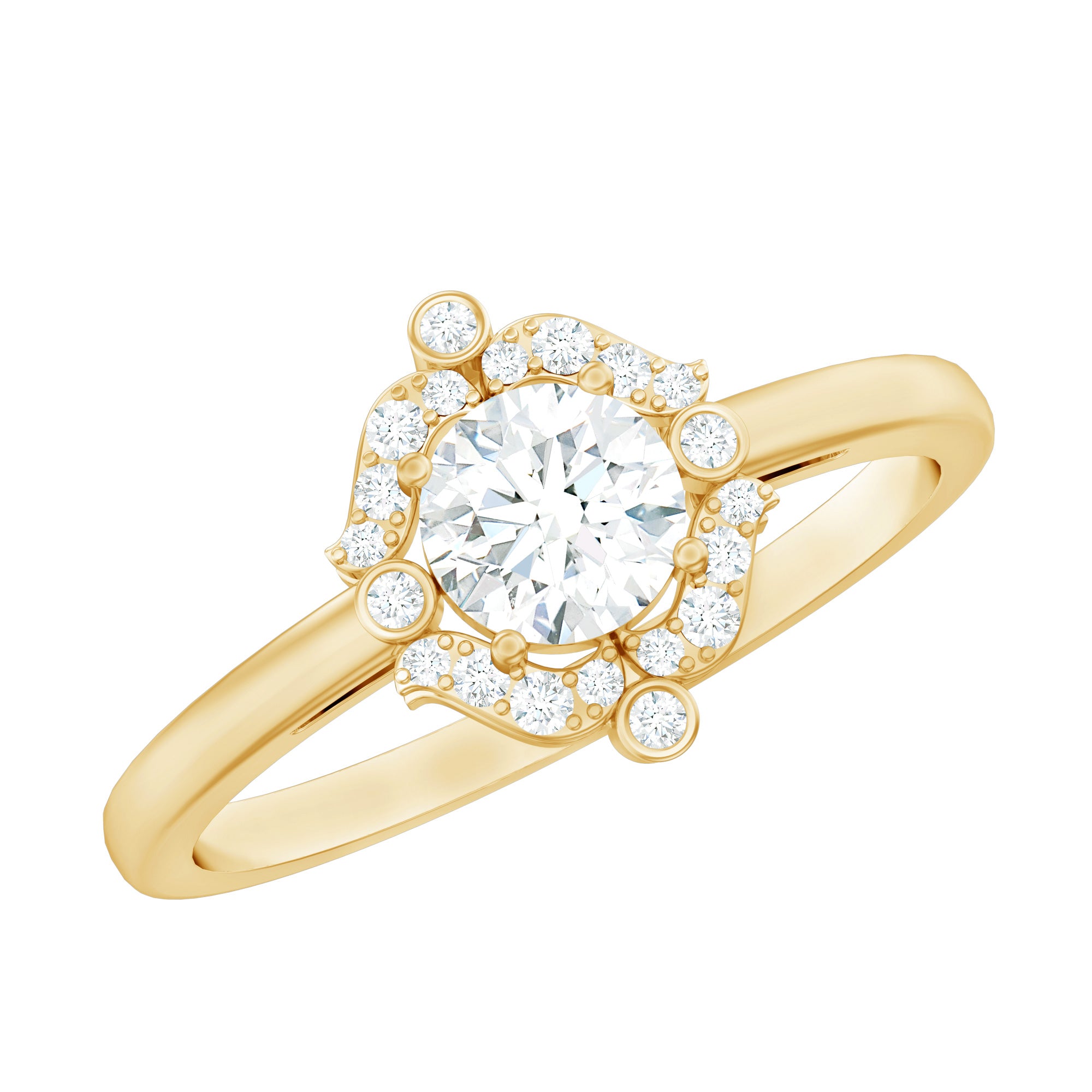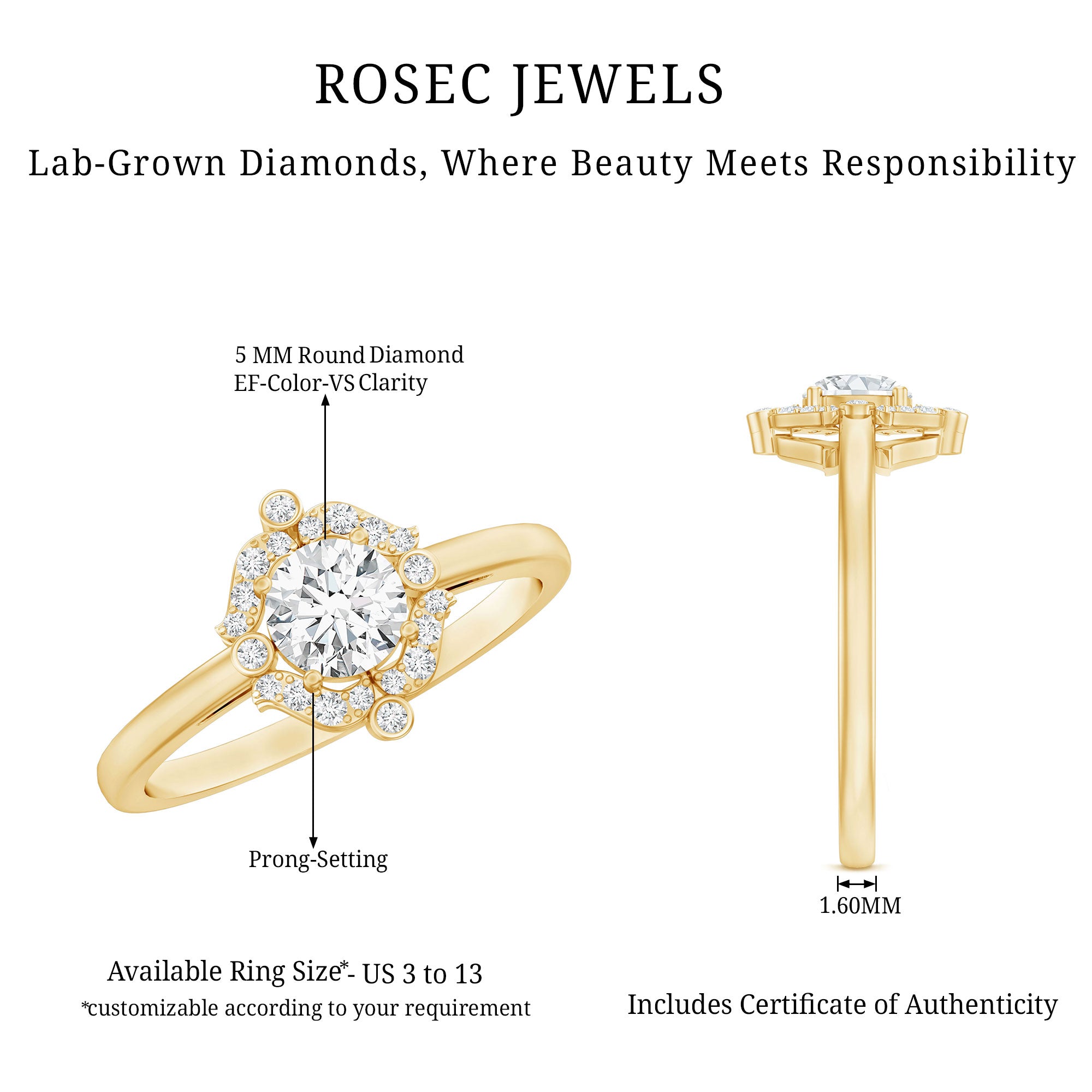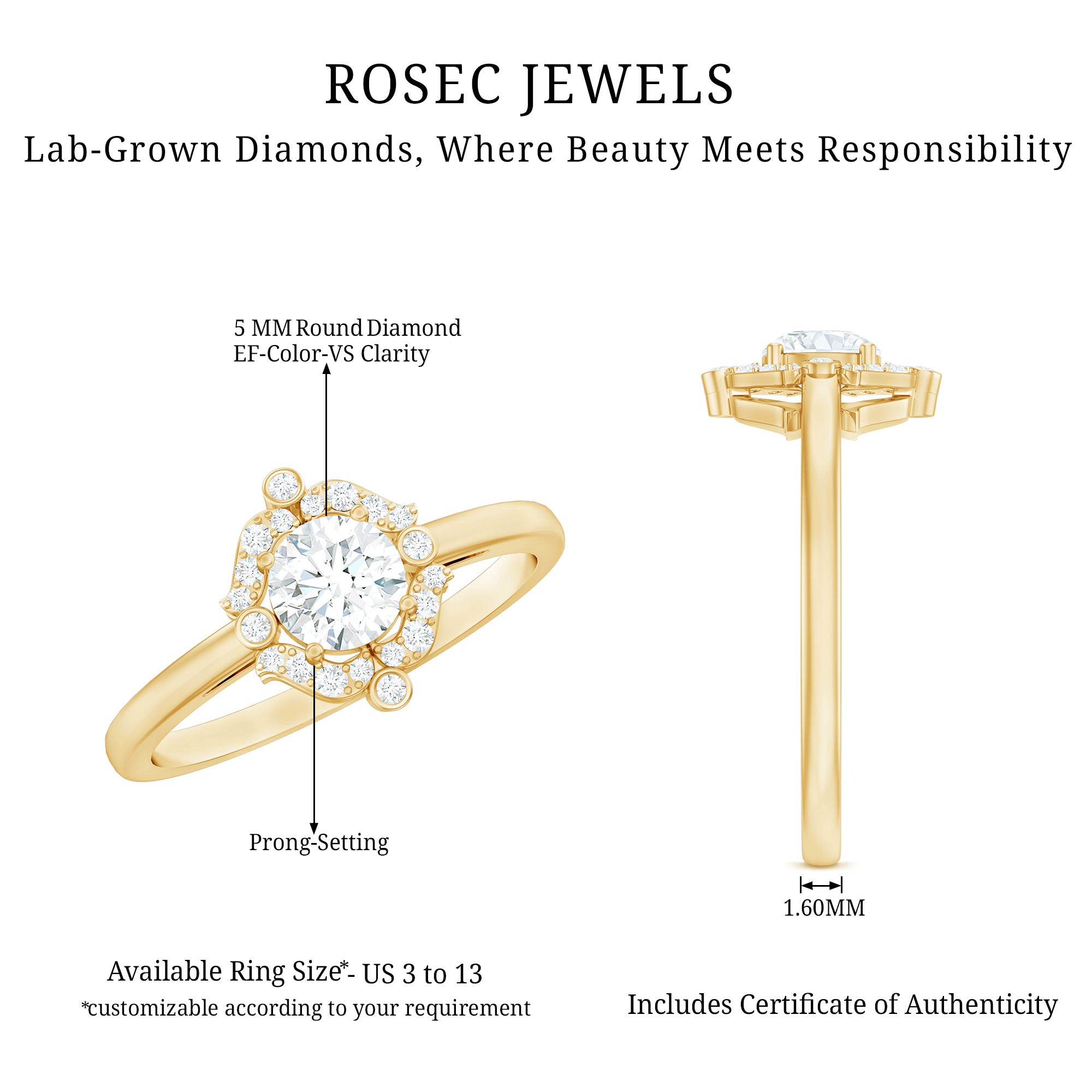 This Art Deco Engagement Ring is a stunning symbol of love and commitment, designed to leave a lasting impression. Featuring a beautiful 5 MM round shaped lab grown diamond of EF-VS quality set in prong setting. The center stone of this Estate Engagement Ring is encircled with a carefully placed unique diamond halo. These smaller stones add more sparkle, gracefully framing the centerpiece and making the Lab Diamond Ring extra radiant and eye-catching. Crafted with precision, this Round Cut Diamond Ring offers unparalleled radiance, durability, and ethical brilliance. Presented in a premium box, its the perfect choice for a moment youll cherish forever.