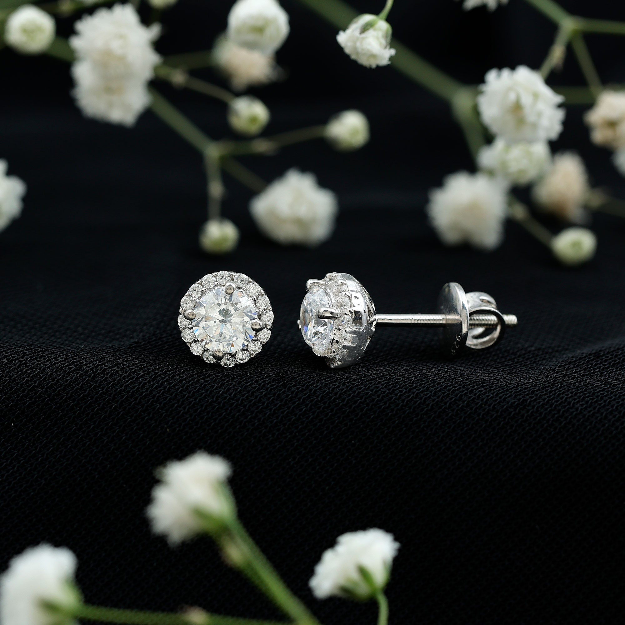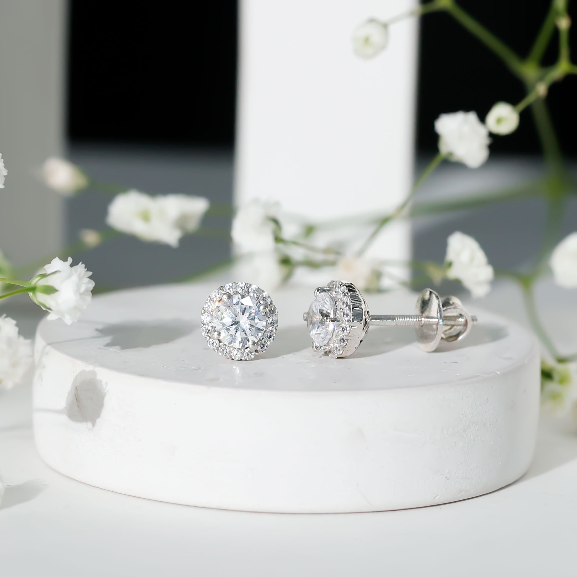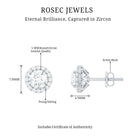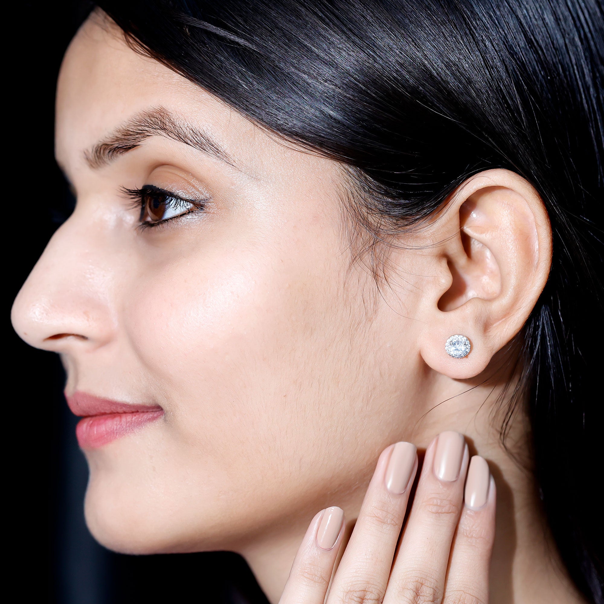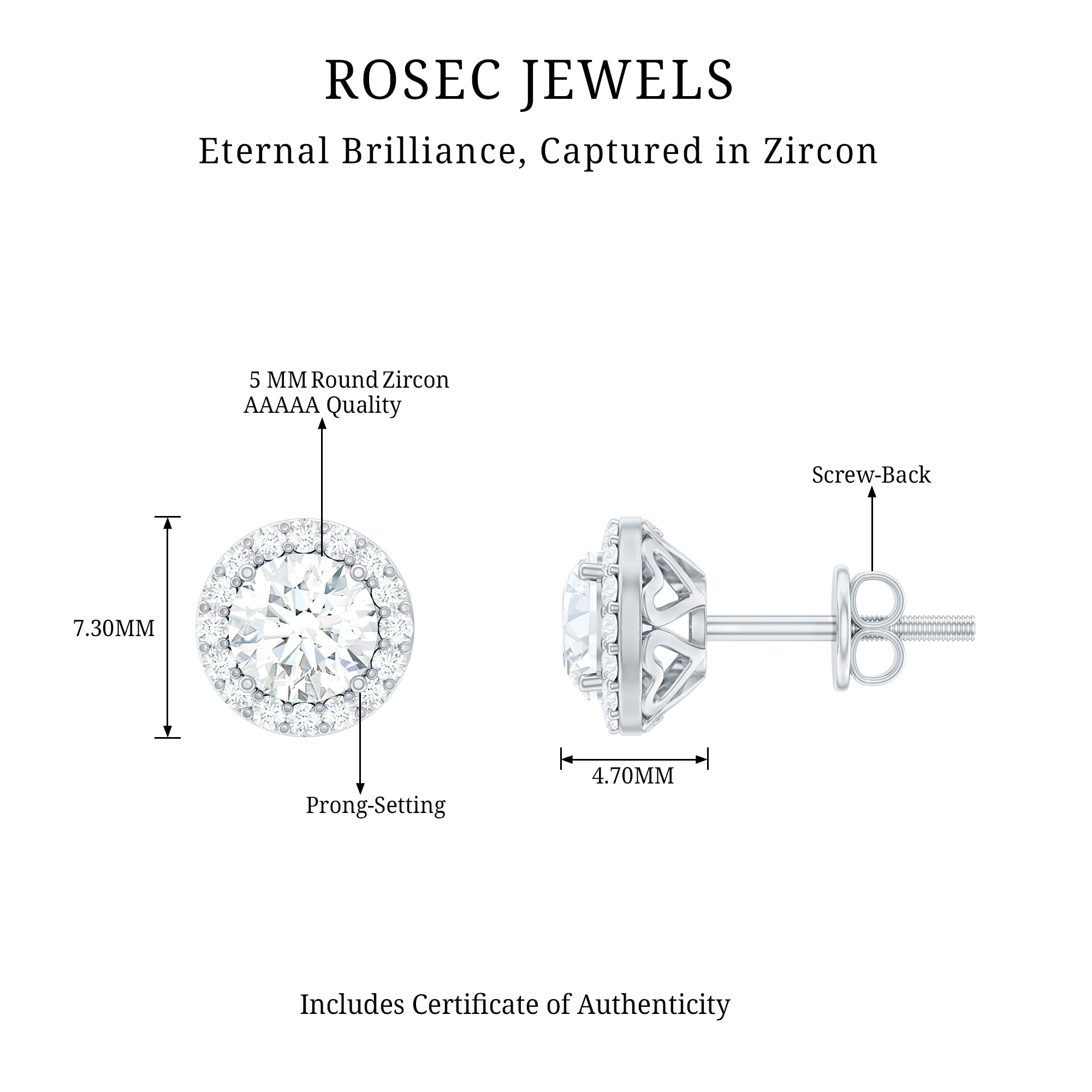 Discover the stunning Cubic Zirconia Stud Earrings designed just for you. Elevate your look for any occasion with the exquisite CZ Studs from Rosec Jewels. These halo earrings enhance the beauty of your ears effortlessly. Round cut Wedding Stud Earrings are a favored option for everyday wear, offering a classic and timeless appeal. The round brilliant cut is traditionally the most popular shape, ensuring a look that never goes out of style. The halo wedding earrings showcase exquisite round brilliant cut cubic zirconia stones that elegantly encircle the prong set 5 MM center stone, adding an enchanting touch. Crafted from ultra-luxurious sterling silver and plated with 14K White Gold, these dramatic Simulated Diamond Earrings exude sophistication. The screw back closures ensure a secure and comfortable fit, keeping the earrings perfectly positioned on your lobe. Whether youre treating yourself or gifting a loved one, these everyday earrings are a perfect addition to any jewelry wardrobe. They are like an upgrade to a more impressive pair, or a cherished family heirloom - timeless and versatile for any occasion.