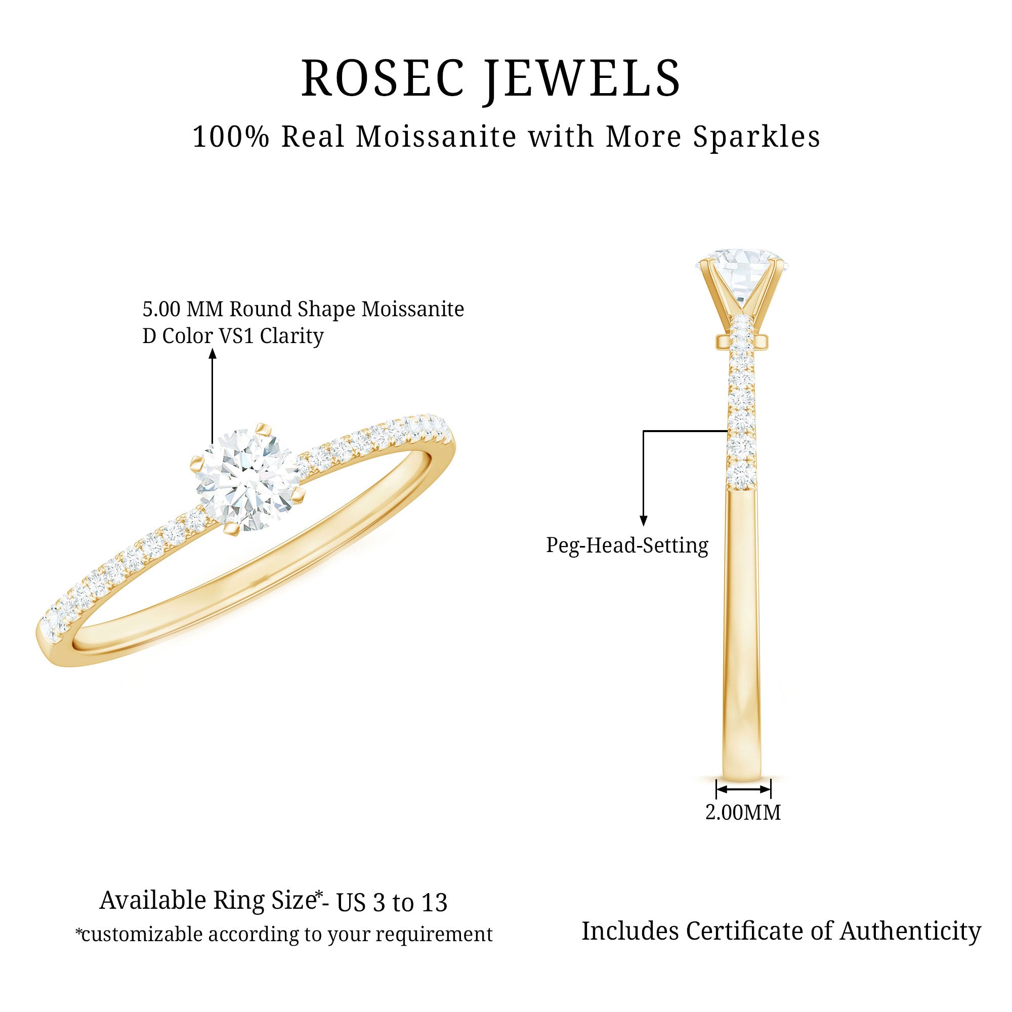 Make your style quotient the talk of the town with this Moissanite Solitaire Ring. It features 5 MM Moissanite beautifully set in Peg Head Setting along with the shank adorned with side stones. Make the promise of love to her with this ring which reflects the adorable shine of D-VS1 Quality Moissanites making it perfect to make her smile. This Proposal Ring can elevate your day-to-day look with a hint of shimmer. Get your lady this Moissanite Promising Ring and witness a priceless moment that will be cherished forever.