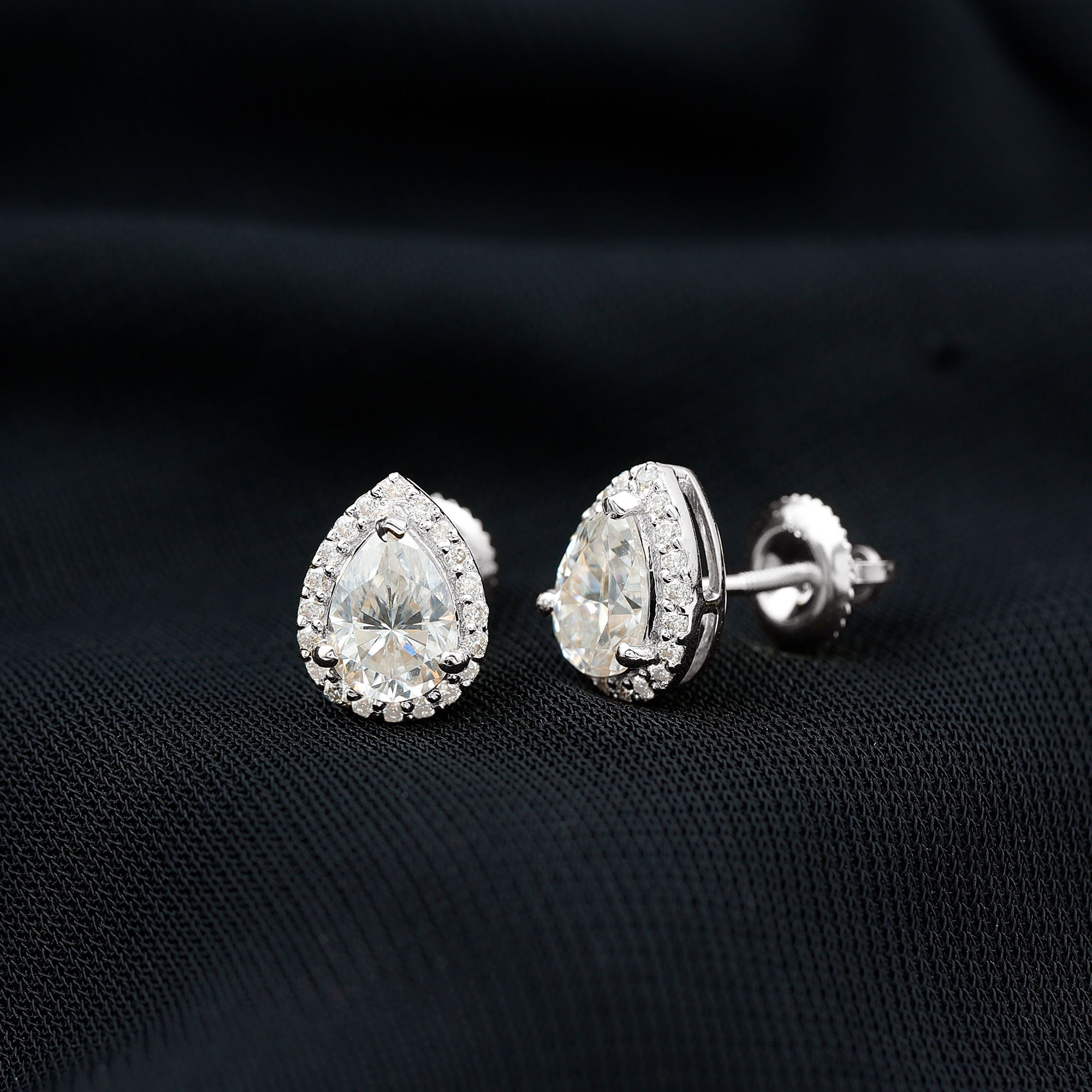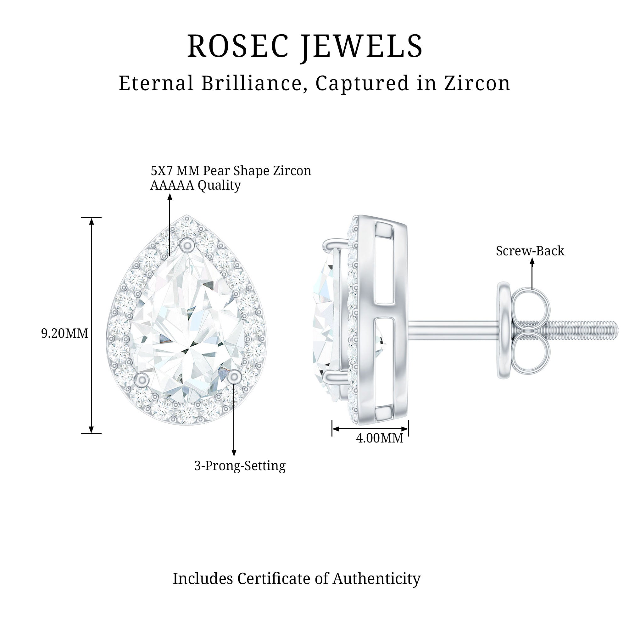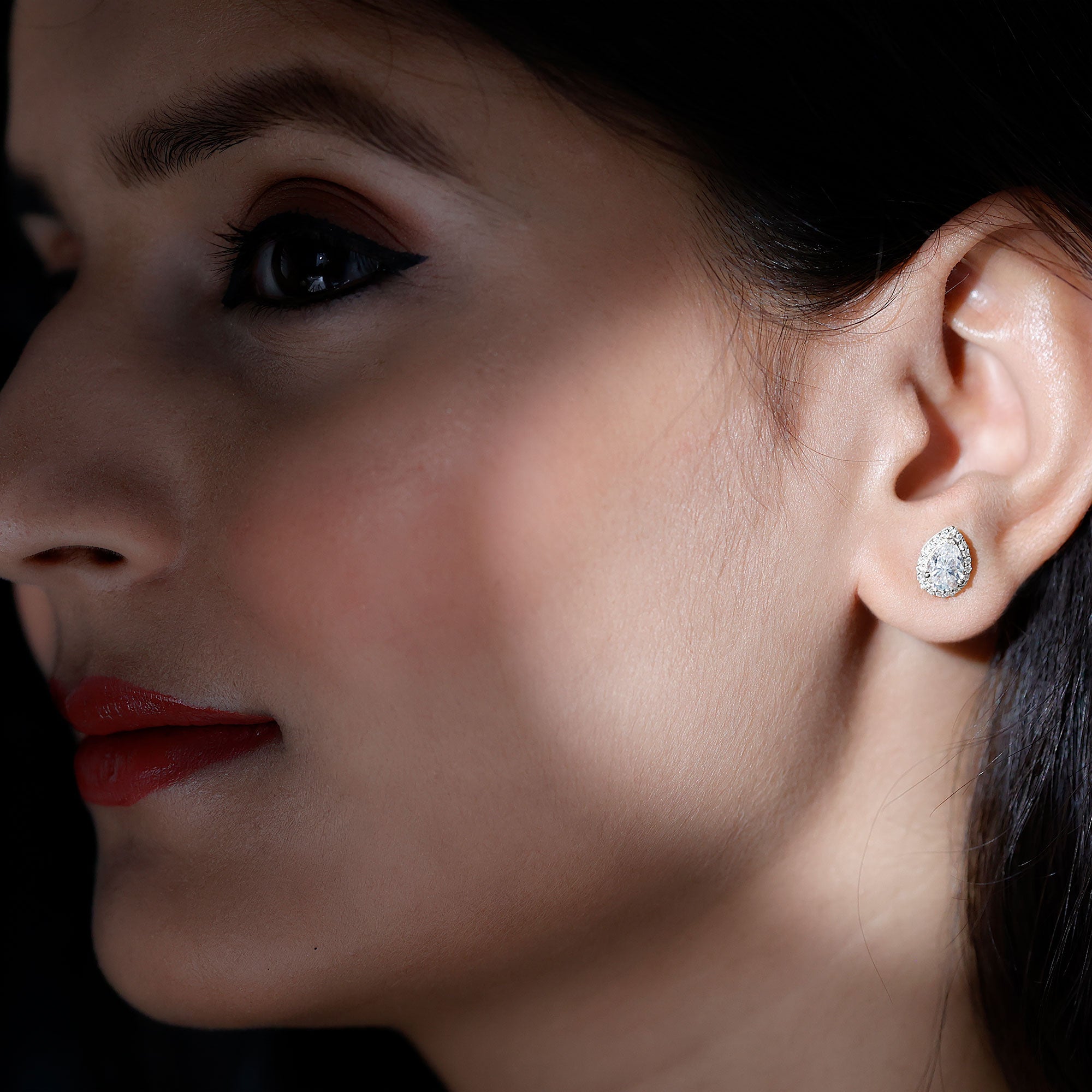 Who doesnt love a pair of pears? Especially when they are surrounded by a halo of sparkling round stones. Crafted from 14k white gold plated sterling silver, these exquisite Teardrop Bridal Earrings feature 5X7 MM pear-cut zirconia elegantly framed by round-cut stones securely held in prong setting. She will be enchanted by the dazzling beauty of these Cubic Zirconia Studs. Perfect for an evening out with friends, a romantic date, or any event where you want to make a statement. These lightweight and comfortable earrings are designed with secure screw back closures for all-day wear, effortlessly transitioning from daytime sophistication to nighttime allure, making them a versatile addition to any jewelry collection. Not every occasion requires bold accessories, and layering these simple Pear Stud Earrings allows you to highlight the finer details. Elevate your look with these Zirconia Halo Earrings, which bring a distinctive and artistic touch. The subtle elegance of these CZ Diamond Earrings guarantees their timeless appeal, ensuring they remain a staple in your collection for years. Adorn your ears with these sophisticated studs, as their enchanting allure is sure to impress.