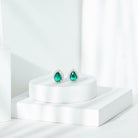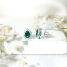 Elevate your collection with these gorgeous Lab Grown Emerald Stud Earrings that exude timeless elegance. Expertly handcrafted from 14k white gold plated silver, these Halo Studs combine the tranquil allure of evergreen beauty with exceptional craftsmanship. Each earring features a vibrant prong set 5X7 MM pear shaped lab created emerald, celebrated for its deep green color and AAAA quality. The emeralds rich, lush hue mirrors the splendor of natures best offerings, while also being an ethically sourced, eco-friendly option, making these Teardrop Stud Earrings not just stunning but also kind to the planet. Encircling the central stone is a fine round cut moissanite halo that sparkles and shines from every angle. The Pear Shaped Emerald Earrings are designed with secure screw back closures, providing a comfortable and safe fit for everyday wear or special events. Own a piece of jewelry that not only enhances your style with its beauty but also reflects your appreciation for nature and conscious luxury.