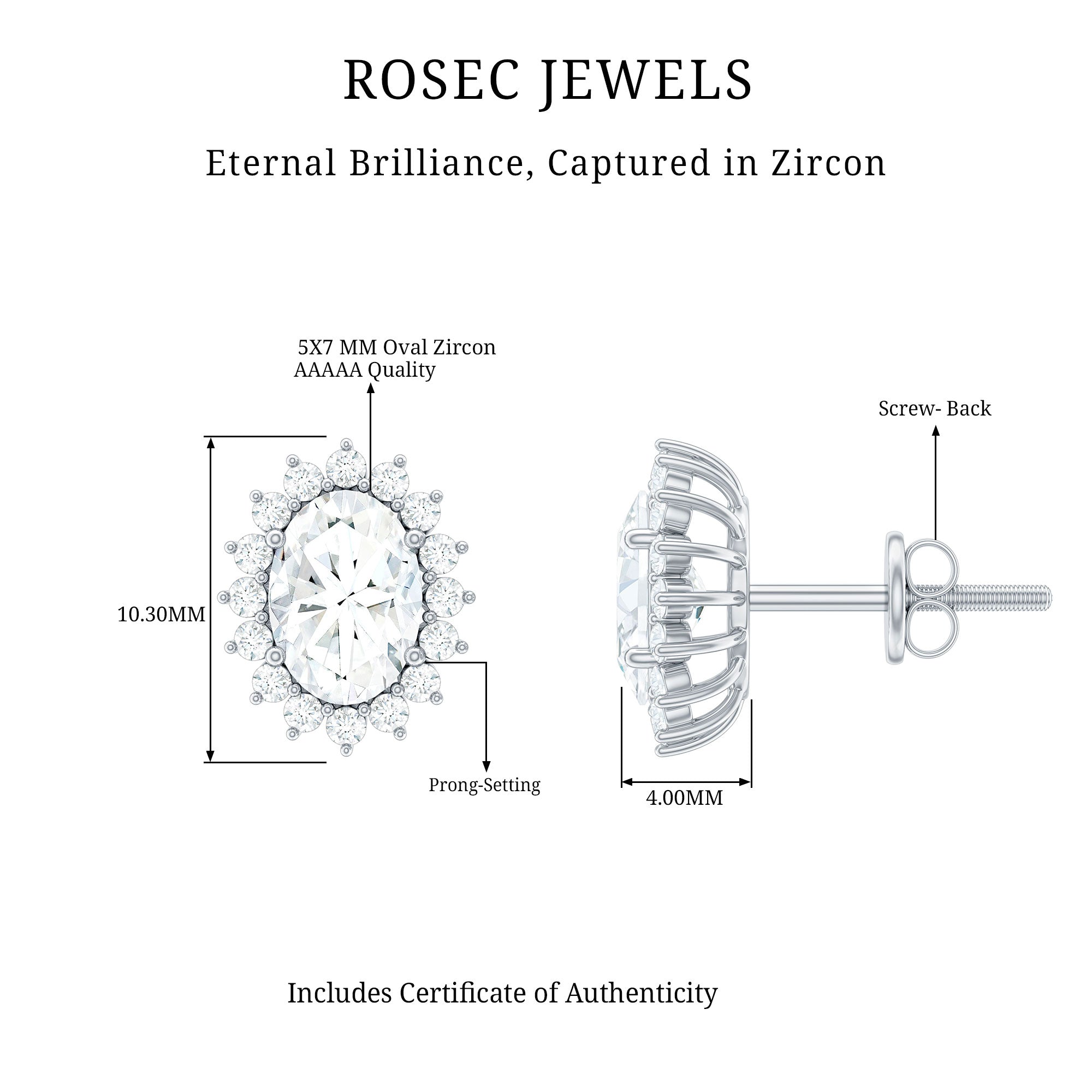 Make your presence noticed with these CZ Stud Earrings, crafted in 925 Sterling Silver with white gold plating. The big earrings feature a 5X7 MM Oval Shape Zirconia secured in Prong Setting and encircled by a Halo of Smaller stones that dazzle the appearance. These Halo Earrings have a screw back closure that keeps them safe and secure throughout the day. These Zircon Earrings can be an ideal gifting option for your lady love on the special occasions such as anniversary or birthday. The adorable shine of AAAAA Quality Zircon which makes these earrings perfect to be worn with special day fits. The earrings are shipped to you in a premium packaging securely kept in a signature jewelry pouch.