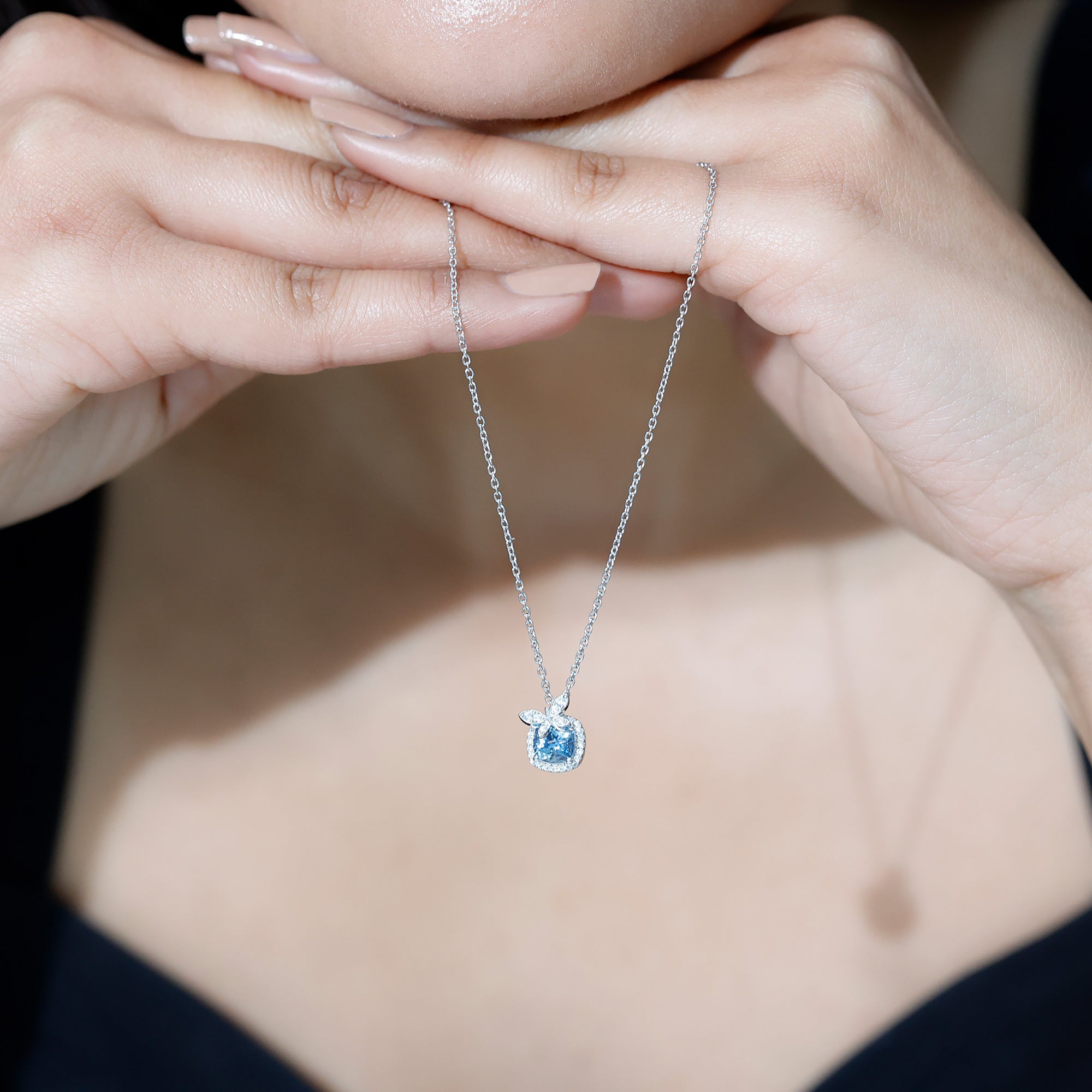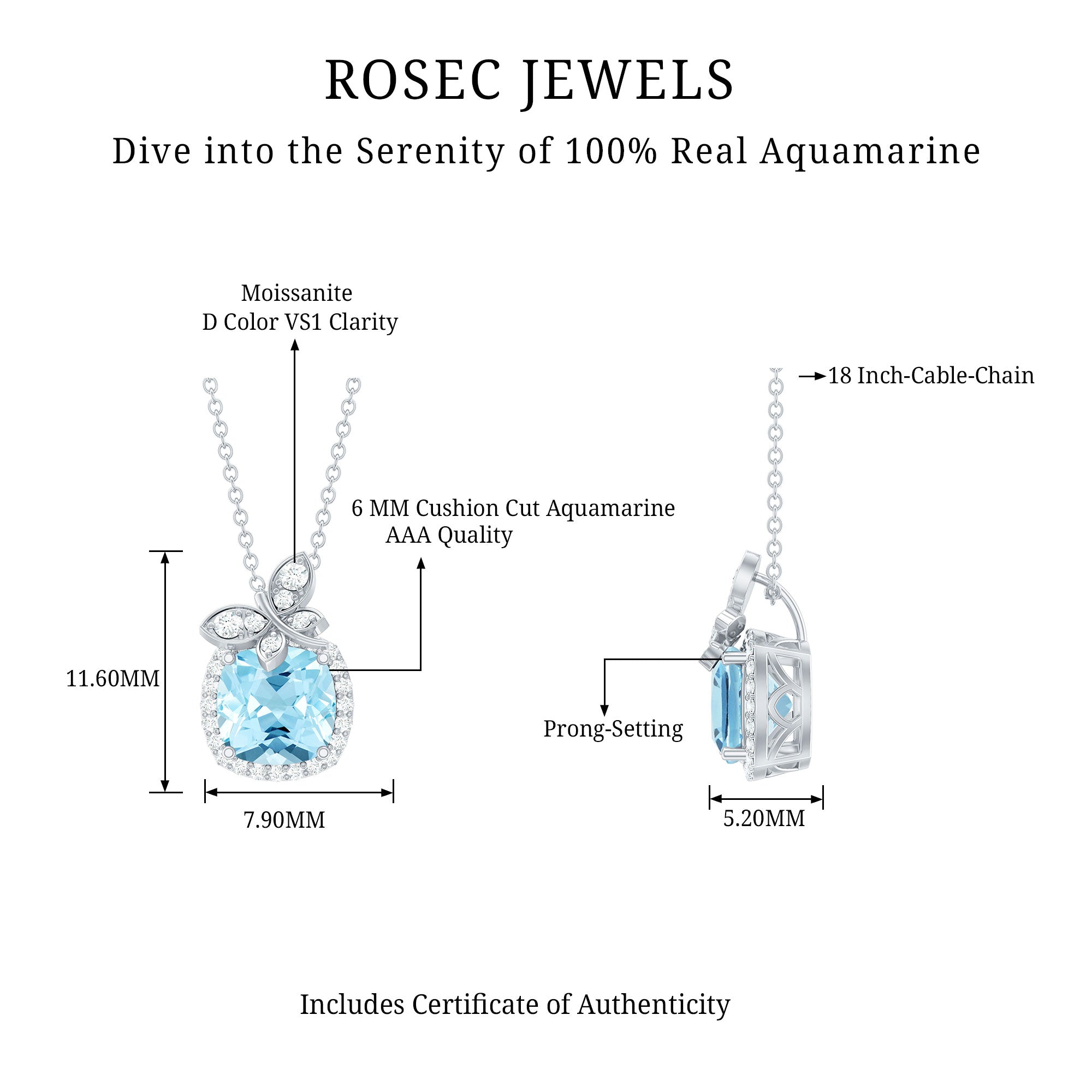 Certified 6 MM Cushion Aquamarine Halo Pendant with Butterfly Motif