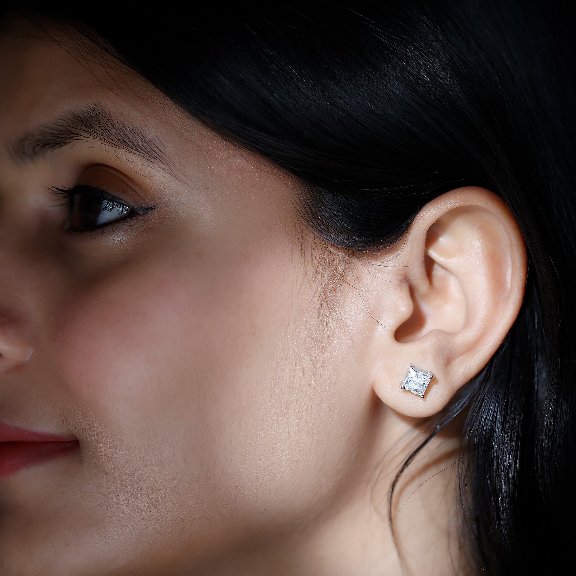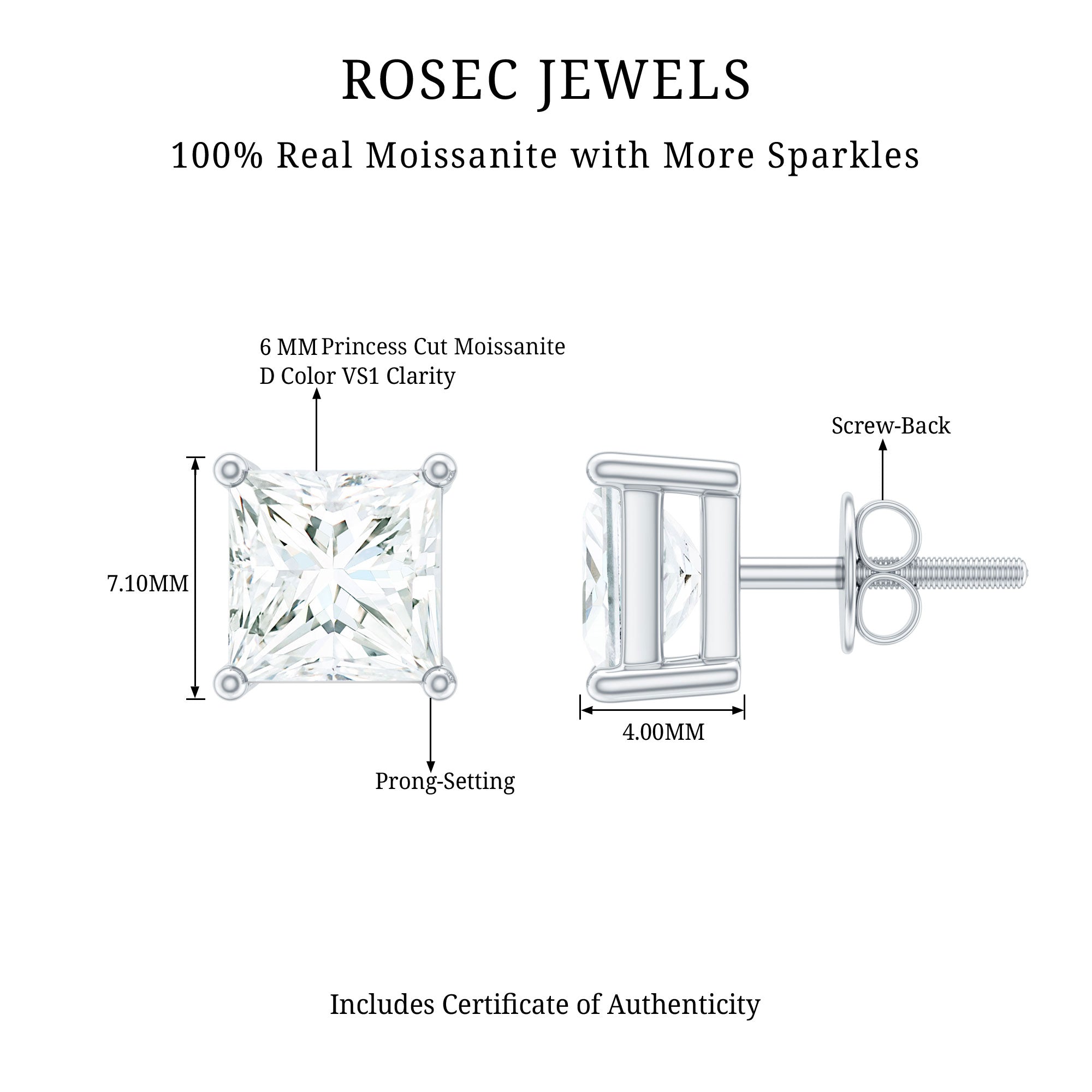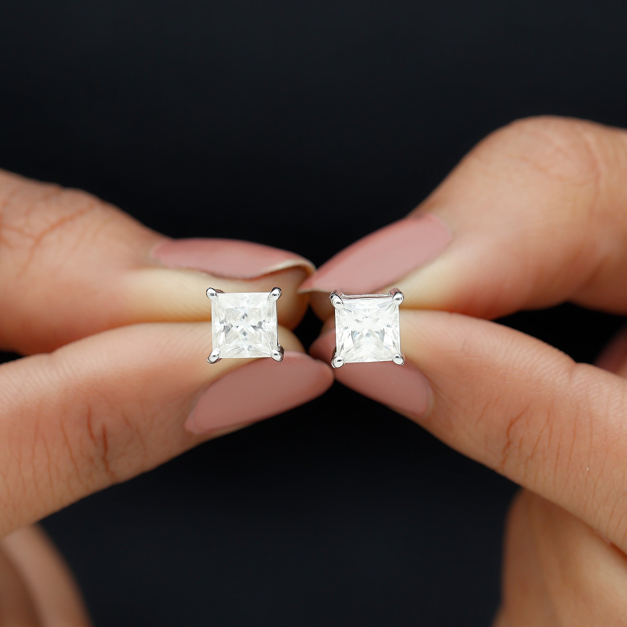 Classic, simple and beautiful – these exquisitely crafted Single Stone Earrings are the perfect investment for any lady with a preference for timeless, understated designs. This beautiful pair of white gold plated Silver Moissanite Earrings exemplifies how modern cuts can elevate your everyday style. Expertly made and featuring a meticulous selection of D color VS1 clarity moissanite, each earring displays outstanding craftsmanship. These Solitaire Studs are crafted with 6 MM princess cut moissanite, selected for their unmatched beauty and brilliance. Each stone is securely held in a sophisticated 4-prong setting, reflecting light beautifully with every movement. These Everyday Earrings comes with screw back closures for comfort and safety. Sleek and contemporary, these Princess Cut Studs are always a popular choice for gifting to a loved one on their birthday or a special anniversary.