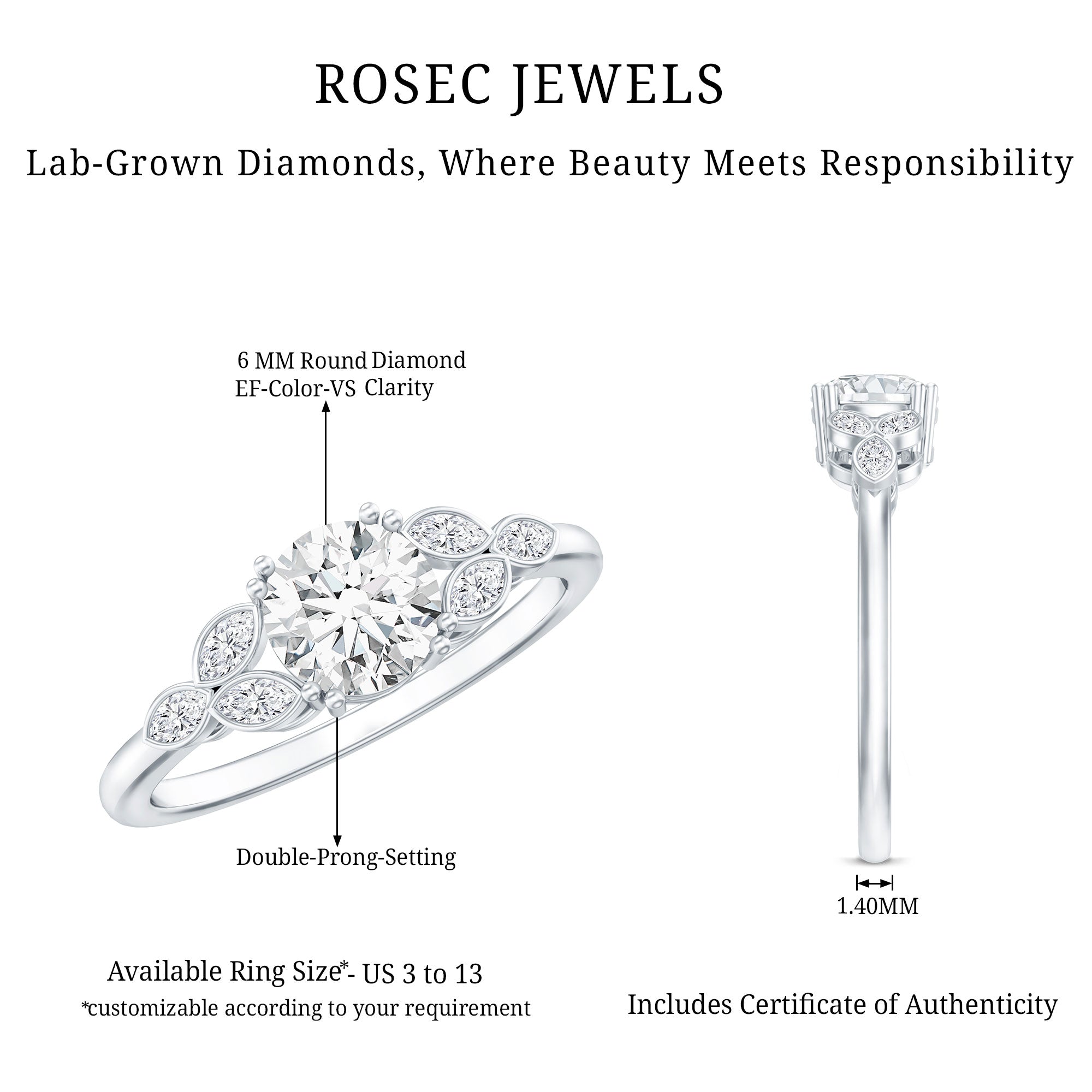 Celebrate love with timeless elegance and a touch of artistic charm in this Promise Engagement Ring. Embellished with a 6 MM Round Shape Lab Grown Diamond set in Double Prong Setting as a centerpiece, known for its exceptional clarity, brilliance, and ethical sparkle. What makes this Lab Grown Diamond Ring truly special is the unique trio of horizontally placed Marquise Shape Lab Diamond stones on each side of the center stone, forming a delicate leaf like motif that adds a romantic twist. Designed to symbolize eternal love and growth, this 1 Ct Lab Grown Diamond Ring beautifully blends tradition with modern creativity. Perfect for proposals or heartfelt promises, this Round Diamond Engagement Ring (Lab Created) is a meaningful reminder of the moments that matter most. Handcrafted with perfection and attention to detail, this Man Made Diamond Engagement Ring is ideal for daily wear and forever memories. Whether you are planning a surprise or picking it together, this Ethical Engagement Ring captures the essence of your story. Let your forever begin with a sparkle that feels just right.