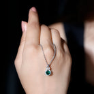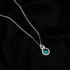 - The Halo Pendant Necklace shines with the luxurious glow of emerald, effortlessly capturing attention, while the sparkling Moissanite beautifully enhances the vibrant green shade.