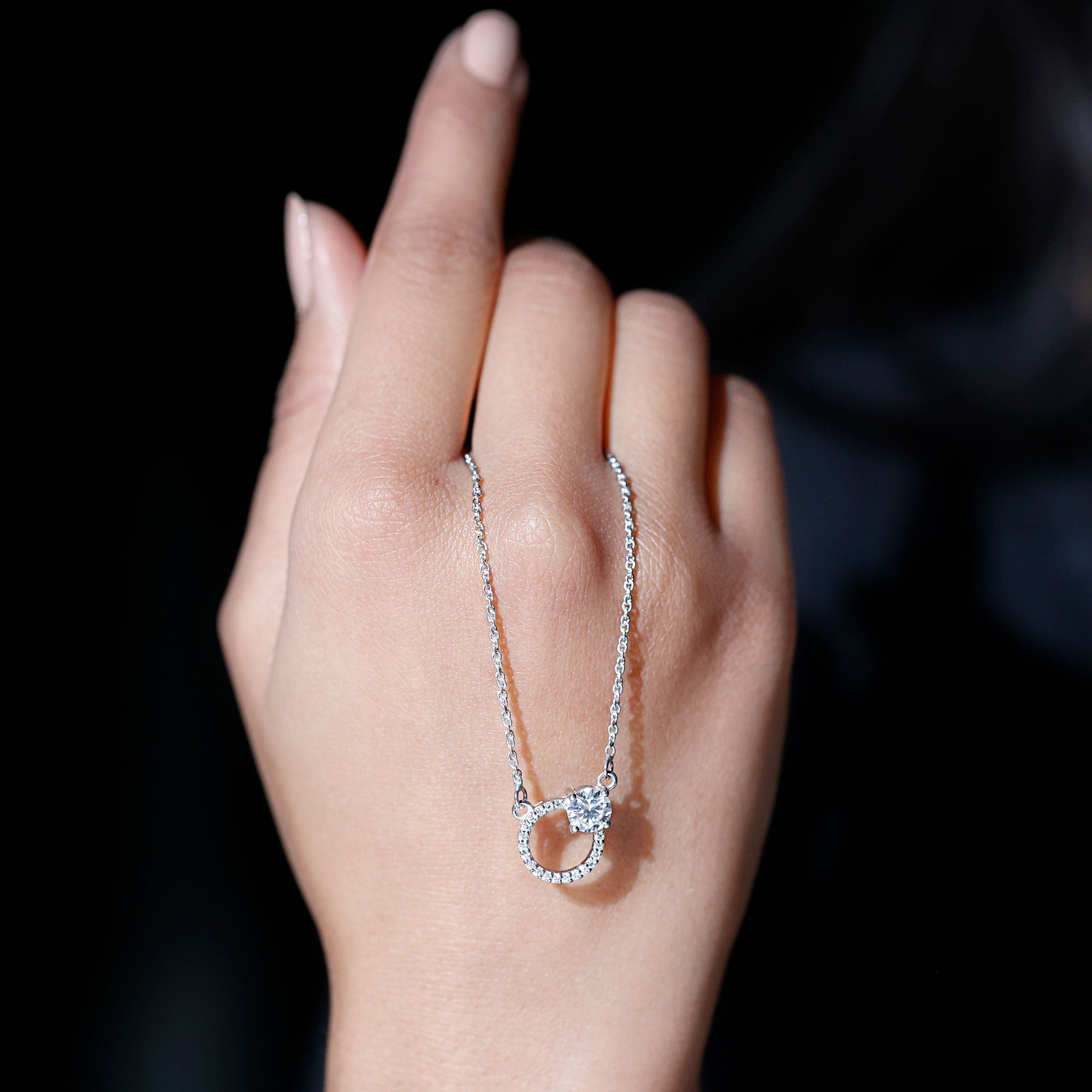 Rosec Jewels Moissanite Circle of Love Necklace is cherished not just for its elegant design but also for its representation of everlasting love. Just like the circle has no beginning or end, love is whole and infinite. Gifting this Round Moissanite Necklace to someone special beautifully expresses your feelings for them. This Circle Pendant Necklace is a sophisticated piece of jewelry, showcasing 20 meticulously hand-set small round cut Moissanite stones alongside a 6 MM Moissanite, all securely held in prong setting. This sophisticated and impressive necklace features a sleek and minimalist design. Wear this pendant on its own or layer it with additional necklace for a contemporary look, this versatile accessory can effortlessly elevate both casual and formal outfits. Whether youre looking for an eye-catching accessory for special occasions or a sophisticated addition to your everyday ensemble, this Eternity Necklace makes an excellent choice. It also serves as a thoughtful gift for anniversaries, birthdays, or just because you want to show your loved one how special they are.
