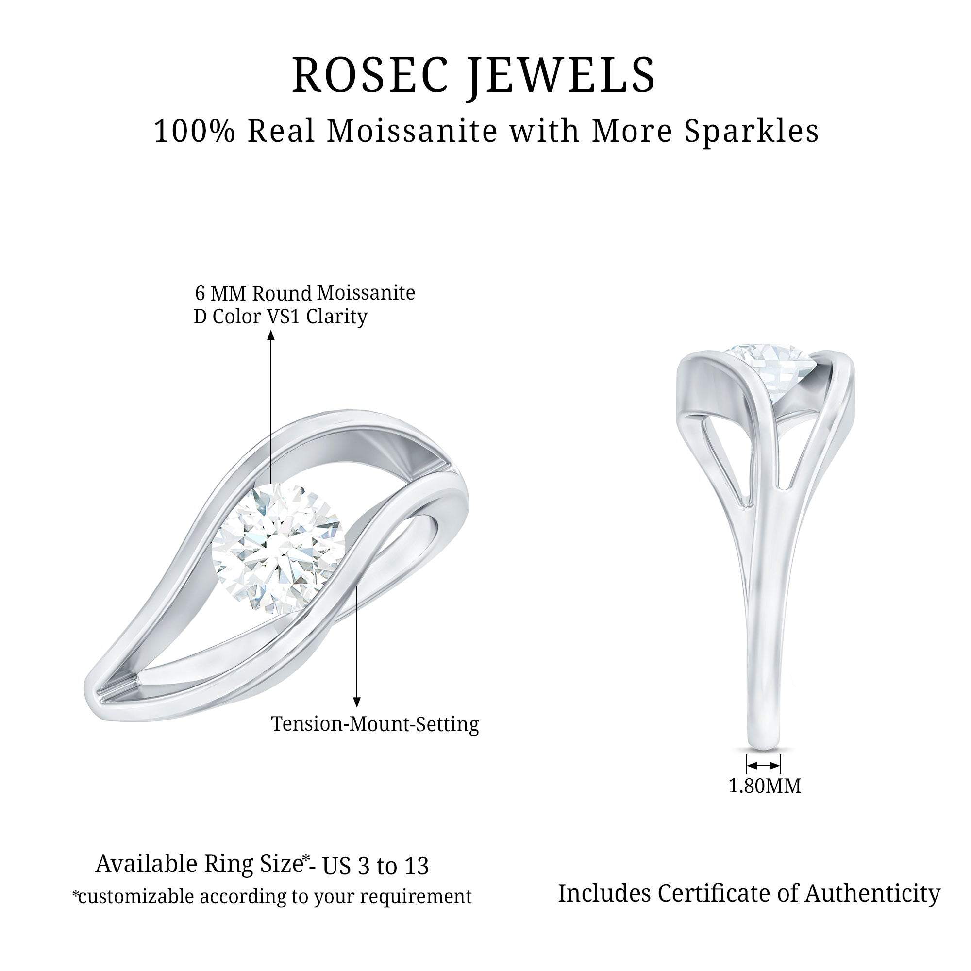 Make a lasting impression with this Moissanite Solitaire Ring. It features a 6 MM Round Shape Moissanite placed elegantly in Tension Mount Setting, on a Curved Shank. This Promise Engagement Ring beholds the shine of D-VS1 Quality Moissanite. Make your commitment to love prominent with this Round Moissanite Ring which dazzles with a timeless shine. Get this Moissanite Ring for your special one and witness a priceless expression. The ring will be delivered to you in the premium quality jewelry box for storage.