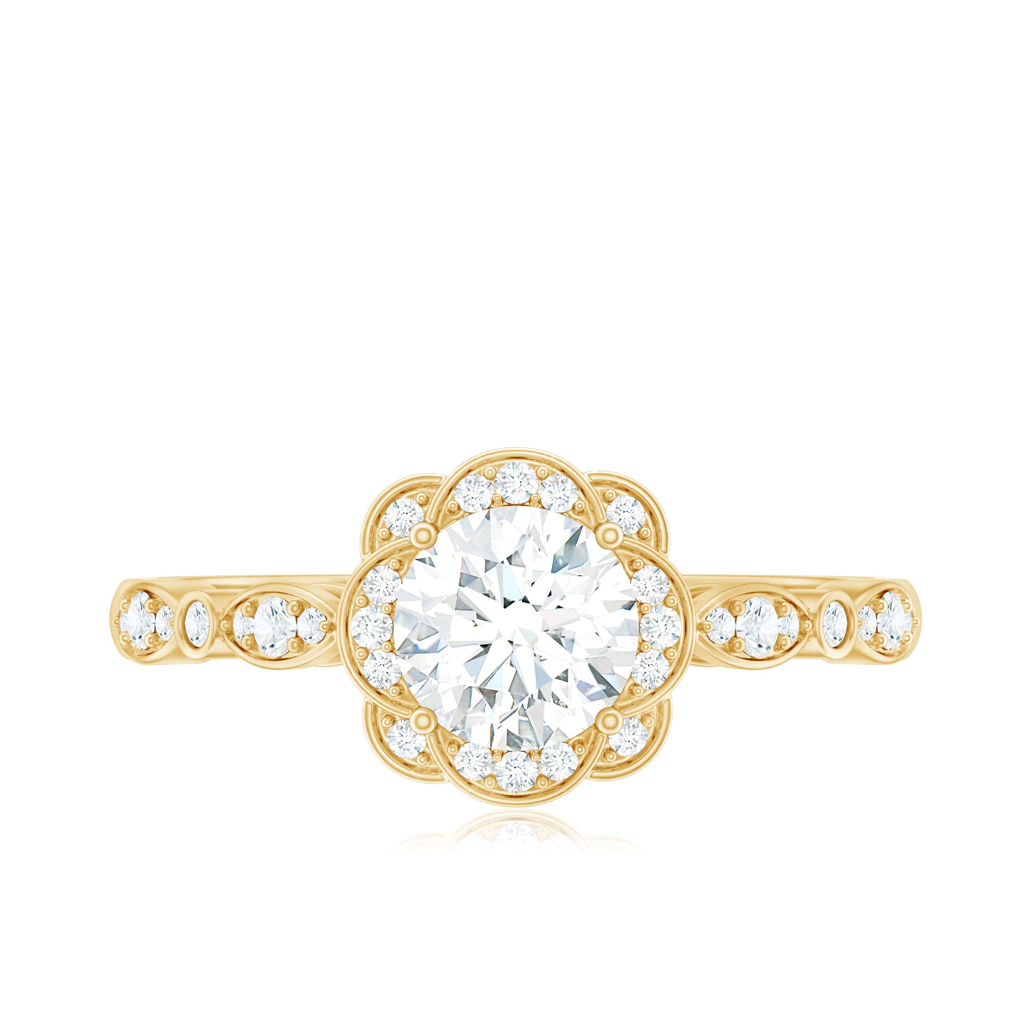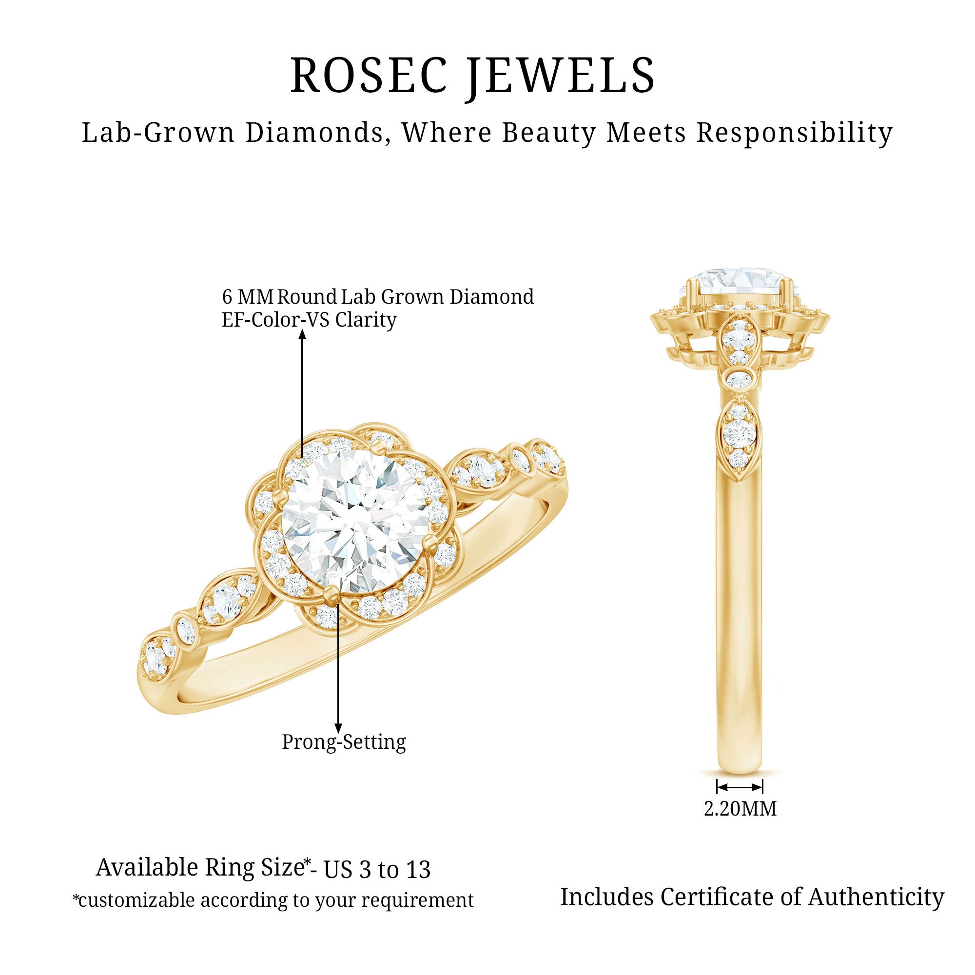Our Diamond Flower Engagement Ring is a beautiful blend of nature-inspired elegance and modern craftsmanship. This Floral Ring showcases a 6 MM round cut EF-VS quality diamond (lab grown) set in prong setting and surrounded by a floral halo of round cut gemstones. The additional diamonds are set on the scalloped pattern band, giving it a vintage-inspired look. This Diamond Ring for Women comes with a certificate of authenticity, the unique design enhances the beauty of the gemstones, creating a timeless piece that effortlessly complements any attire. This Statement Engagement Ring reflects the commitment to quality and sustainability synonymous with Rosec Jewels, making it a symbol of refined sophistication.