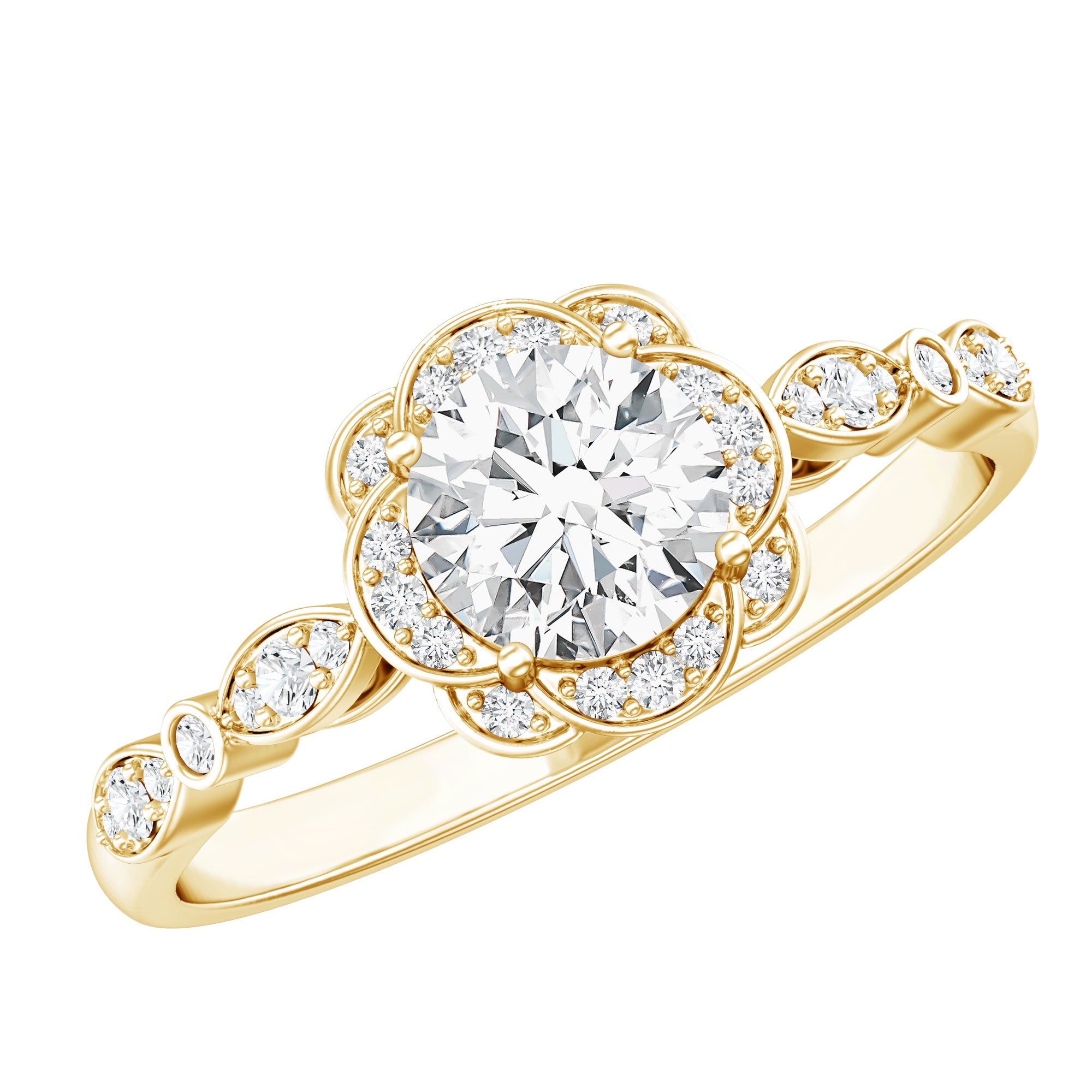Our Diamond Flower Engagement Ring is a beautiful blend of nature-inspired elegance and modern craftsmanship. This Floral Ring showcases a 6 MM round cut EF-VS quality diamond (lab grown) set in prong setting and surrounded by a floral halo of round cut gemstones. The additional diamonds are set on the scalloped pattern band, giving it a vintage-inspired look. This Diamond Ring for Women comes with a certificate of authenticity, the unique design enhances the beauty of the gemstones, creating a timeless piece that effortlessly complements any attire. This Statement Engagement Ring reflects the commitment to quality and sustainability synonymous with Rosec Jewels, making it a symbol of refined sophistication.