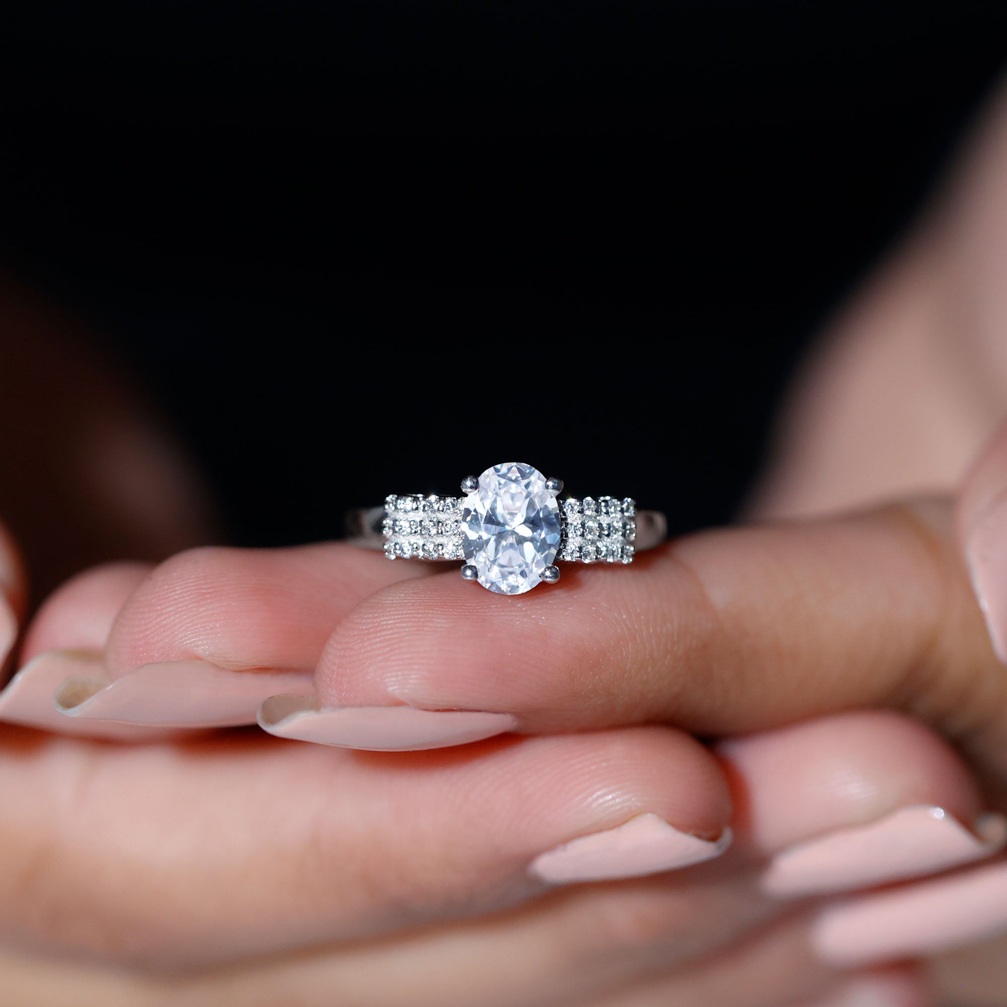 Take her heart away with the stunning details of this Solitaire Engagement Ring featuring a stunning 6X8 MM oval shaped lab grown diamond gemstone of EF-VS quality set as a centerpiece in prong setting. On either side, shimmering smaller diamonds are arranged perfectly, creating a bow like pattern. This designer Diamond Ring will surely be the right choice for her, something she will always keep close to her heart. Meticulously created by Rosec Jewels, this Oval Diamond Engagement Ring blends modern innovation with classic beauty, ensuring a unique and ethically sourced symbol of your everlasting love.