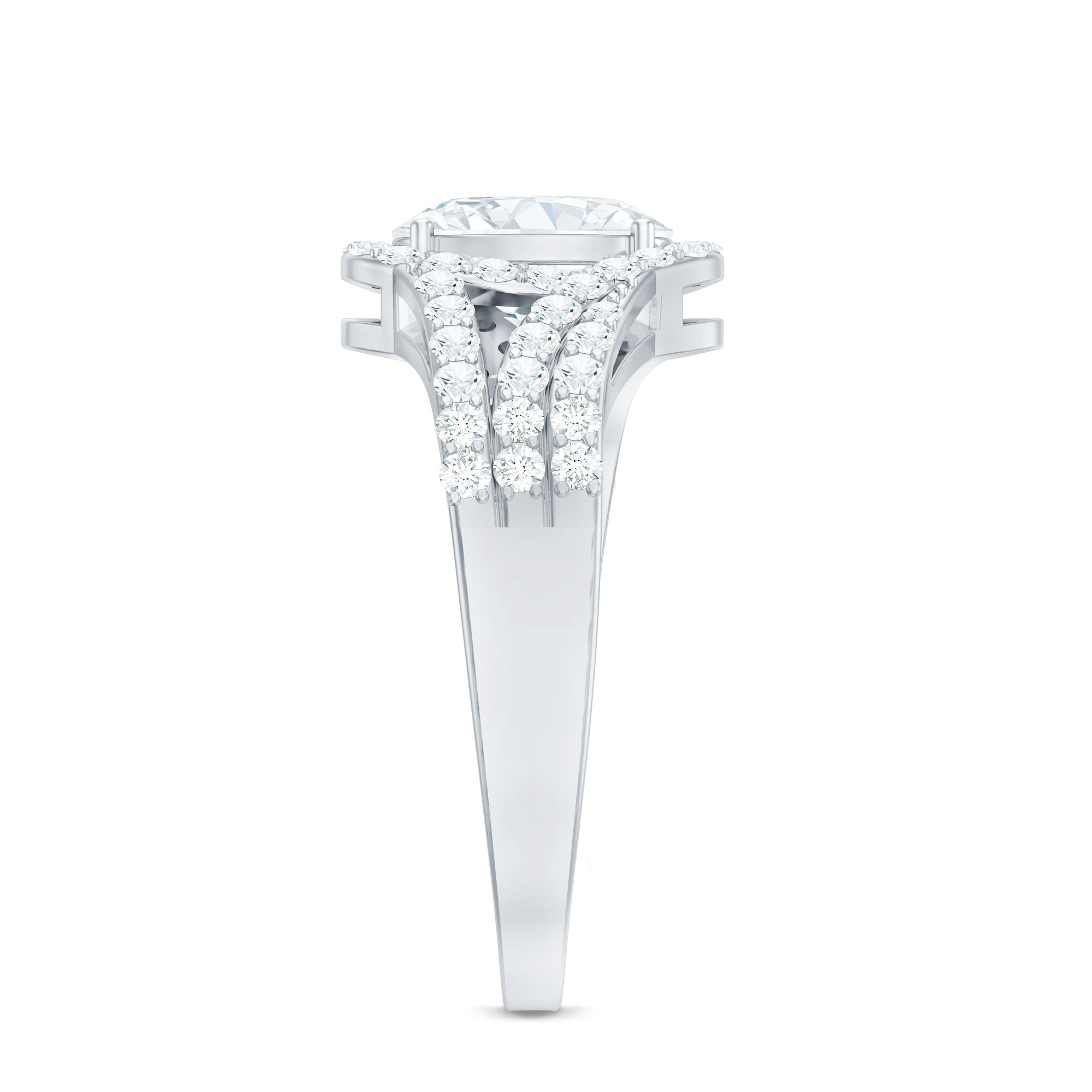 Make her heart skip a beat with the stunning craftsmanship of this Oval Diamond Engagement Ring. The center features a brilliant 6X8 MM oval shaped EF-VS quality diamond set in prong setting while the smaller diamonds line the split shank and surround the focal stone, giving this Halo Engagement Ring an eye catching look and adding the perfect sparkle. The diamonds in this Split Shank Ring are lab-grown which means they are ethically made, responsibly sourced and provide you the same sparkle and durability as the mined ones but at a more affordable price tag. Mark the moment of love with this masterpiece and let her cherish it forever.