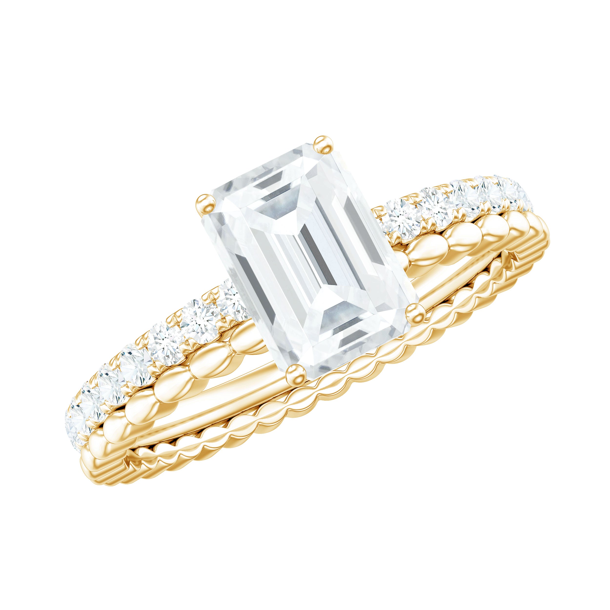 In pursuit of balance and harmony, this Moissanite Ring showcases a breathtaking timeless design among your treasures. Featuring a distinctive and captivating element, this big Engagement Ring is adorned with a 6X8 mm emerald cut Moissanite positioned at the center as a solitaire in a Prong Setting, accompanied by small round moissanite side stones aligned with a scalloped metal band. The D color VS1 clarity Moissanite enhances its brilliance, making it a remarkable addition to your wedding jewelry collection. With a finely polished appearance, this Moissanite Solitaire Engagement Ring delivers a striking statement while maintaining a subtle and delicate essence, offering the same brilliance as diamonds at an affordable price point. Its unique and intricate design renders it an ideal statement piece for special occasions. Therefore, captivate attention and shine throughout the night with its minimalist aesthetic, making it perfect for everyday wear to achieve a fashionable look.