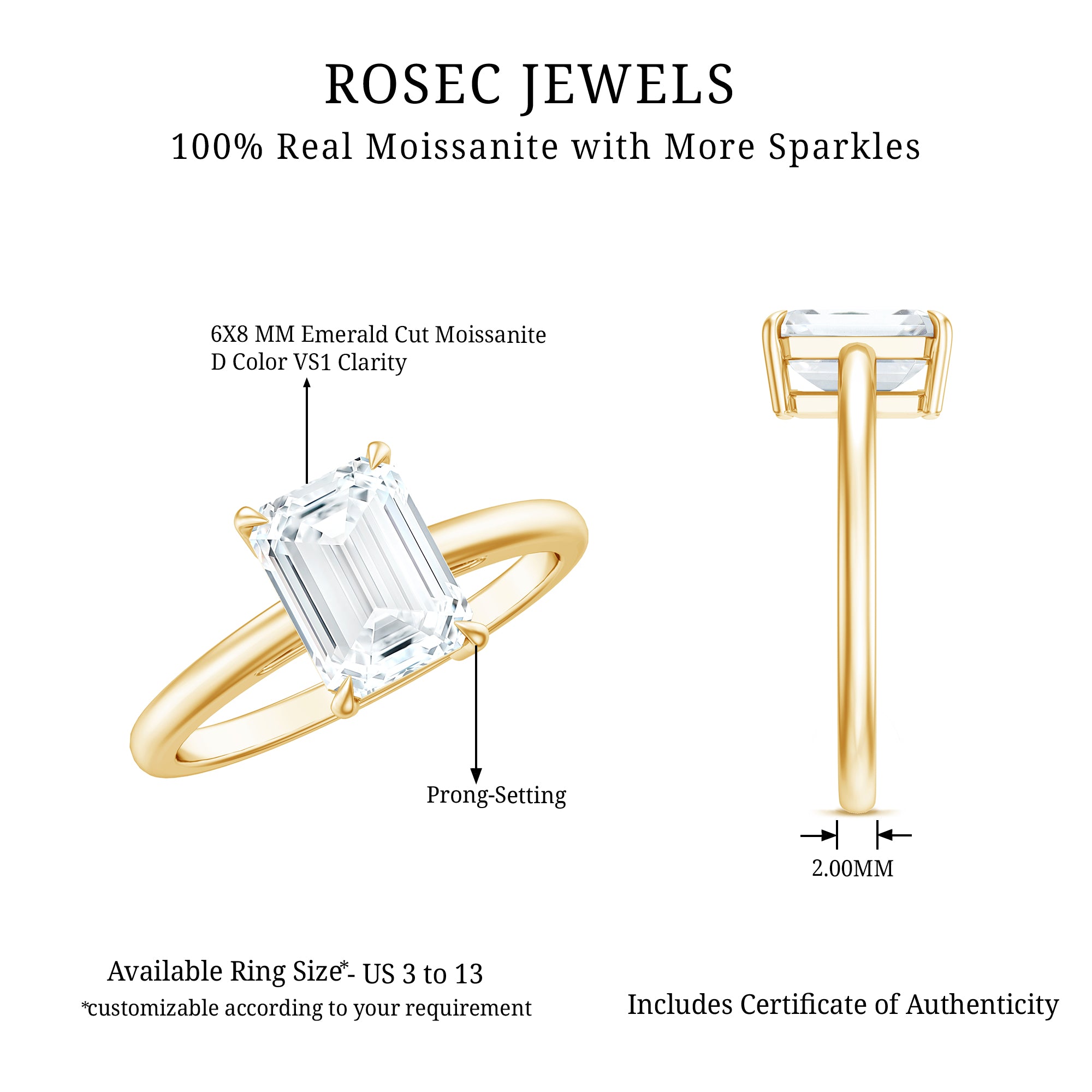 We handcrafted this 2 Carat Moissanite Ring for the one who makes your world sparkle. At the heart of the design sits a stunning 6X8 MM emerald cut Moissanite, held securely in 4-prong setting that lifts the stone, allowing light to pass through every angle. The D Color VS1 Clarity Moissanite gemstone is certified and undergoes a rigorous quality check to ensure it meets the highest standards. Absolutely breathtaking, this Solitaire Engagement Ring has a classic shape with a timeless design, creating a romantic and sophisticated look that is sure to turn heads. Unique yet evergreen, it symbolizes eternal love and commitment with a unique appeal that stands out from the crowd with a distinctive shape. You can present this as a Promise Ring, an anniversary gift, or a romantic surprise, this Moissanite Solitaire Ring beautifully marks lifes most cherished moments. We handcrafted this Solitaire Emerald Cut Ring with care and available in different metal color options. You can also select the ring size that fits you perfectly, making it easy to wear. This Low Profile Engagement Ring comes with a certificate of authenticity for gemstones and is packaged in a premium storage box.