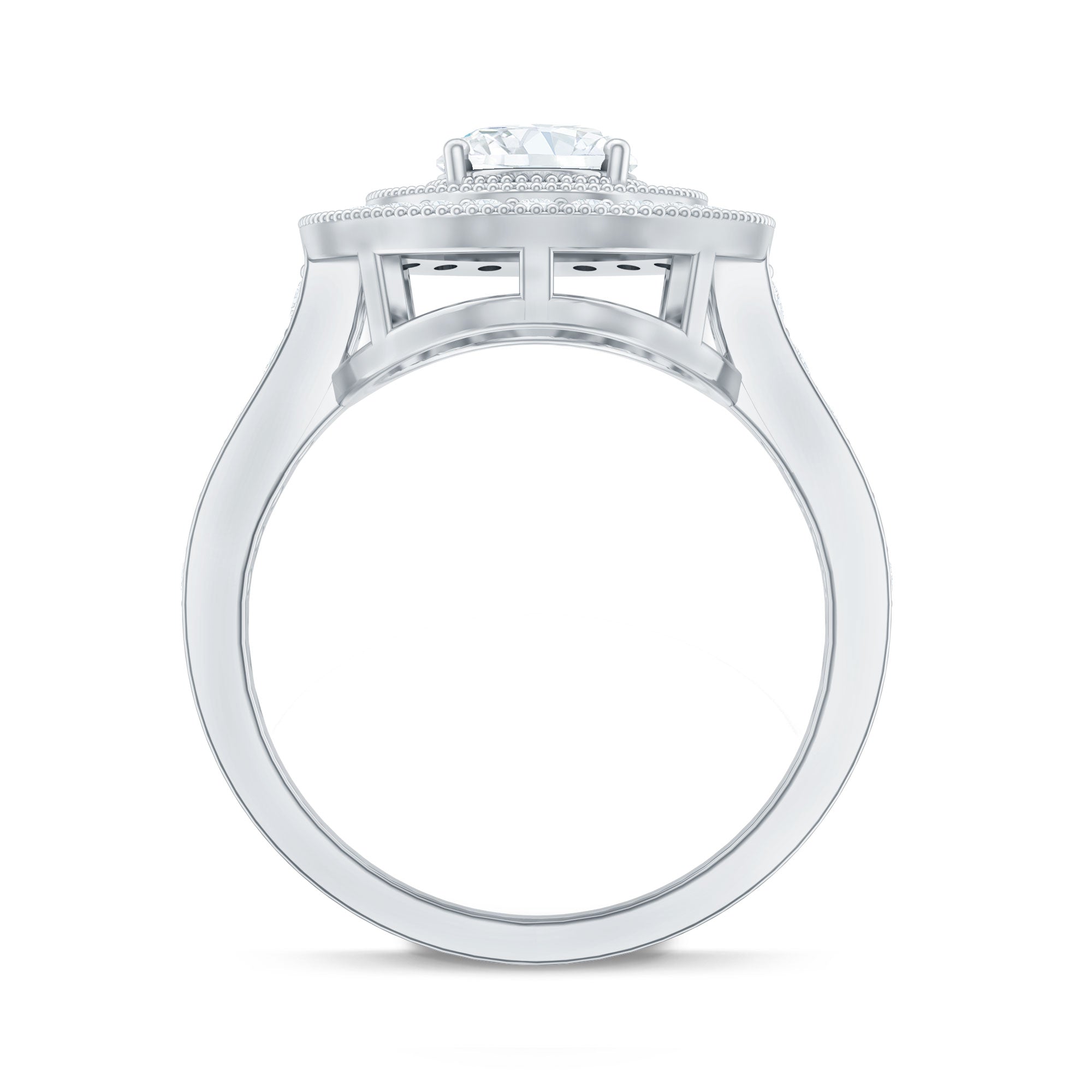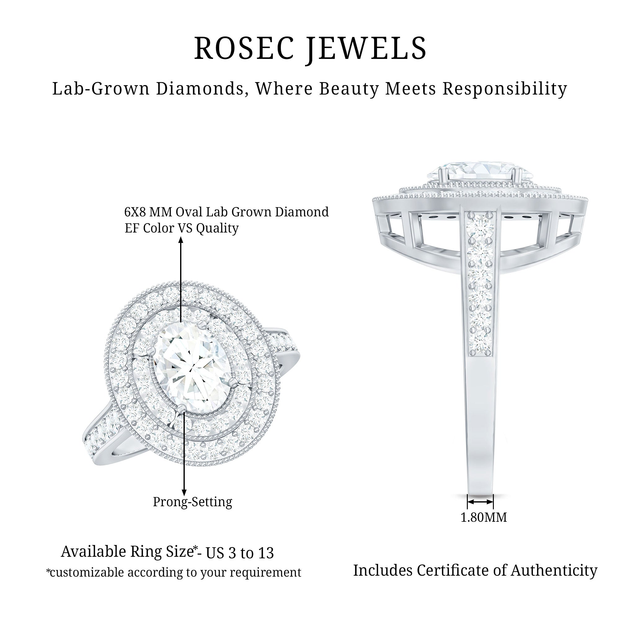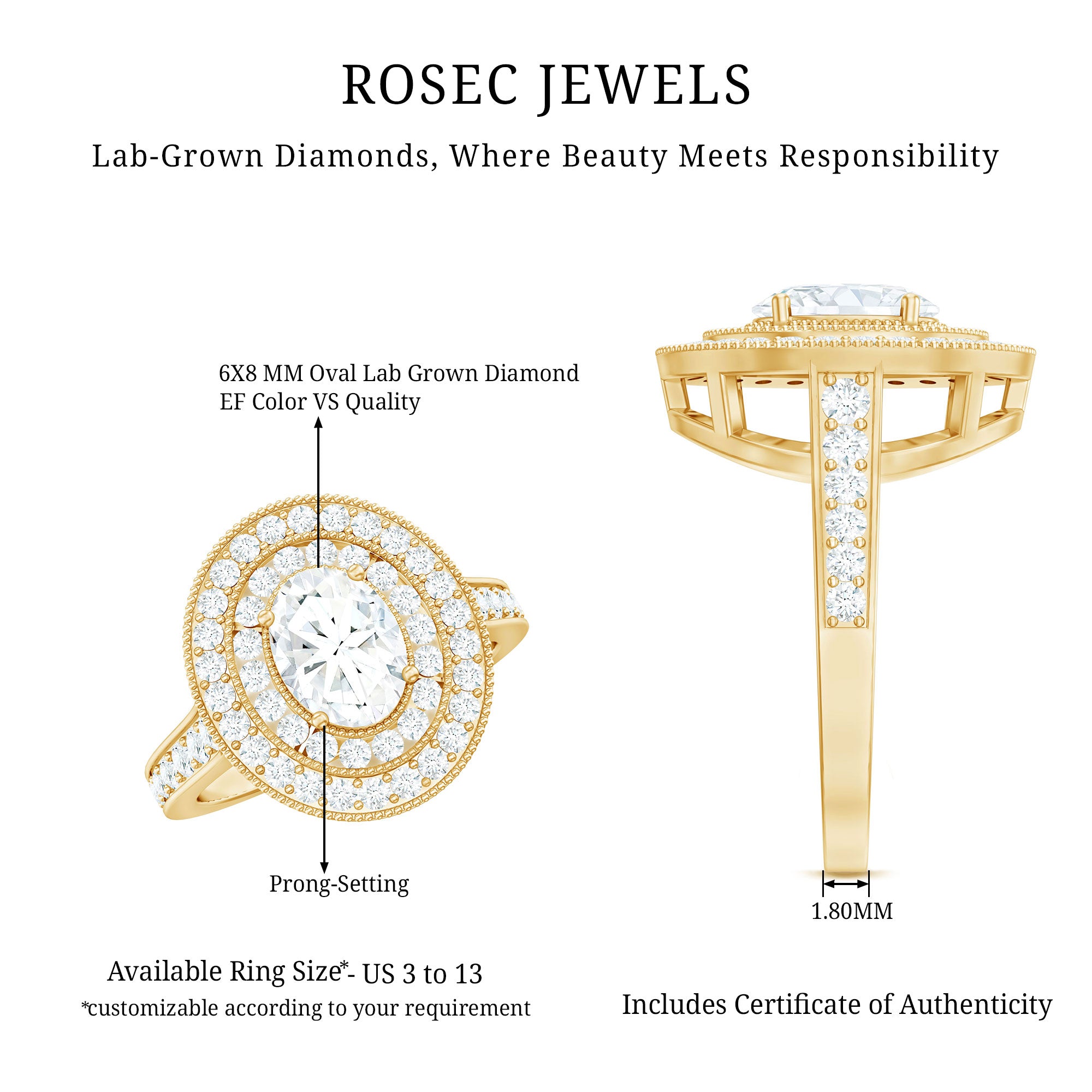 This Lab Grown Diamond Ring symbolizes eternal love with a dazzling style while bringing a touch of elegance and sparkle to the engagement day. Adorned with 6X8 MM Oval Shaped Lab Grown Diamond in Prong Setting with a Double Halo of petite round diamond gemstones. The dazzling style adorning the shank are the side stones that truly enhance its style. The maximum brilliance with a unique blend of traditional charm and modern sophistication let this Double Halo Engagement Ring catches the hearts with its classic beauty. Adorning the edges are the Round milgrain details on the Statement Diamond Ring with a classy touch that speaks about its timeless charm and elegance.