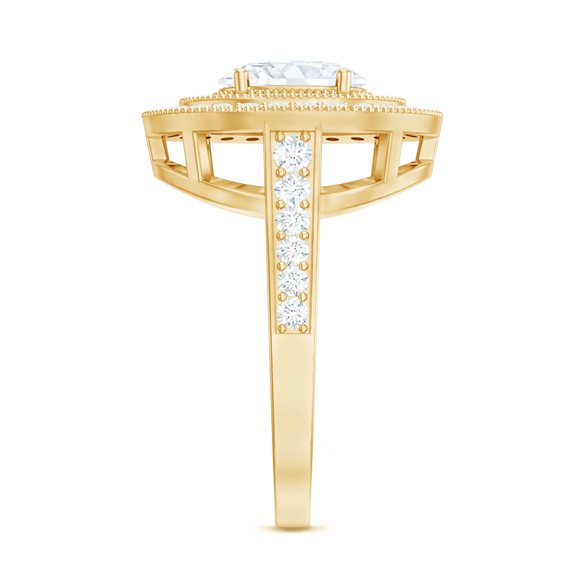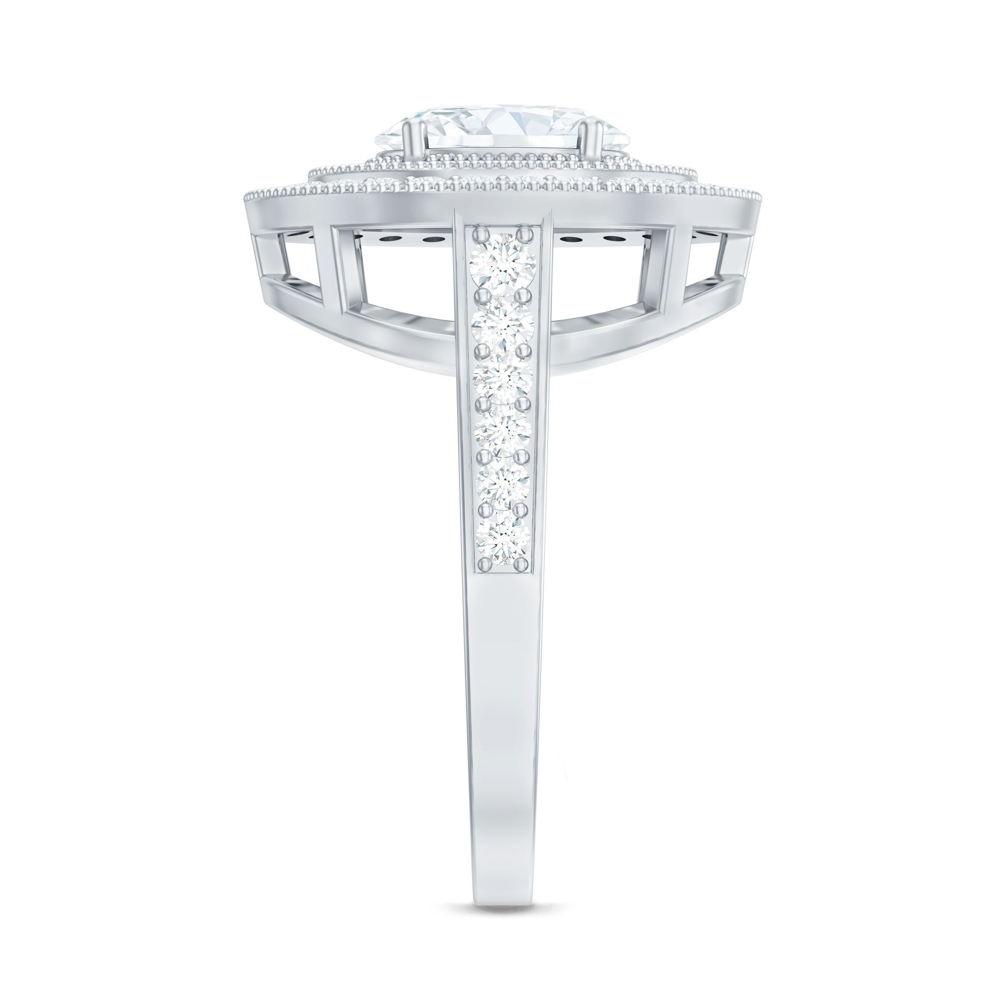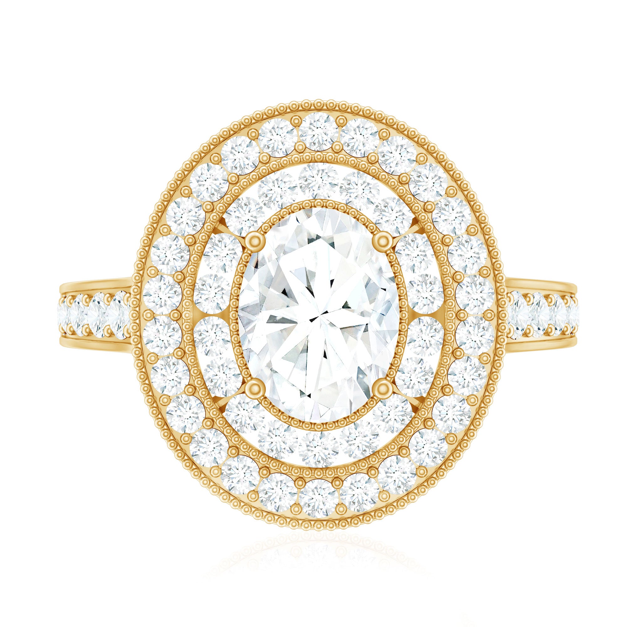 This Lab Grown Diamond Ring symbolizes eternal love with a dazzling style while bringing a touch of elegance and sparkle to the engagement day. Adorned with 6X8 MM Oval Shaped Lab Grown Diamond in Prong Setting with a Double Halo of petite round diamond gemstones. The dazzling style adorning the shank are the side stones that truly enhance its style. The maximum brilliance with a unique blend of traditional charm and modern sophistication let this Double Halo Engagement Ring catches the hearts with its classic beauty. Adorning the edges are the Round milgrain details on the Statement Diamond Ring with a classy touch that speaks about its timeless charm and elegance.